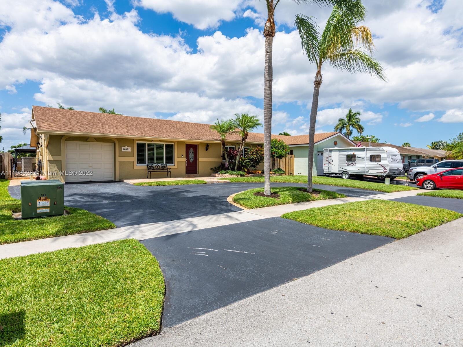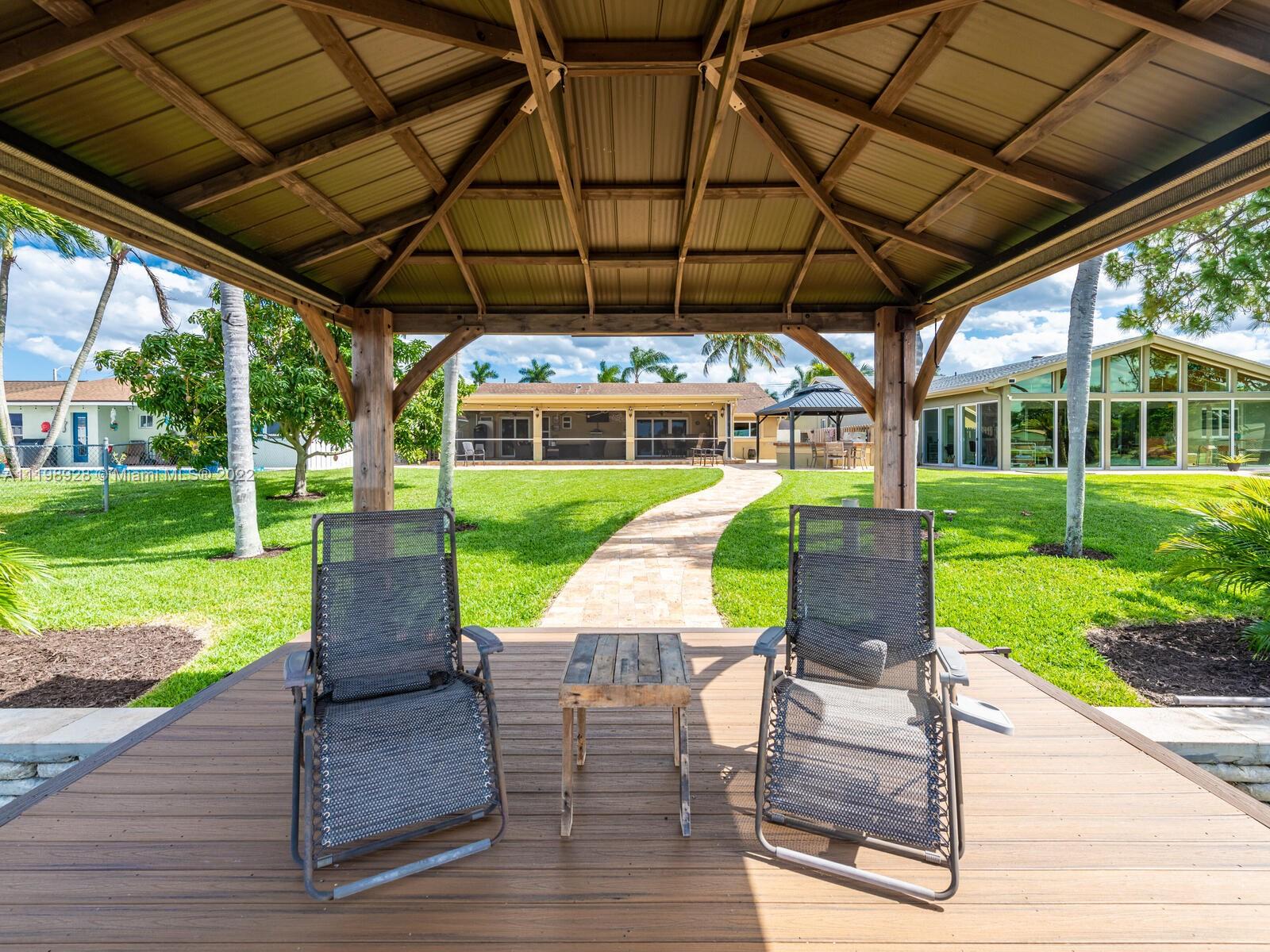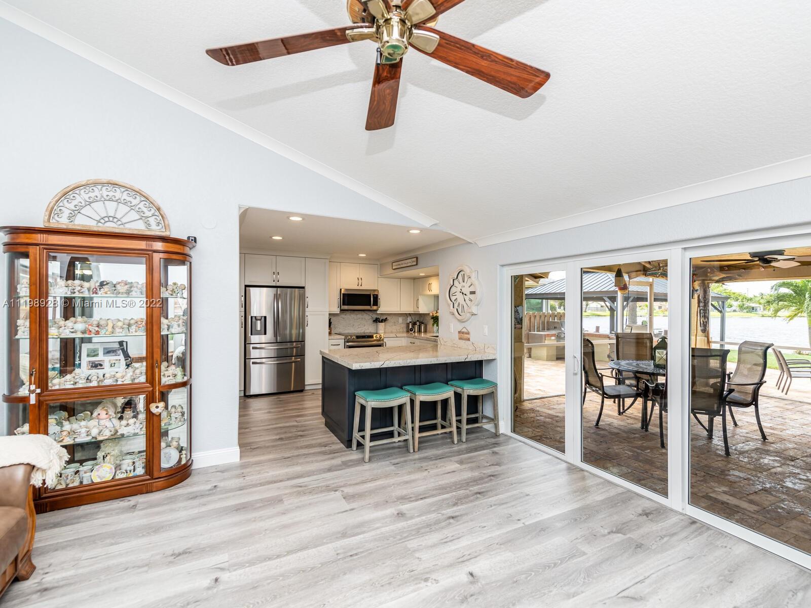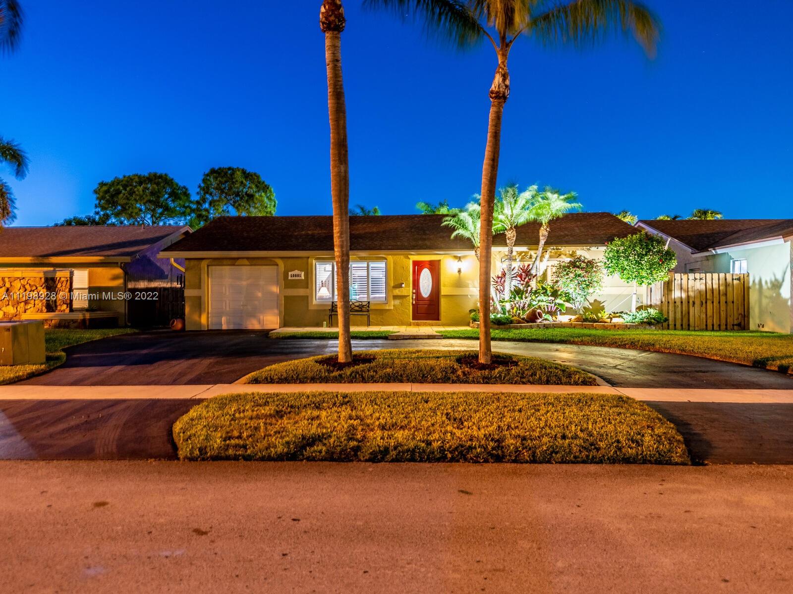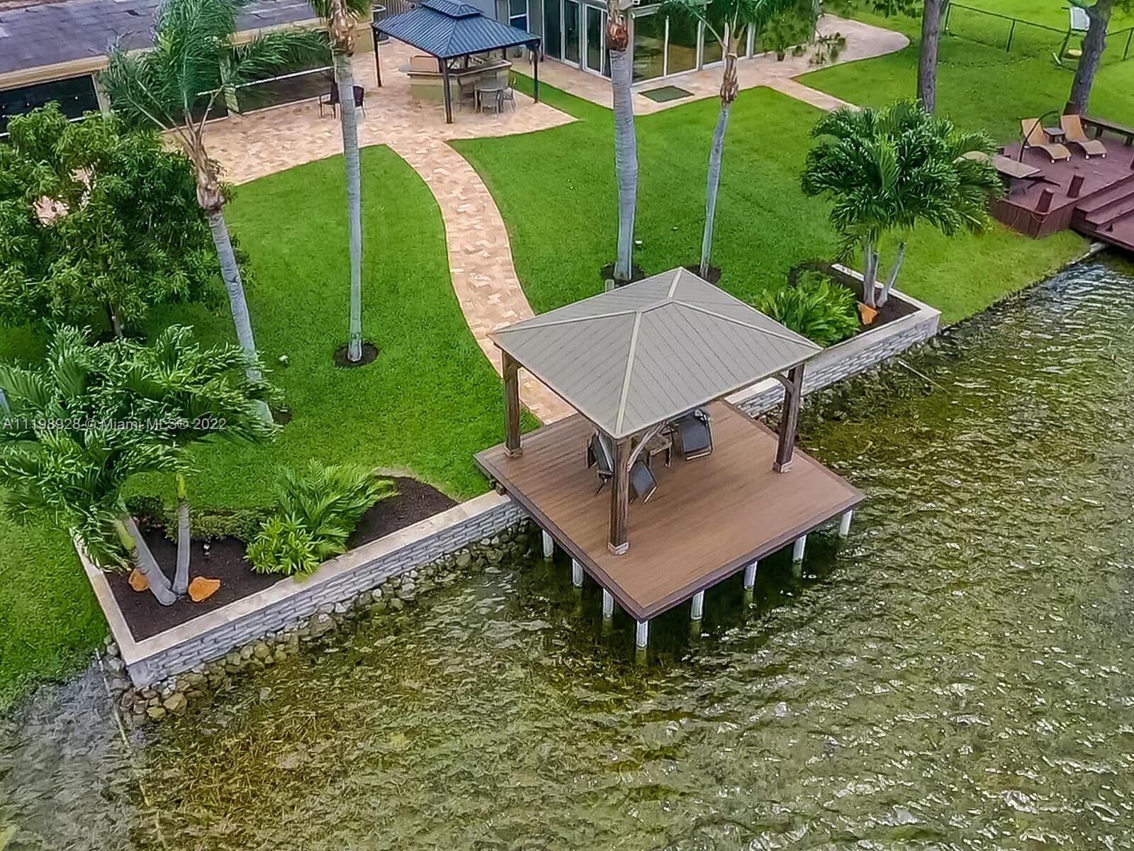 Indulgent tropical paradise from the moment you step out of the back doors leading to an enclosed & covered 20x80' travertine patio, just outside that you will find the outdoor kitchen & shed. The yard has a mature mango tree, sprawling palms, & massive lake view with 80' water frontage. Extended yard leads to a custom dock with pavilion & sunshade. The home has been immaculately maintained & extensively updated with all impact windows and doors (including the garage) & a newly upgraded kitchen, including spotless Samsung appliances & a/c unit all about a year and 1/2 new. You'll enjoy the customs closets, updated guest bath, & high end laminate flooring in most of the main area. You can see the pride in ownership reflected throughout this highly sought after lakefront home in Sunrise!!!