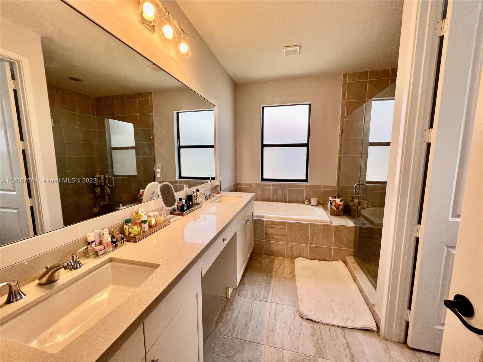 This beautifully upgraded 3 bedroom with 2 1/2 bathroom is a must see. Enjoy the open floor plan with crown moldings and high ceilings, 24 x 24 porcelain tile in the first floor, and impact windows/sliders throughout. The kitchen has custom cabinetry with stainless steel appliances, granite countertops and marble backsplash. The stairs, second floor and master bedroom have high-end laminate flooring with carpeting in the 2nd and 3rd bedrooms. Large loft area can be converted into 4th bedroom. The backyard is completely fenced in with greenery for privacy. Spacious patio has extended paver area for entertaining. Bonterra is a gated community with 24 hour security and amenities including pool, playground, gym and clubhouse. Easy access to I-75, Turnpike and Palmetto expressway.