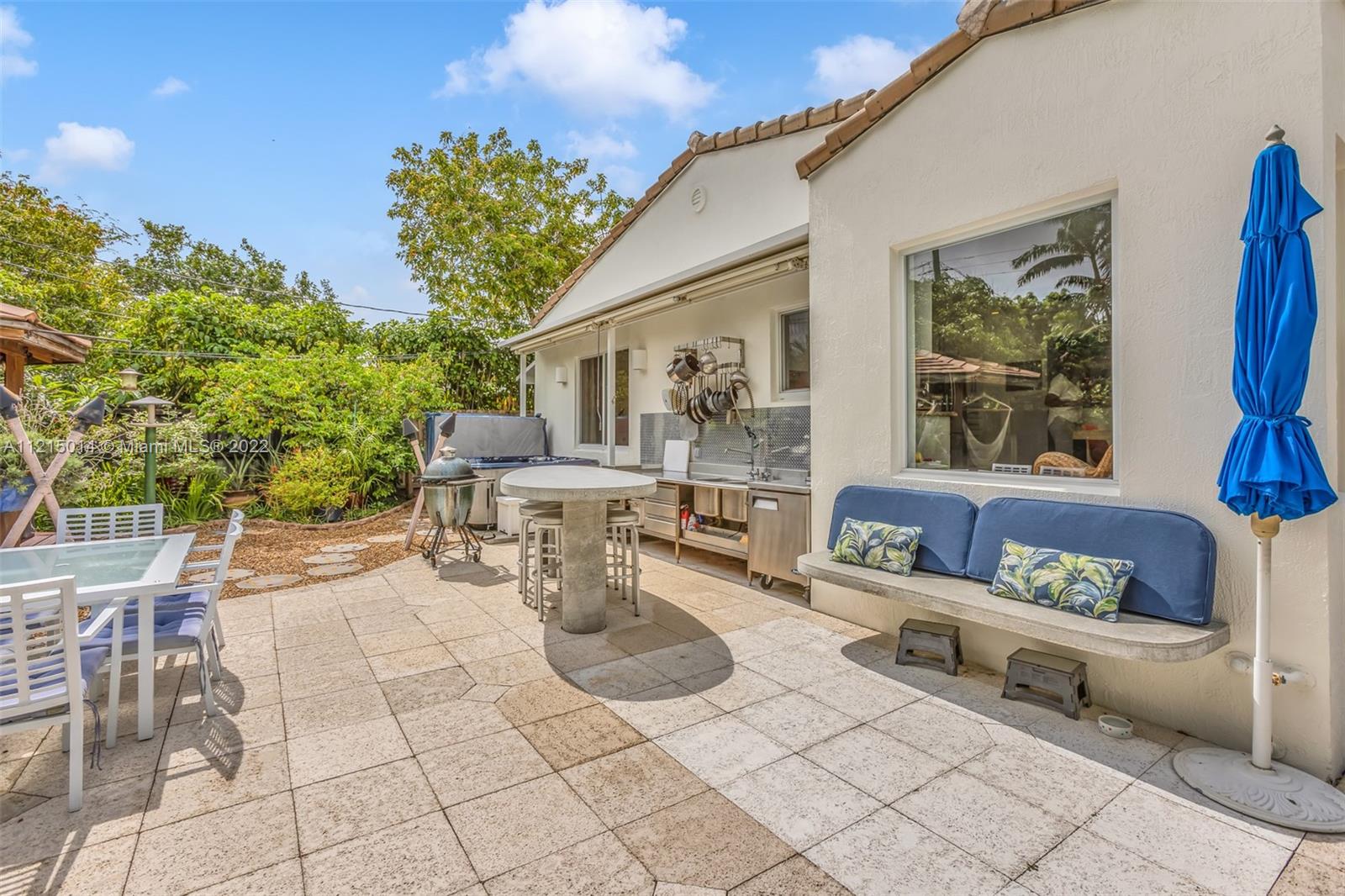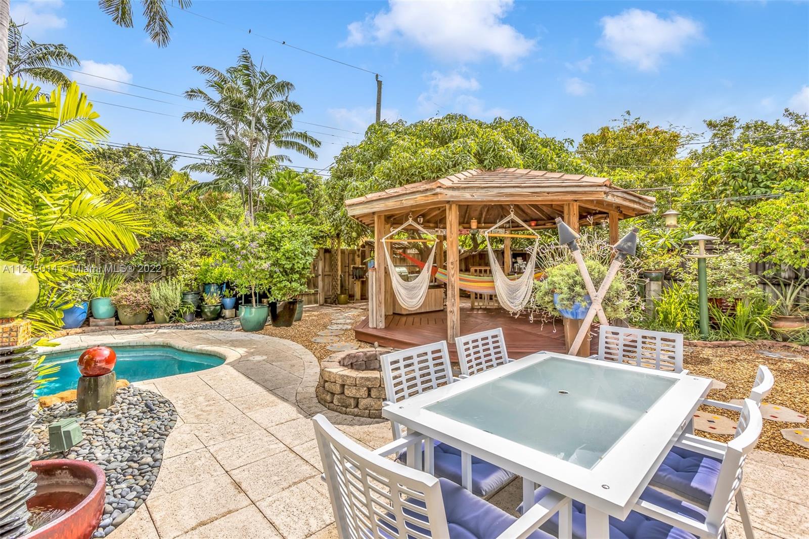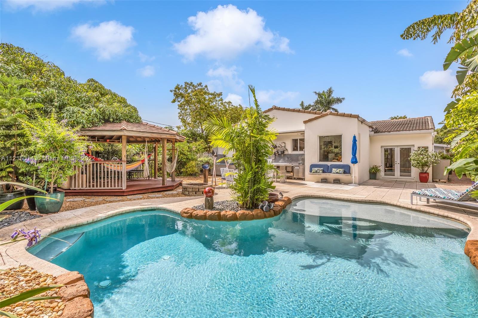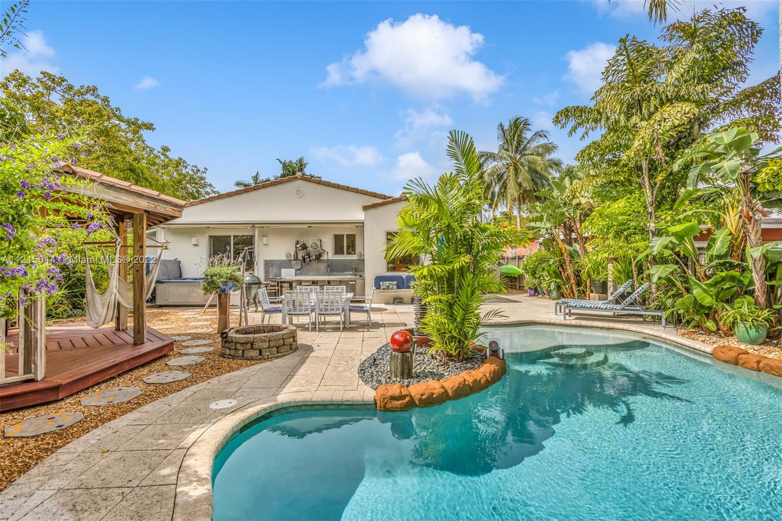 Tastefully upgraded 3 bedroom 2 full bathroom house with ton of unique features. Impact Grade windows, extra closets and custom cabinets. Upgraded kitchen with 42" cabinets, Gas range and lots of counter space for the chef of the house. Master bedroom features two walk-in closets, large custom built shower and Sauna. The entry closet can be used as an office or playroom. Resort style backyard with salt water system pool, tropical landscaping, summer kitchen, fruit trees, Custom Gazebo. Fully fenced yard with a very private and tranquil setting. NO HOA, Walking distance to Temple Beth El. Only a bike ride away from the beach, Aventura Mall and Gulf Stream. Per seller actual living area is 2100 sqft.