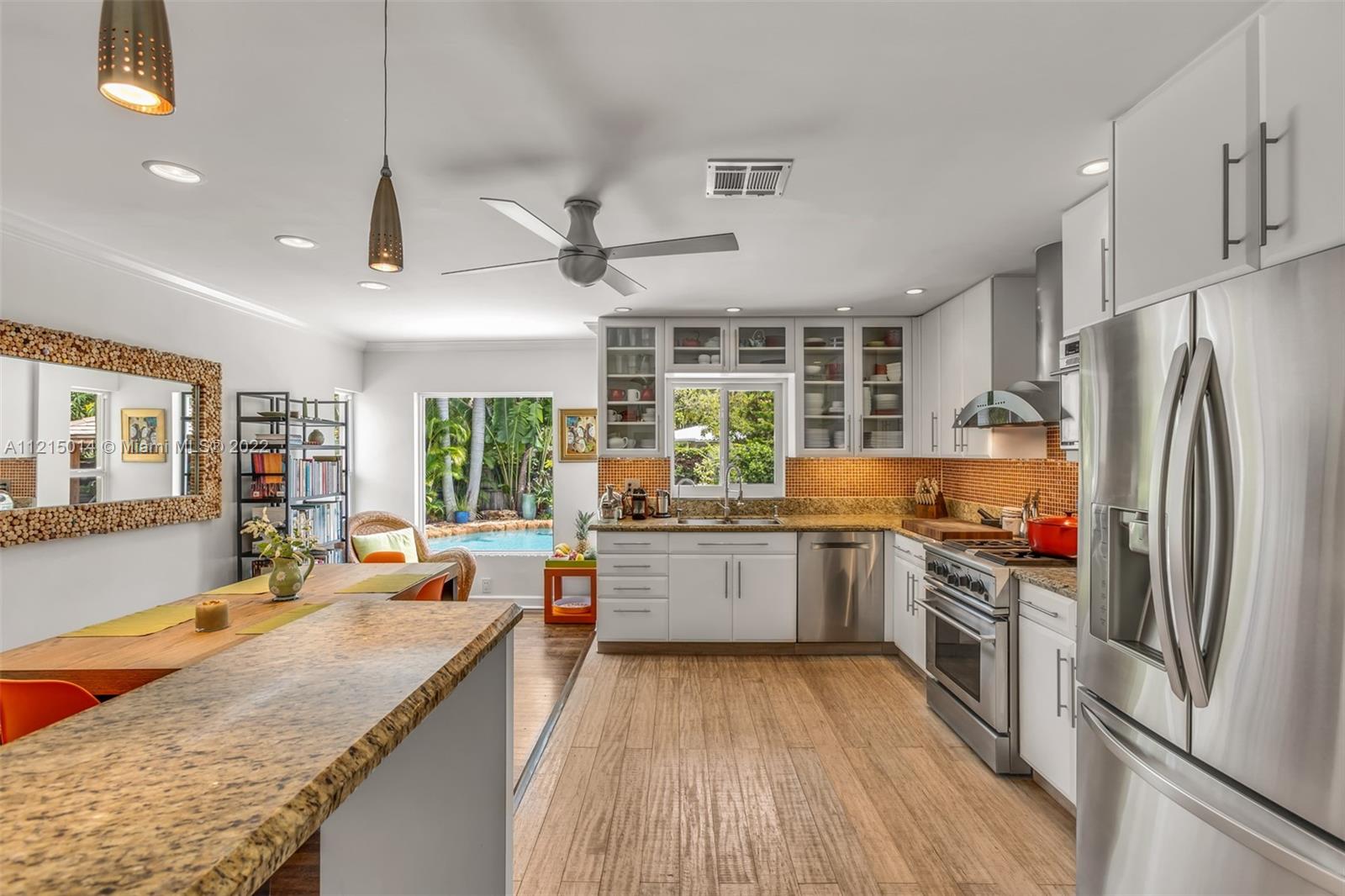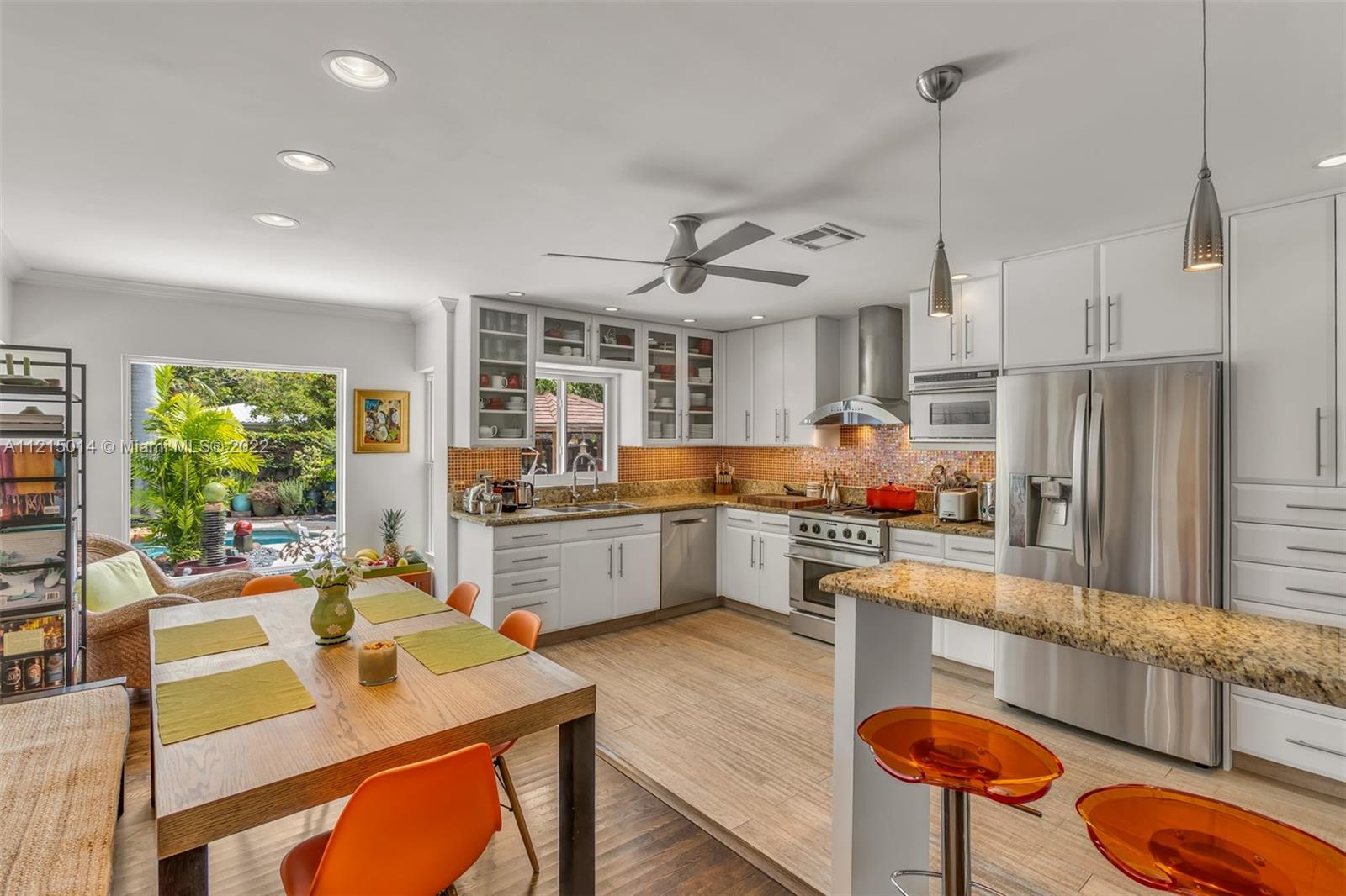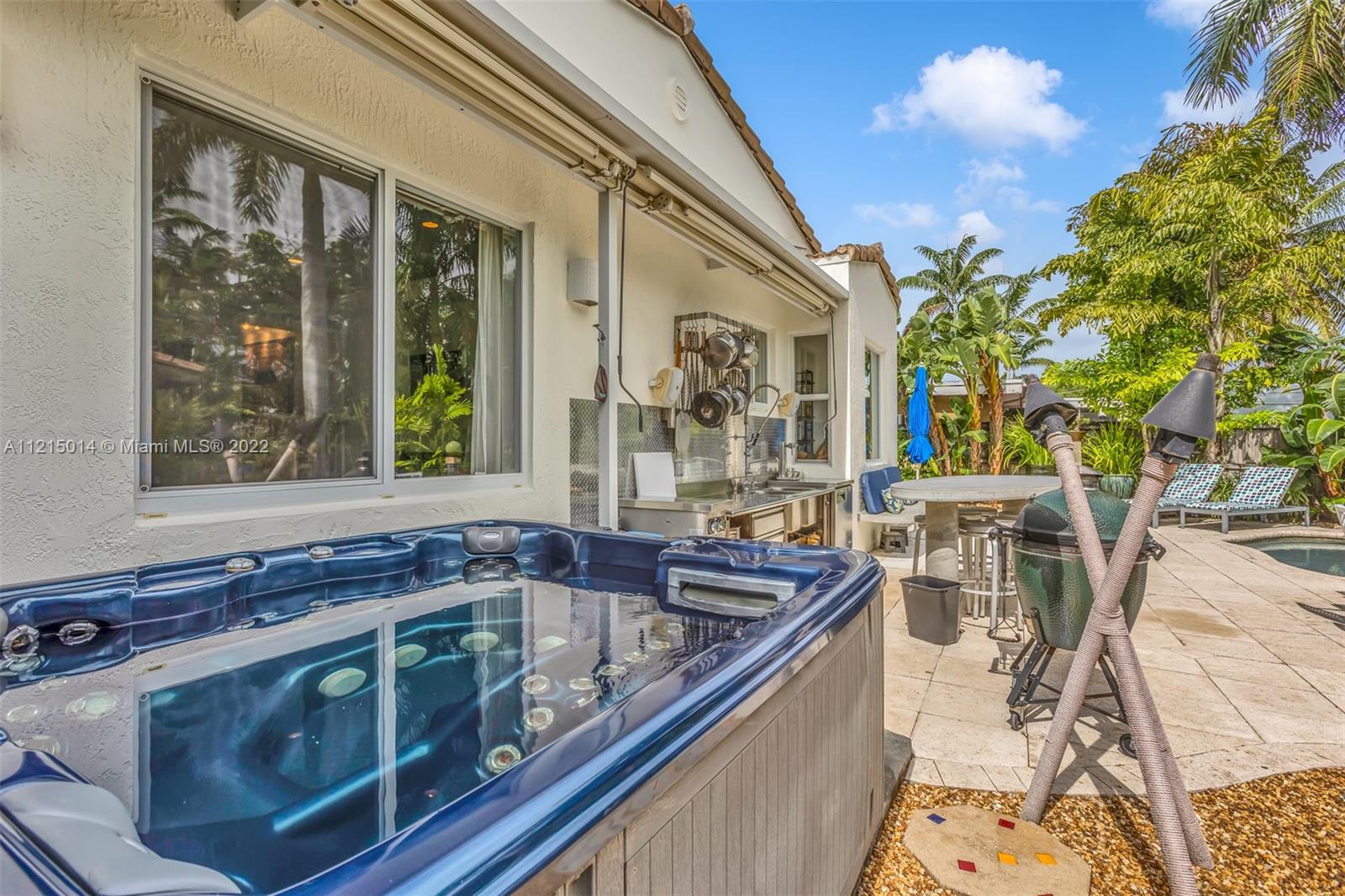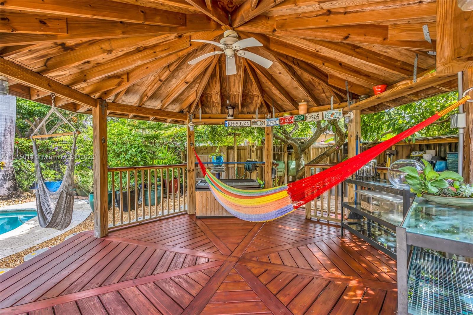 Tastefully upgraded 3 bedroom 2 full bathroom house with ton of unique features. Impact Grade windows, extra closets and custom cabinets. Upgraded kitchen with 42" cabinets, Gas range and lots of counter space for the chef of the house. Master bedroom features two walk-in closets, large custom built shower and Sauna. The entry closet can be used as an office or playroom. Resort style backyard with salt water system pool, tropical landscaping, summer kitchen, fruit trees, Custom Gazebo. Fully fenced yard with a very private and tranquil setting. NO HOA, Walking distance to Temple Beth El. Only a bike ride away from the beach, Aventura Mall and Gulf Stream. Per seller actual living area is 2100 sqft.