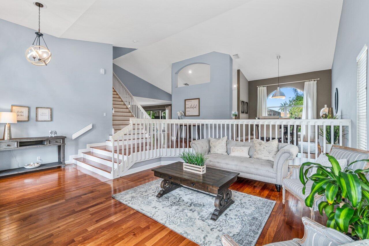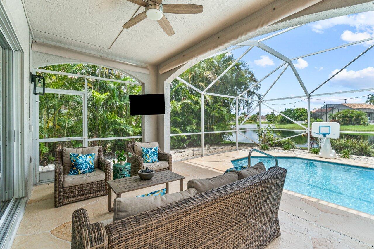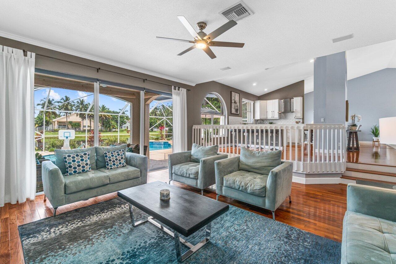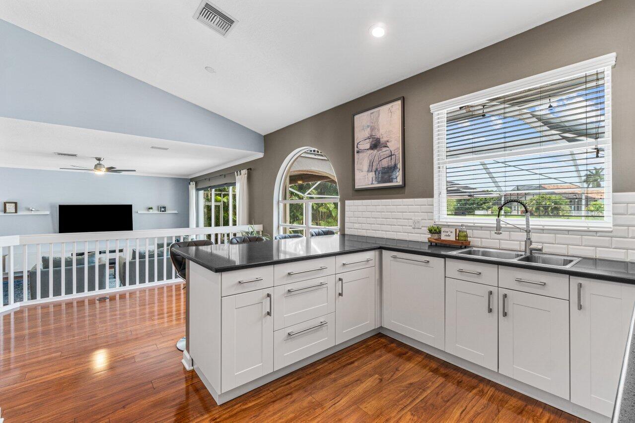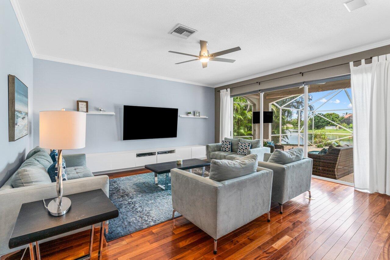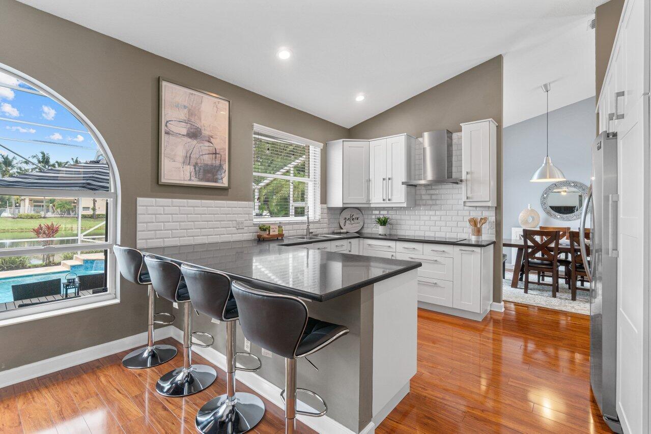 Welcome home to this stunning 4/3 single family pool home on the lake in beautiful Boca Isles South. This remodeled home has ALL the bells and whistles. Features include a fabulous updated kitchen w/ white cabinets, quartz countertops, and stainless steel appliances, updated bathrooms, 2017 roof, accordion shutters throughout, two newer a/c's (2015 and 2021), hardwood & laminate flooring, high end fixtures & fans, beautiful landscape lighting, & the list goes on. This immaculate home has a lovely open floorplan w/ 1 full bedroom & bathroom on the first floor & three bedrooms including the master suite (with its own private balcony) upstairs. Enjoy the beautiful sunsets by your private screened in pool overlooking the lake. Boca Isles South is a 24/7 gated community w/ fabulous amenities.