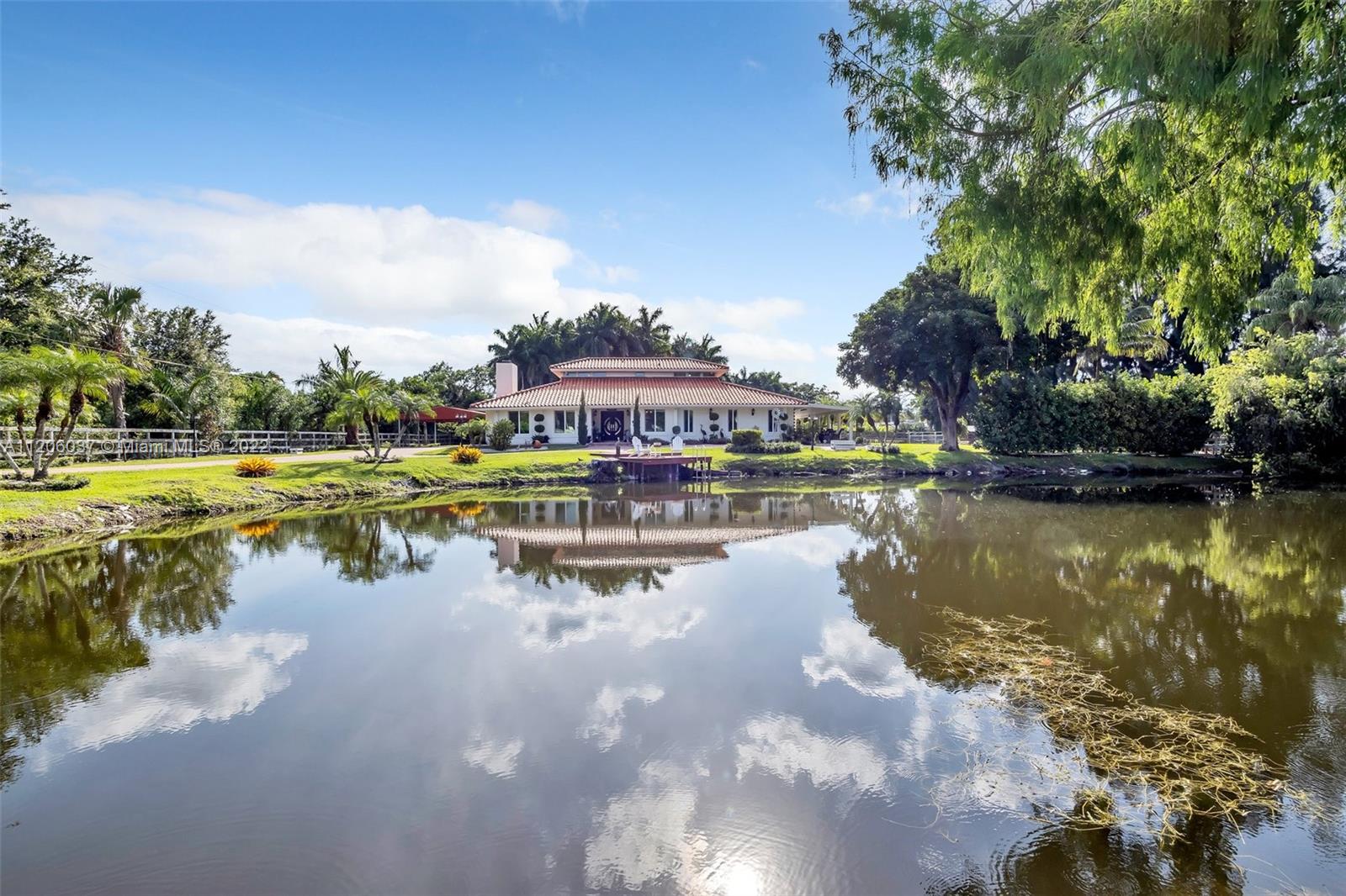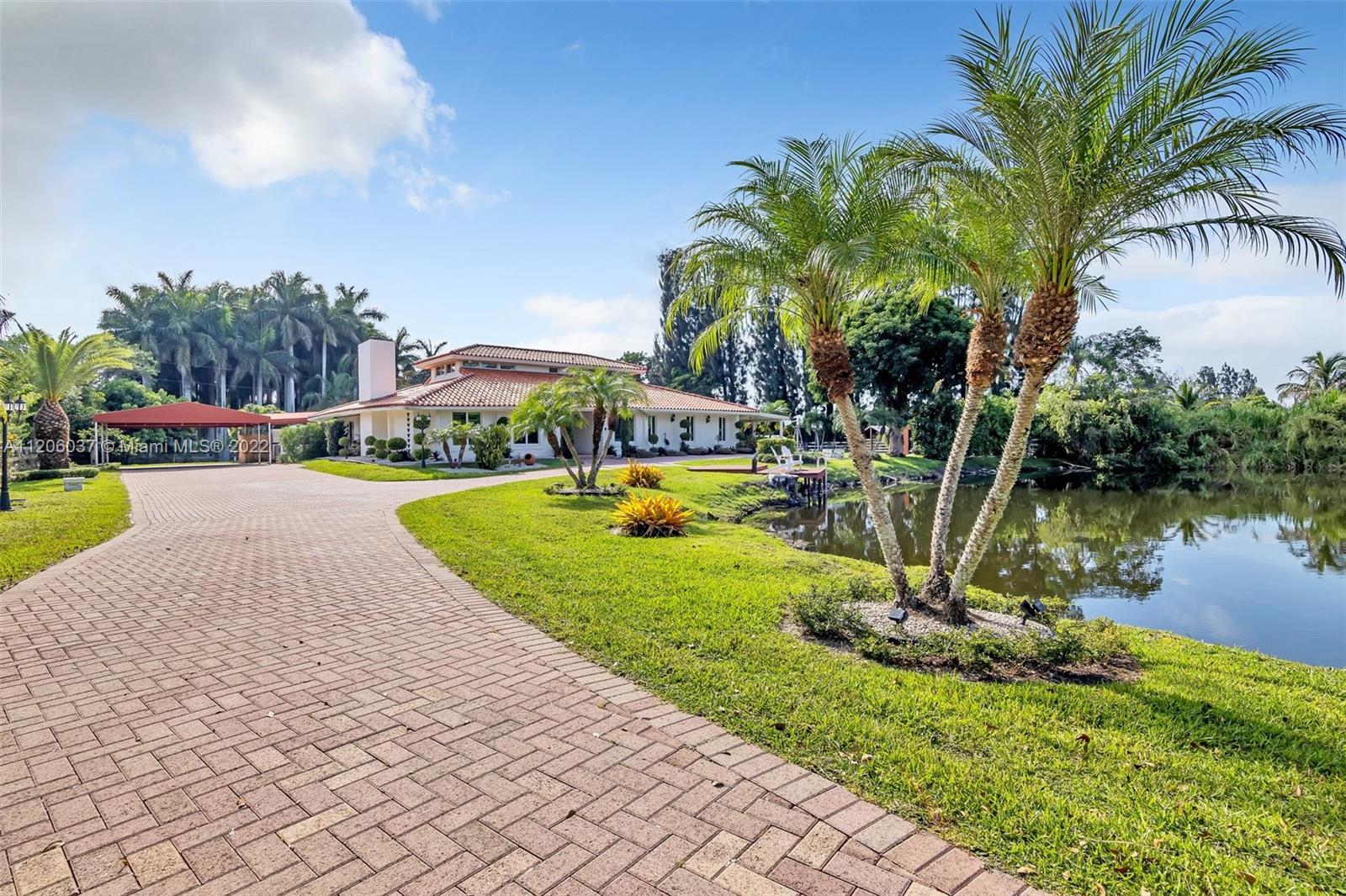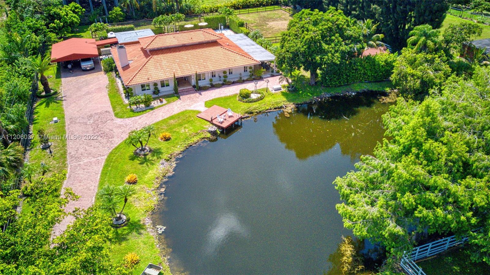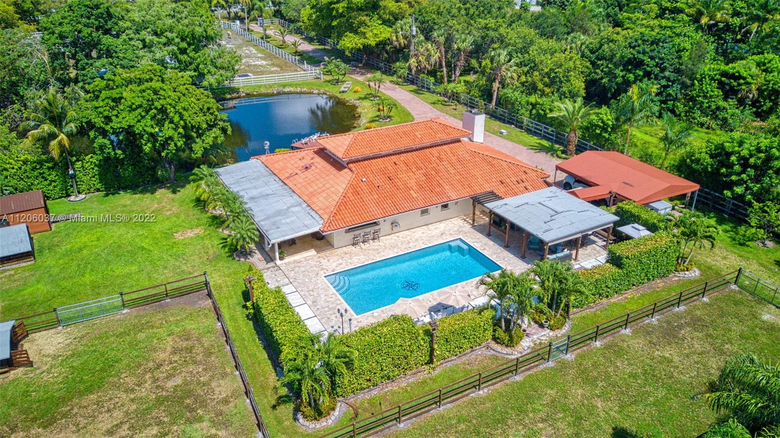 Exquisite Tropical Paradise situated on 2.5 acres with lake in the Country Club Ranches Community, Miramar. Gated secluded pool home offers perfect living space & combines city & country lifestyles.Perfect for Horse Lovers or family looking for a lot of open space. Features 5 bedrooms & 4 bathrooms + den. 2 primary suites on 1st floor,updated eat in kitchen,granite counter top & stainless-steel appliances overlooking beautiful open pool area, gazebo & bar great for gathering & entertaining,dining room, living room with a Chicago brick chimney,spacious Florida Room + full cabana bathroom,impact windows & door, large covered porch,oversized carport,long paver driveway,fully fenced,professional landscaping,private well w/new water filtration system,generator,2 horse stalls stable & much more!
