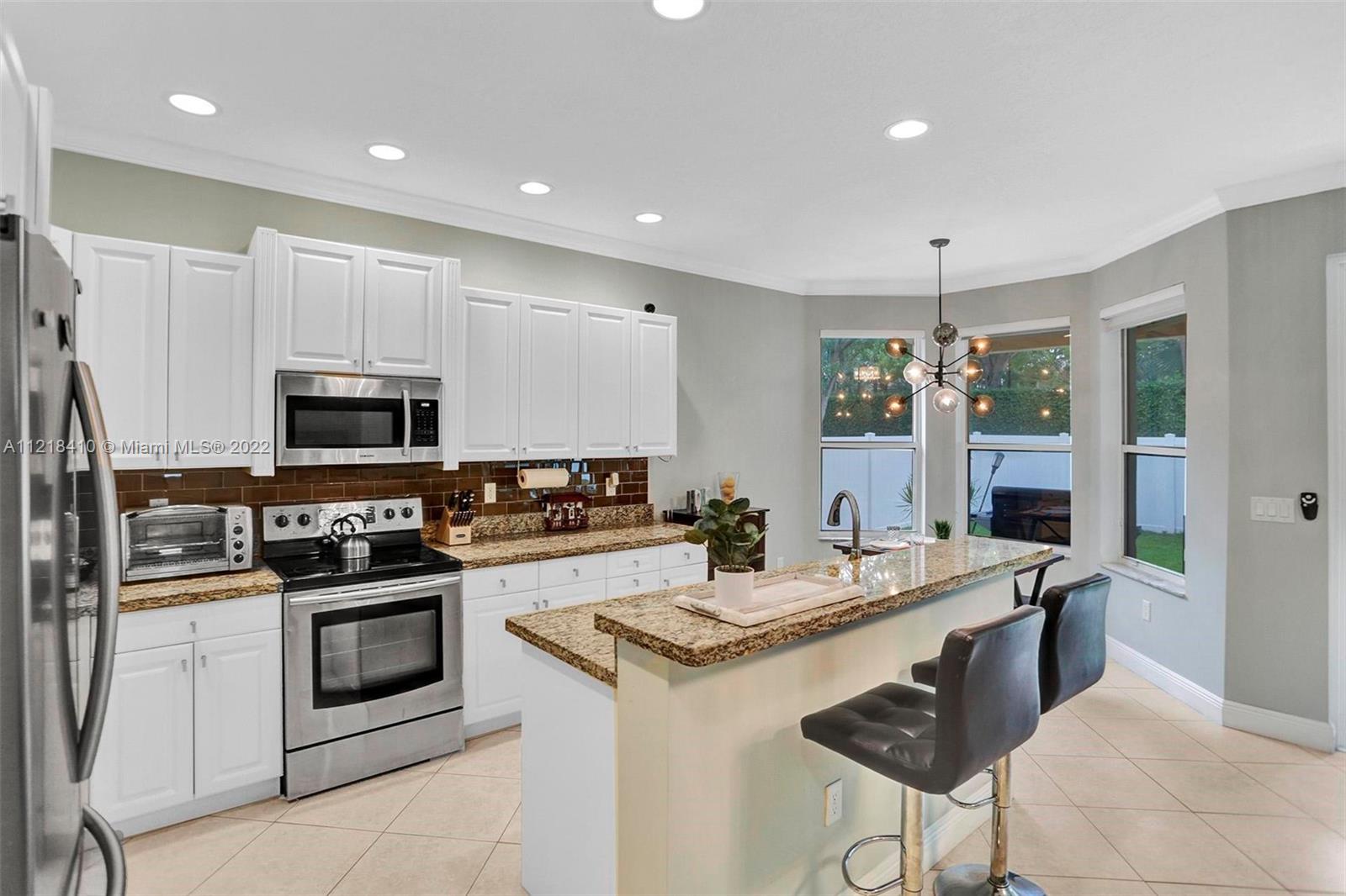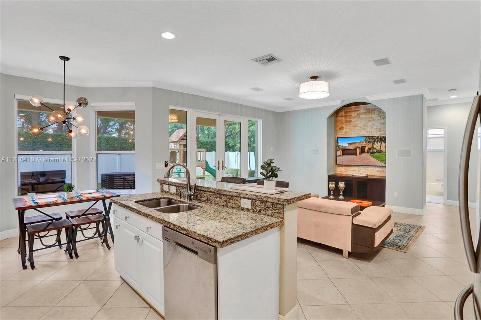 For Rent & For Sale: Riviera Isles 5 BD | 3 BA 2-story home w/ 2 car garage will not last. This community offers everything plus more! 1 full bedroom & bathroom is located downstairs. The kitchen is fully upgraded w/ granite countertops & S/S Appliances. Study area for small office or kids to work off of, plus eat-in kitchen. Island provide ample space for high-top chairs. Impact windows and accordion shutters. Formal living room & Dining room. Family room is off set to kitchen w/ built-in tv. All bathrooms are fully renovated w/ granite countertops and upgraded sinks. Upstairs provides access to the primary bedroom, plus the other 4 spacious bedrooms. Closet feature built in cabinets. Relax outside in the all around fence backyard with playground. All smart home items do convey.