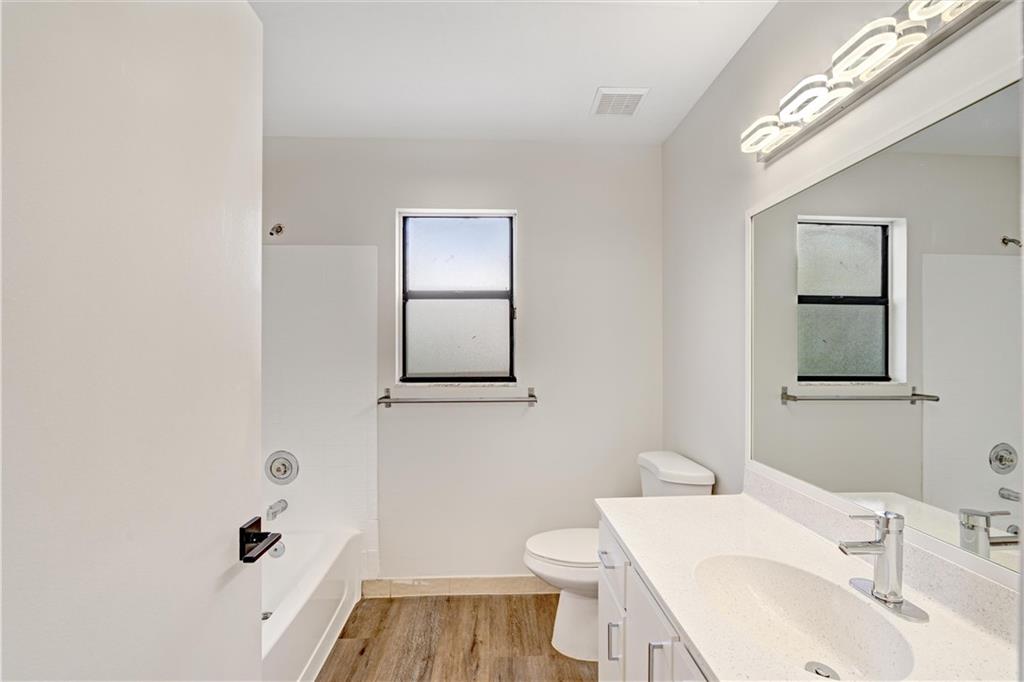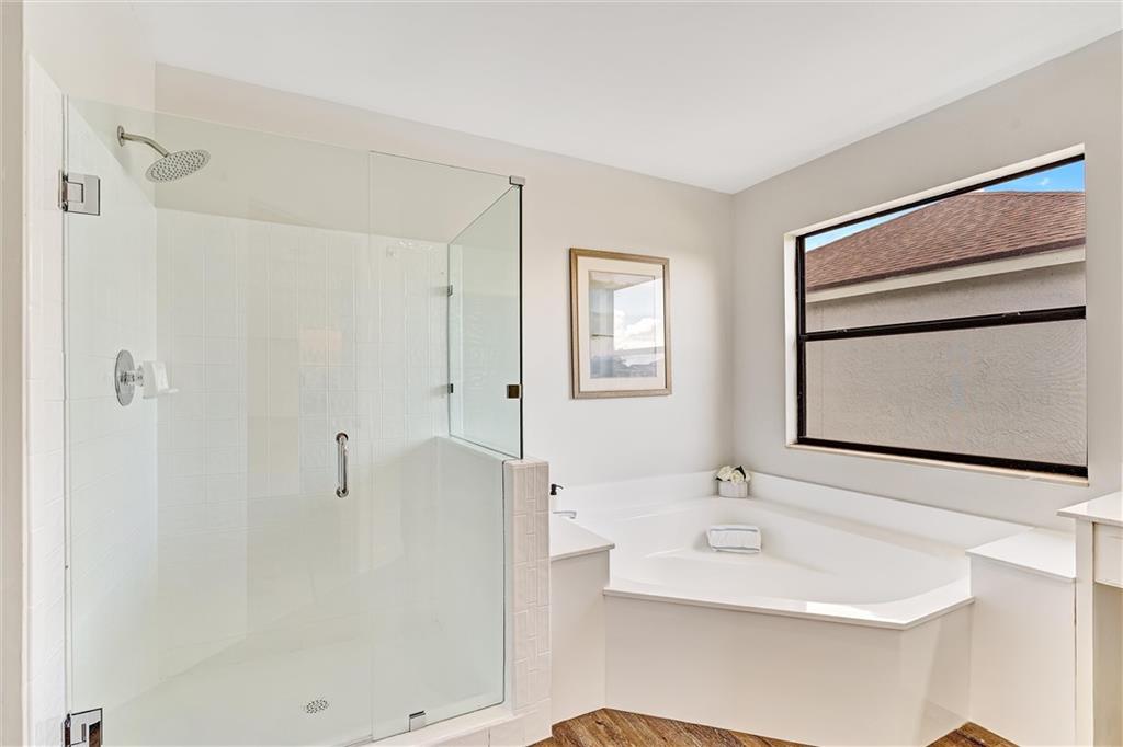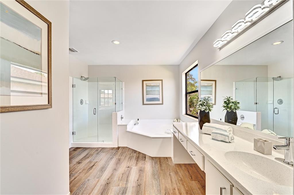 Multiple offer situation highest and best!Drop dead gorgeous remodeled 4 bedroom 3 bathroom home. No expense spared with New LVP Wood flooring throughout and brand new high end carpeting upstairs.All bathrooms are remodeled and master bathroom features a new frameless shower. Brand new paint inside and out, Solid wood white shaker cabinetry, brand new top of the line stainless appliances, calacutta quartz marble counters, designer finishes throughout including all new cabinetry hardware, door hardware, lights, fans, switches, outlets...The list of upgrades is endless. The exterior of the home has been upgraded with a fully fenced yard, mature landscaping, huge 14' x 50' covered lanaii opens to a large paver patio. Great home for entertaining. Huge lot, NEIGHBORHOOD POOL, TENNIS ETC...!!
