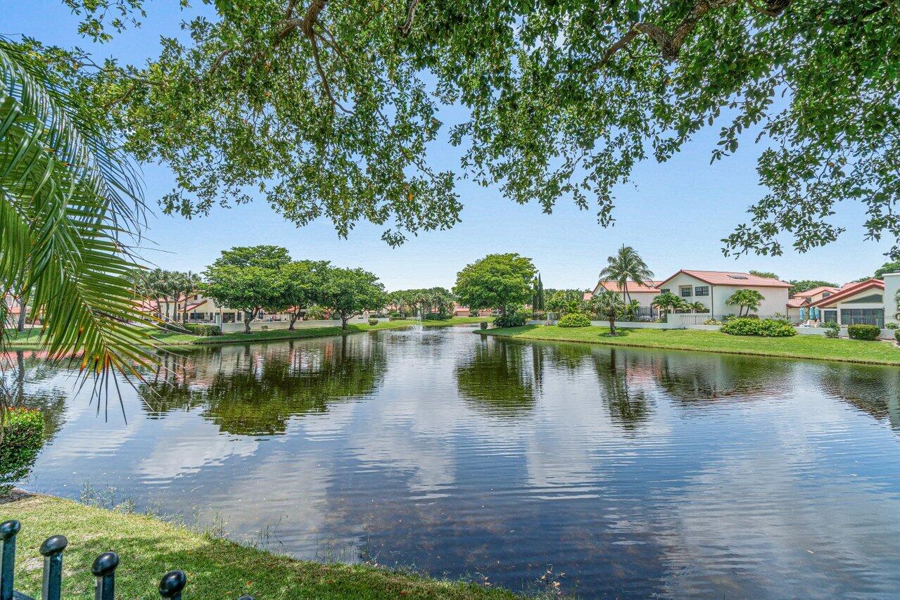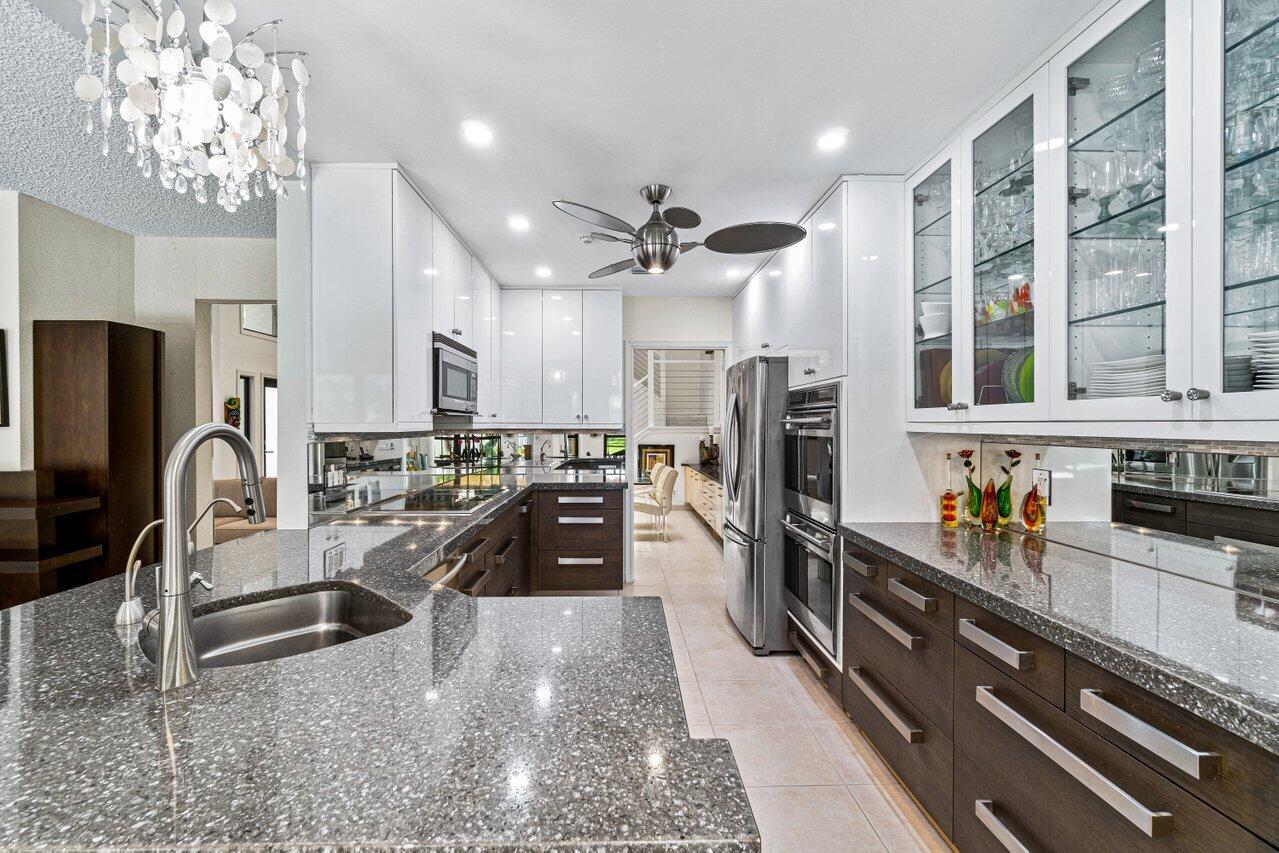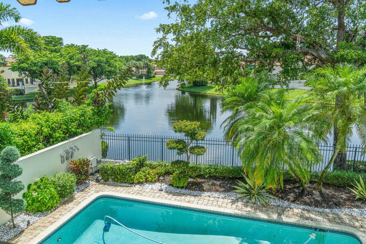 Stunning updated lakefront 4/3 Dominica model perfectly positioned for the best lake & fountain views. Bright open floorplan offers soaring ceilings, floor to ceiling marble fireplace, tile floors & lush carpeting. Gorgeous updated kitchen w/breakfast room, custom two tone cabinets, quartz countertops & stainless appliances. Custom wine bar with wine cooler & white quartz waterfall cabinet. Full bedroom/bath down. Primary suite offers forever lake views, vaulted ceilings, beautiful updated bath w/custom dual vanities, lighted mirrors & spa like shower. Resort style backyard oasis perfect for relaxing, entertaining or dining alfresco. Sparkling private pool & spa. Tropical lushly landscaped courtyard entry leading to patio. Full impact glass, Generac generator and custom fitted 3CG.