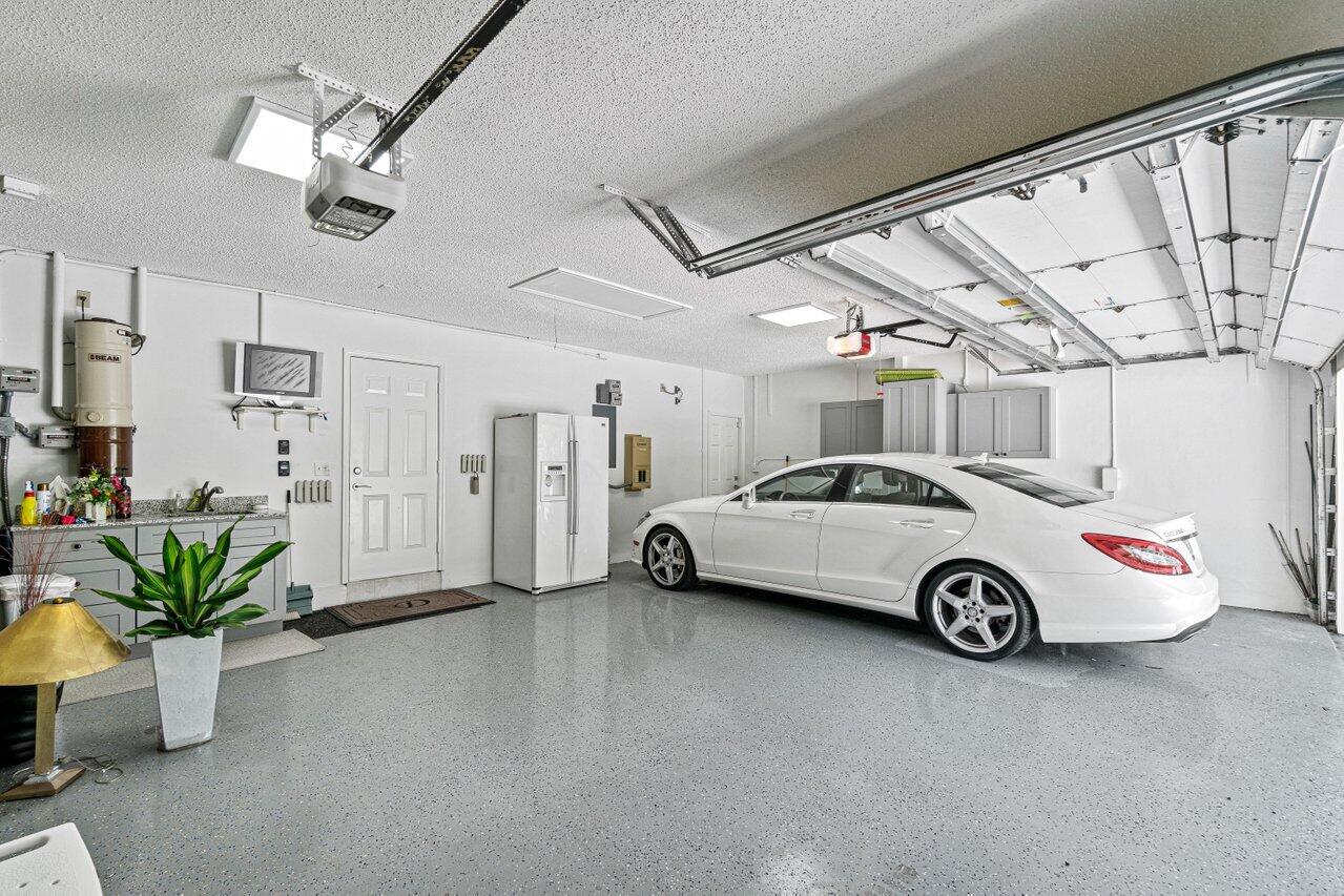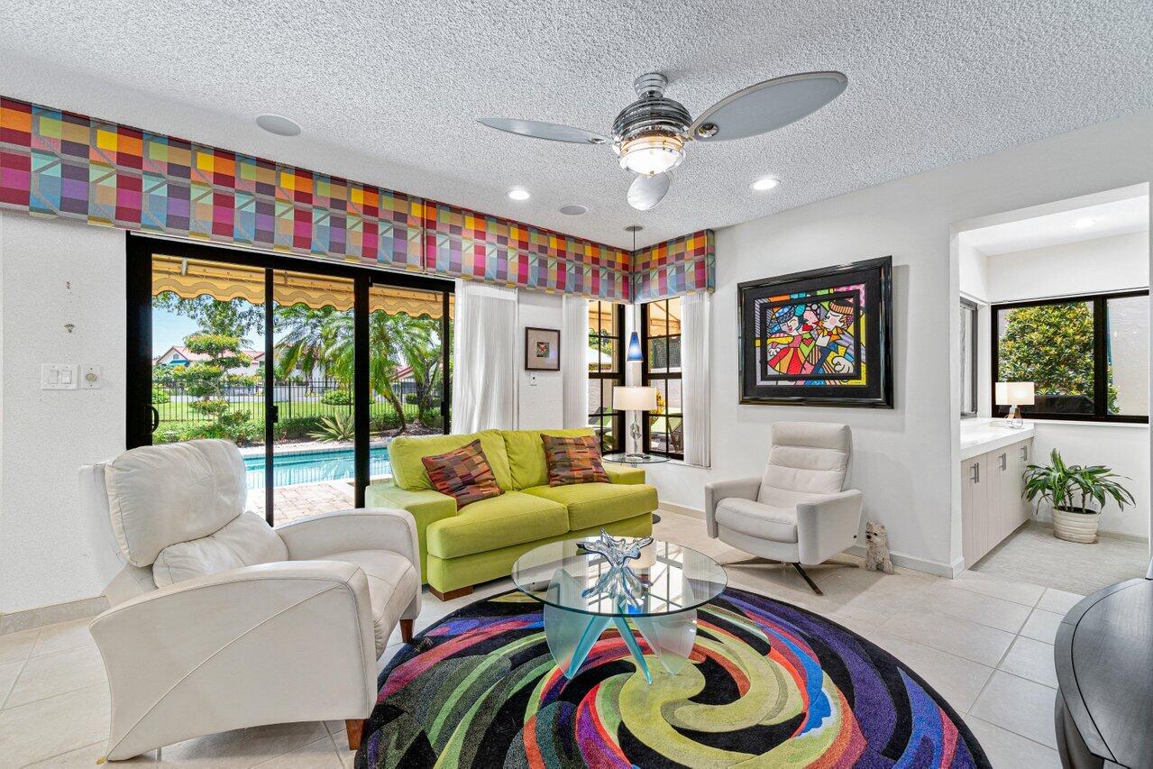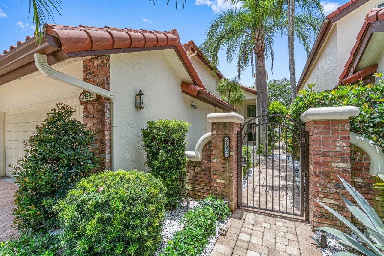 Stunning updated lakefront 4/3 Dominica model perfectly positioned for the best lake & fountain views. Bright open floorplan offers soaring ceilings, floor to ceiling marble fireplace, tile floors & lush carpeting. Gorgeous updated kitchen w/breakfast room, custom two tone cabinets, quartz countertops & stainless appliances. Custom wine bar with wine cooler & white quartz waterfall cabinet. Full bedroom/bath down. Primary suite offers forever lake views, vaulted ceilings, beautiful updated bath w/custom dual vanities, lighted mirrors & spa like shower. Resort style backyard oasis perfect for relaxing, entertaining or dining alfresco. Sparkling private pool & spa. Tropical lushly landscaped courtyard entry leading to patio. Full impact glass, Generac generator and custom fitted 3CG.