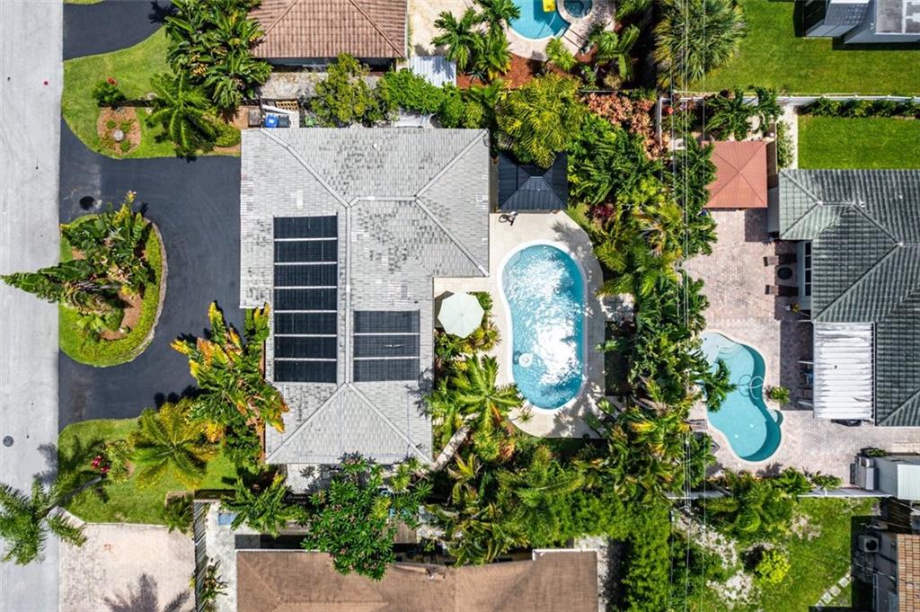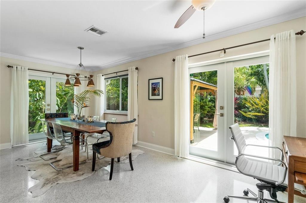 Tucked behind lush landscaping in the sought-after neighborhood of Coral Heights, this thoughtfully renovated mid-century classic features pristine polished terrazzo floors throughout. New modern brushed aluminum frame impact windows and doors enhance the fabulous 50’s design. Four sets of French doors flow out to a private tropical oasis with sparking solar heated pool, new handsome patio gazebo, grilling area with kitchen pass-thru, and new Trex outdoor rain shower platform. Circular driveway, 2017 AC, gas water heater (2021) & dryer, 2012 electric panel, Arlo cams, auto well irrigation, new water supply line, termite warranty, lowest risk flood zone ‘X’. Room for expansion. Natural gas line would allow for a gas range and/or whole house generator.