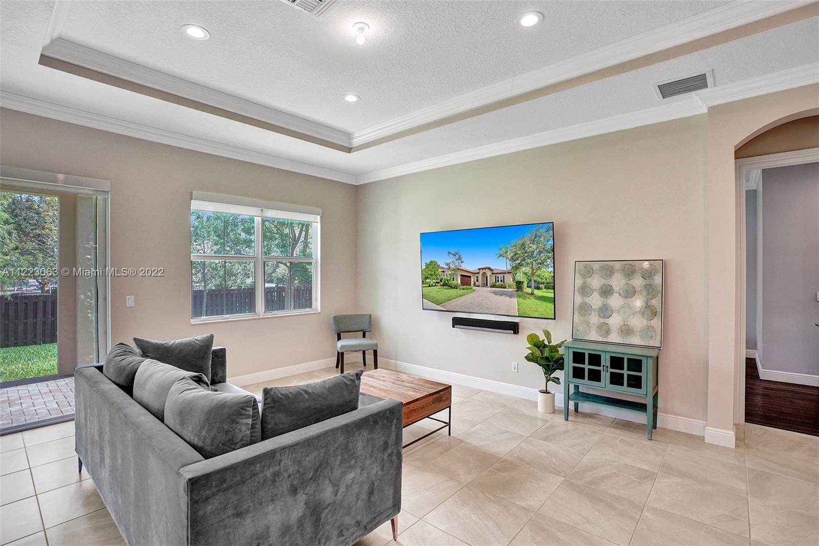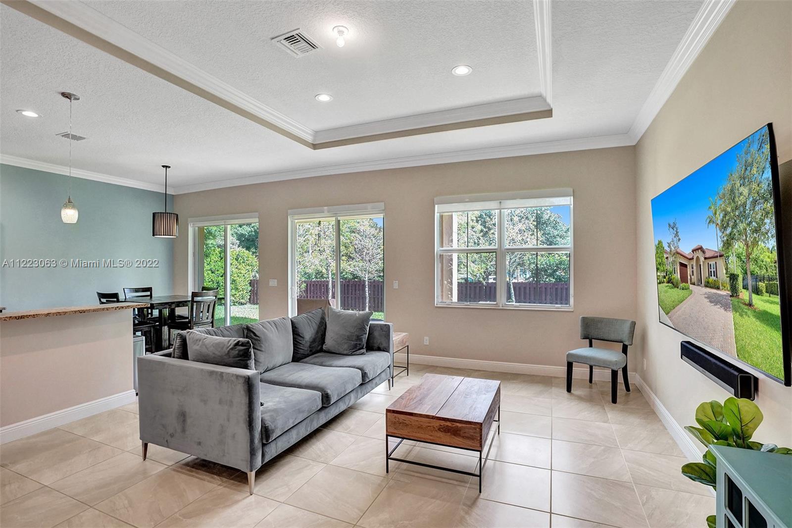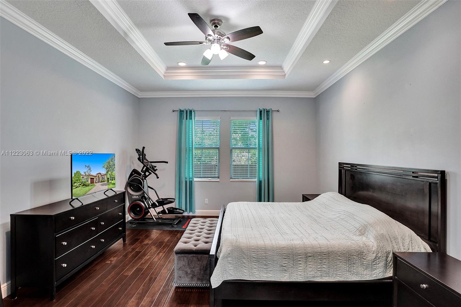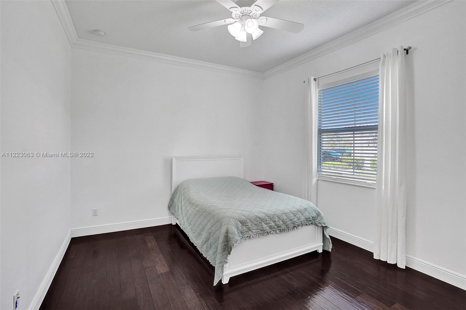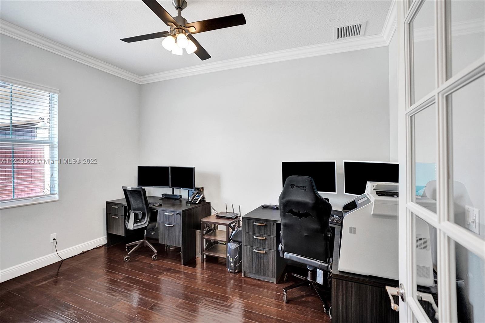 Spectacular one story 3 bedroom + study, 2.5 bath home sits comfortably on a 14,500 sqft lot, perfect for entertaining and has plenty of room for a pool. The open-concept floor plan boasts plenty of natural light, large 20-inch ceramic tiles, hardwood floors in all bedrooms & study, recessed LED lights, & crown molding. The kitchen is well equipped with stainless steel appliances & granite countertops. The large primary suite features 2 custom walk-in closets, hand scraped wood floors & dual sinks. Exterior upgrades include a fenced yard, security cameras, hurricane windows & doors. Newly painted in March 2022. The expansive driveway can easily fit 8 cars plus a 2-car garage that features overhead storage racks. Located in a family friendly community close to major highways & colleges.