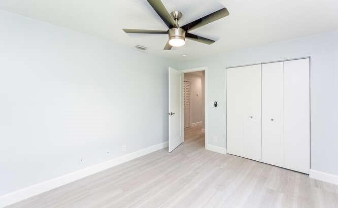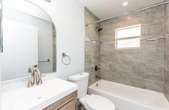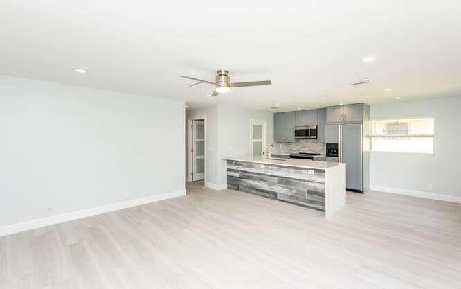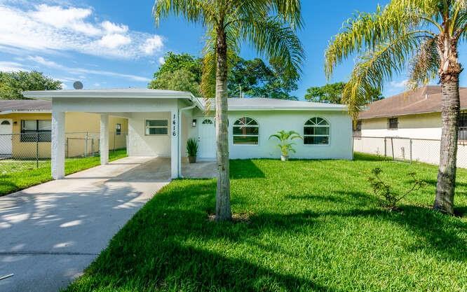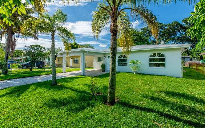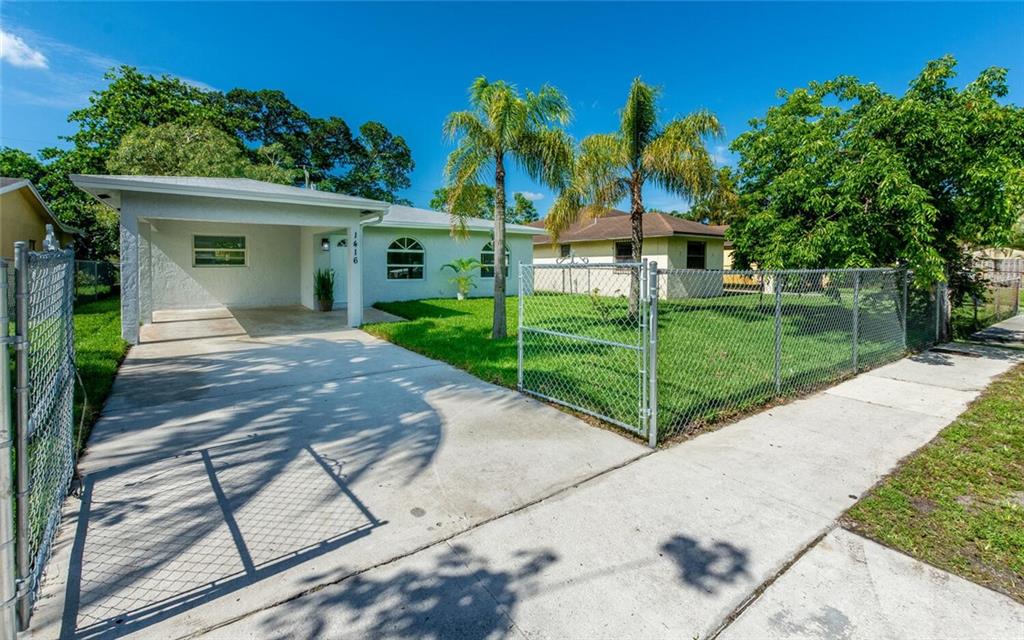 Move in ready!! 2.7 miles to beach.This home has been totally renovated from top to bottom with permits! 4/2 nice sized laundry room off new high-end kitchen. Hurricane Impact windows and doors throughout. Brand new roof! Landscaped with all new sod, new sprinkler system and new fence. Extra wide covered carport. New Smoke/Carbon Monoxide alarm. New fans in every room. All new air ducts with a 3.5 ton A/C. All cast iron pipes replaced. New grey rectified wood grain porcelain tile throughout. Open concept, all new kitchen with quartz waterfall countertops, undermount stainless sink, disposal, KitchenAid dishwasher and refrigerator with water/ice maker. Electric glass cooktop stove with convection oven. Grey, soft-close shaker style cabinetry including front panels on fridge and dishwasher.