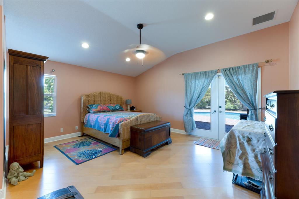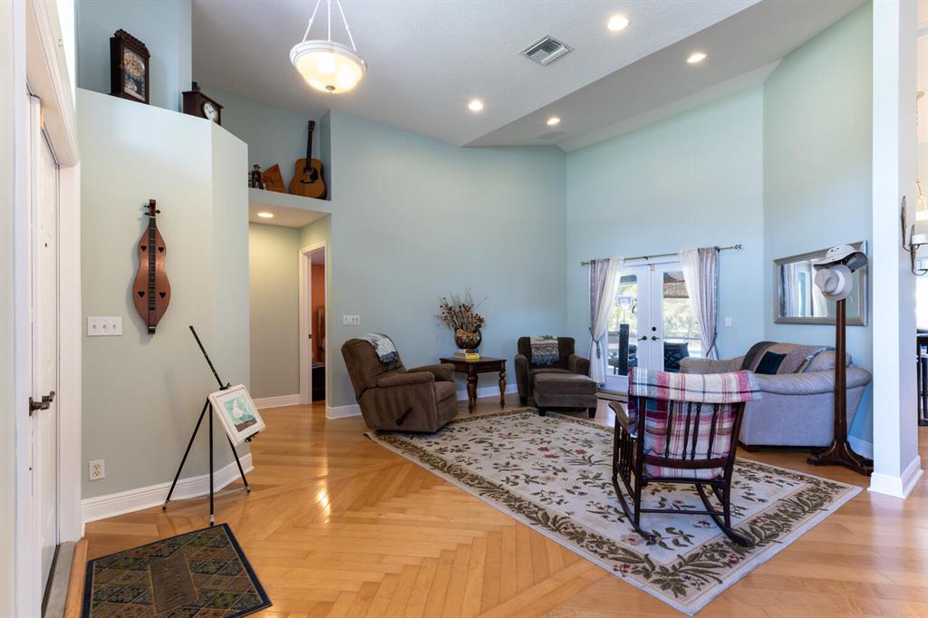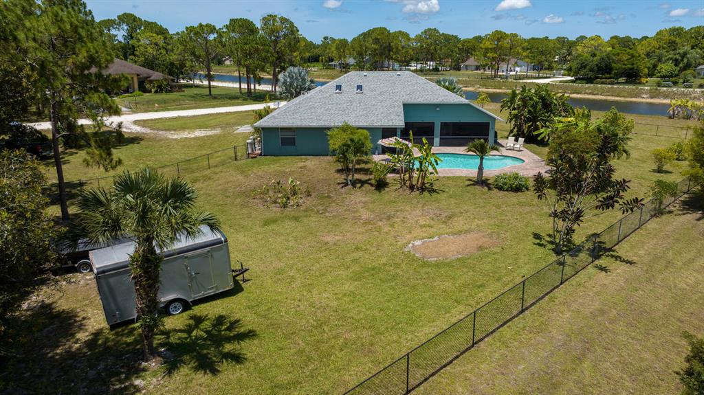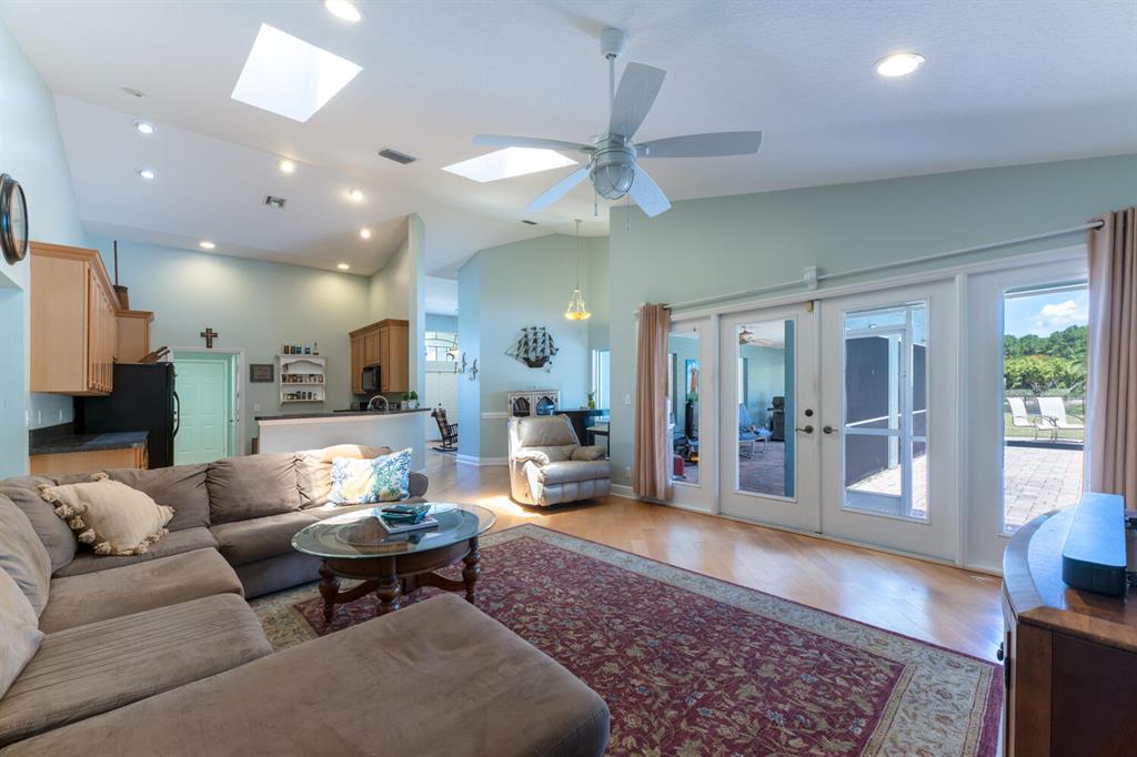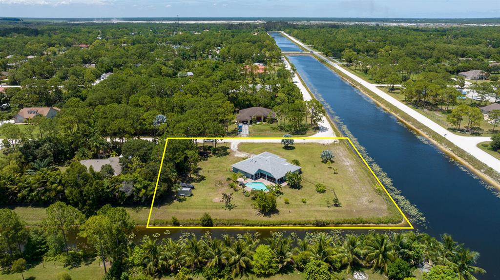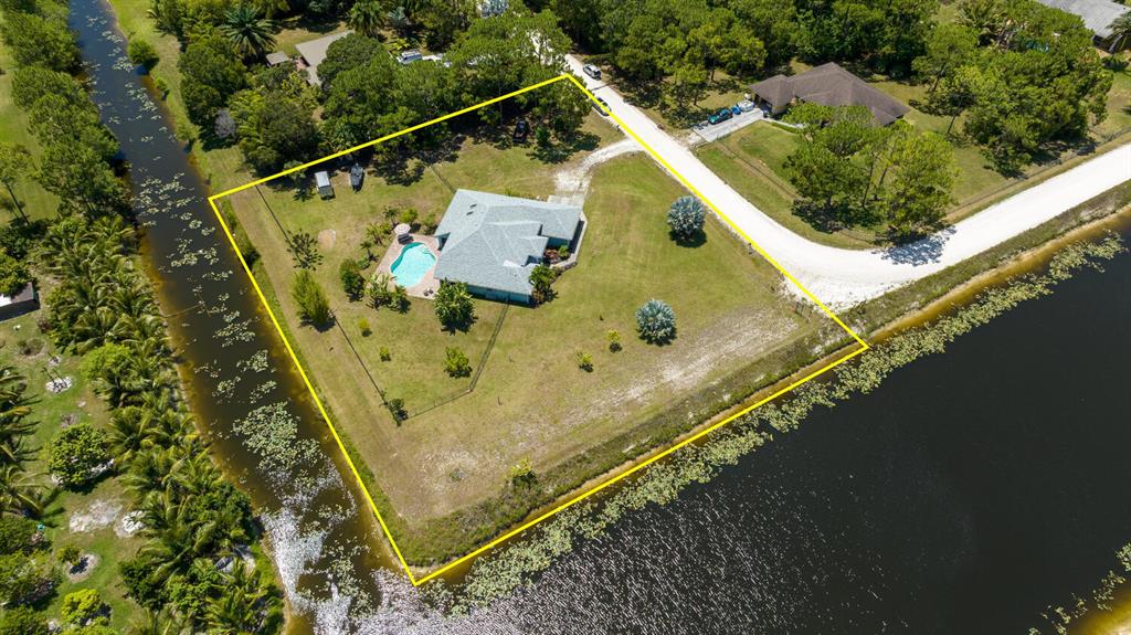 2.46 acres with water views and privacy! This 3 bedroom plus den, 2.5 bath, pool home is located on a large lot with canals on the eastern and southern portions of the property. It features a spacious open floor plan with split bedrooms and room to entertain. Enjoy your screened in back porch, overlooking your private pool, large yard, and relaxing water views! The kitchen features wood cabinets, breakfast nook, pantry, and a bar. Wood floors and high hat lighting throughout. The den can be utilized as a 4th bedroom or office. The master has french doors to patio area, a large walk-in closet, and dual sinks. Roof was replaced in 2019, exterior paint in 2020, gutters, irrigation system and pool pump within the last year. Check out this beautiful home on a unique lot before it's gone!