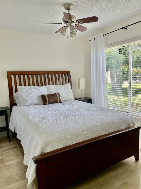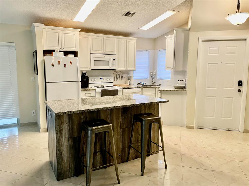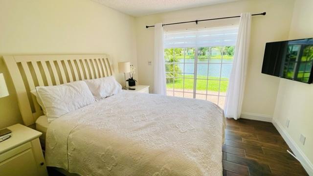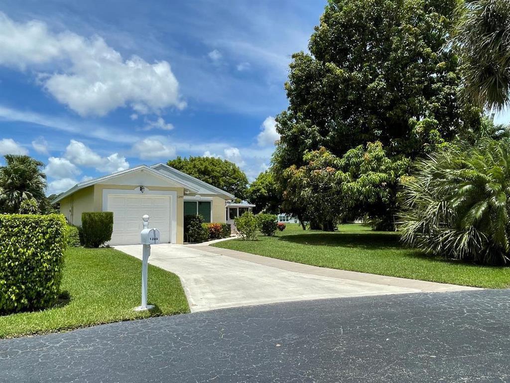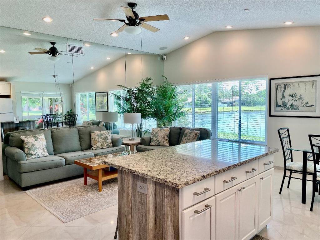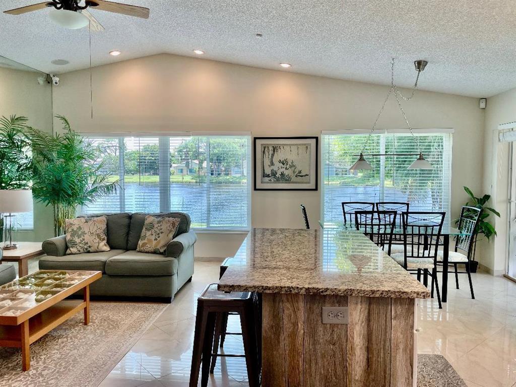 A RARE FIND! 2 bedrooms, 2 baths, 1 car garage single family home on incredible lake in the gated community of Palm Club. BRAND NEW ROOF and hurricane rated skylight (March 2022). Fully remodeled kitchen with separate island, partial redone baths, expanded driveway and tile throughout. Oversized lot with room for a pool overlooking beautiful tranquil lake. Enjoy your water views and magnificent sunsets from almost every room, including screened patio with vinyl windows for easy enclosure. Great all ages community closing to shopping, main highways, PBI Airport and Florida's finest beaches! All window treatments and security cameras convey.