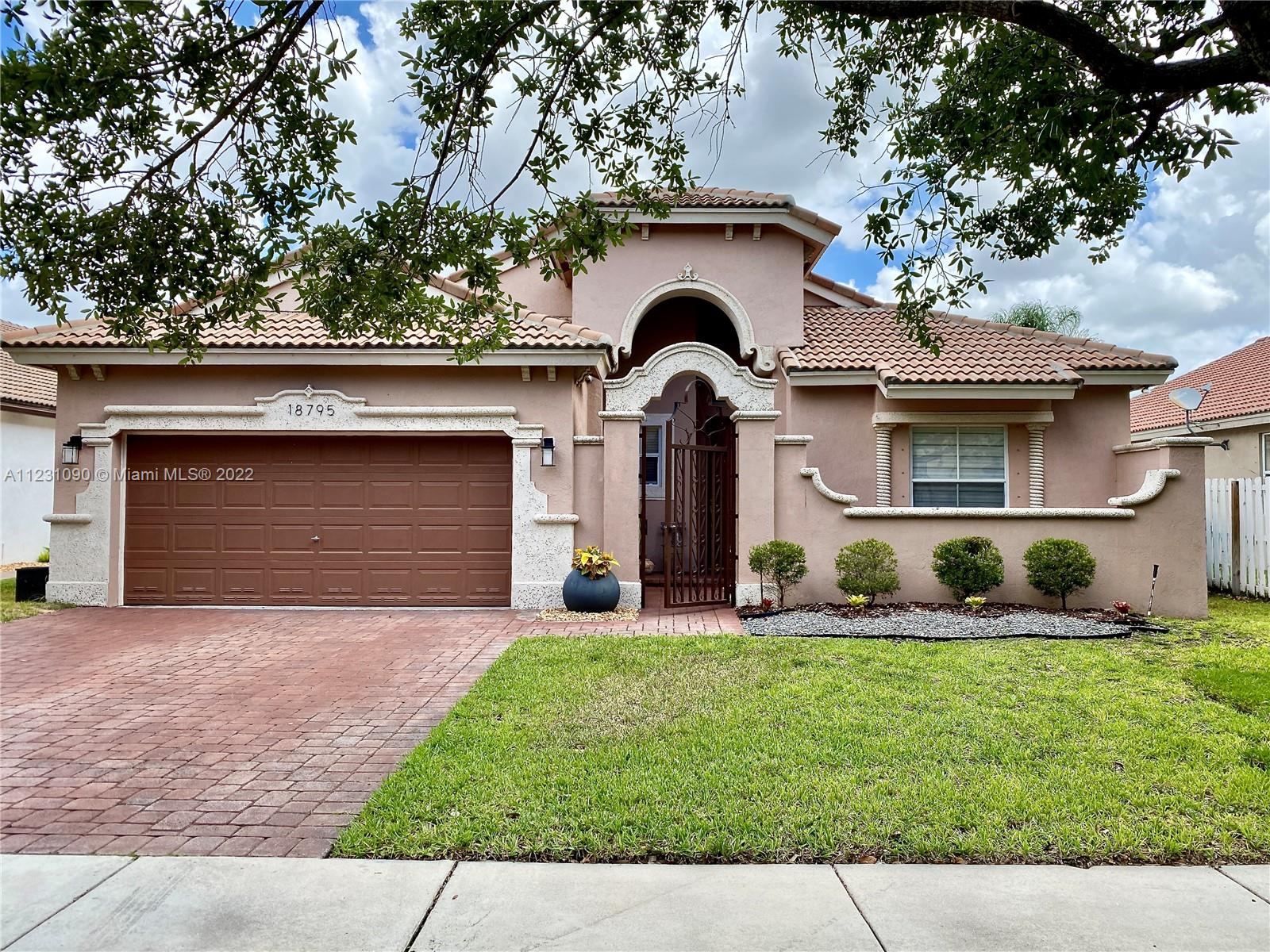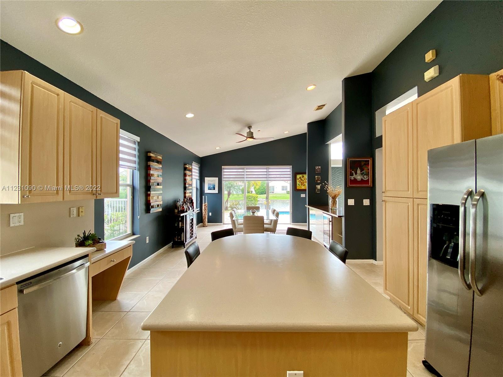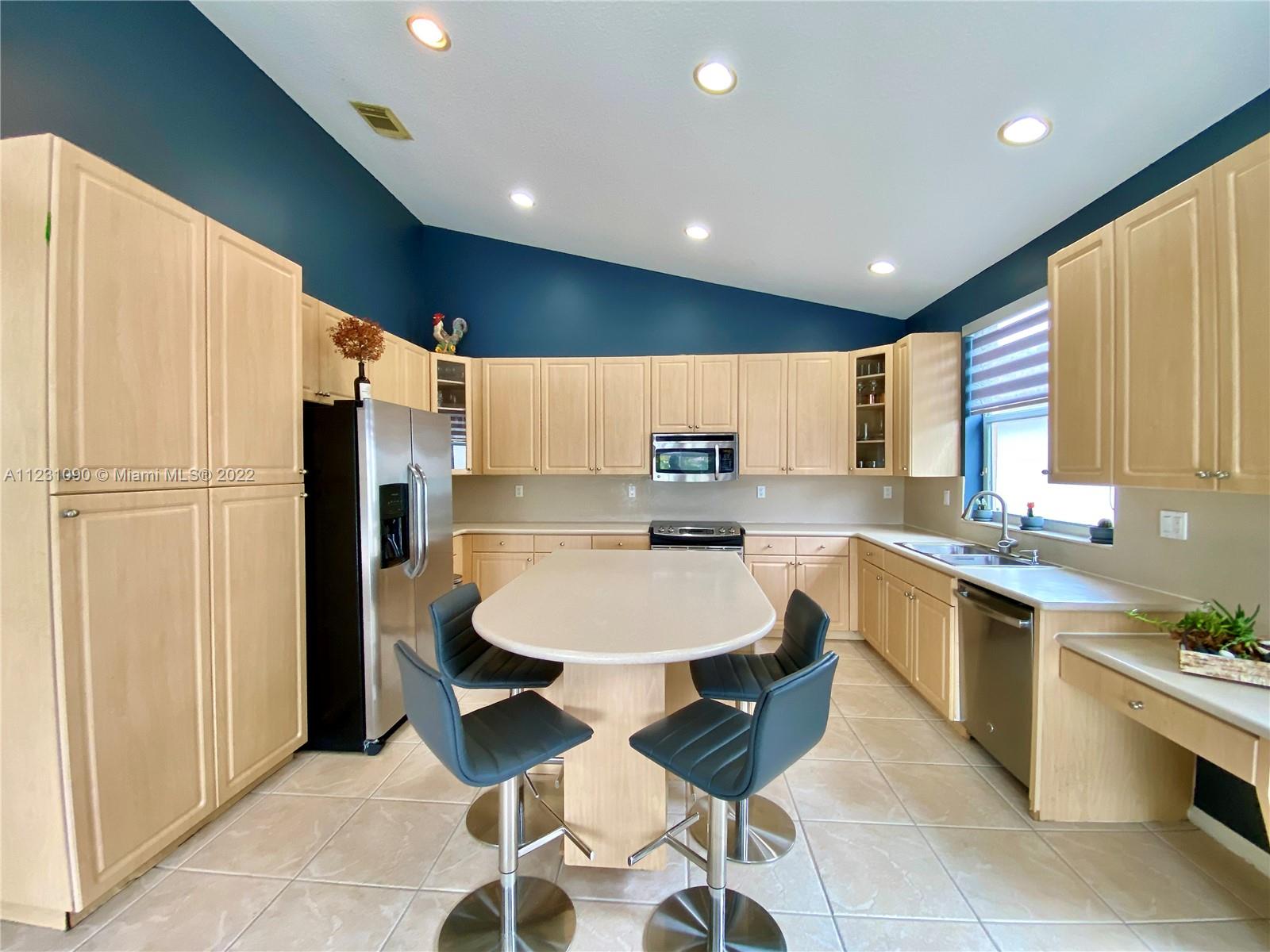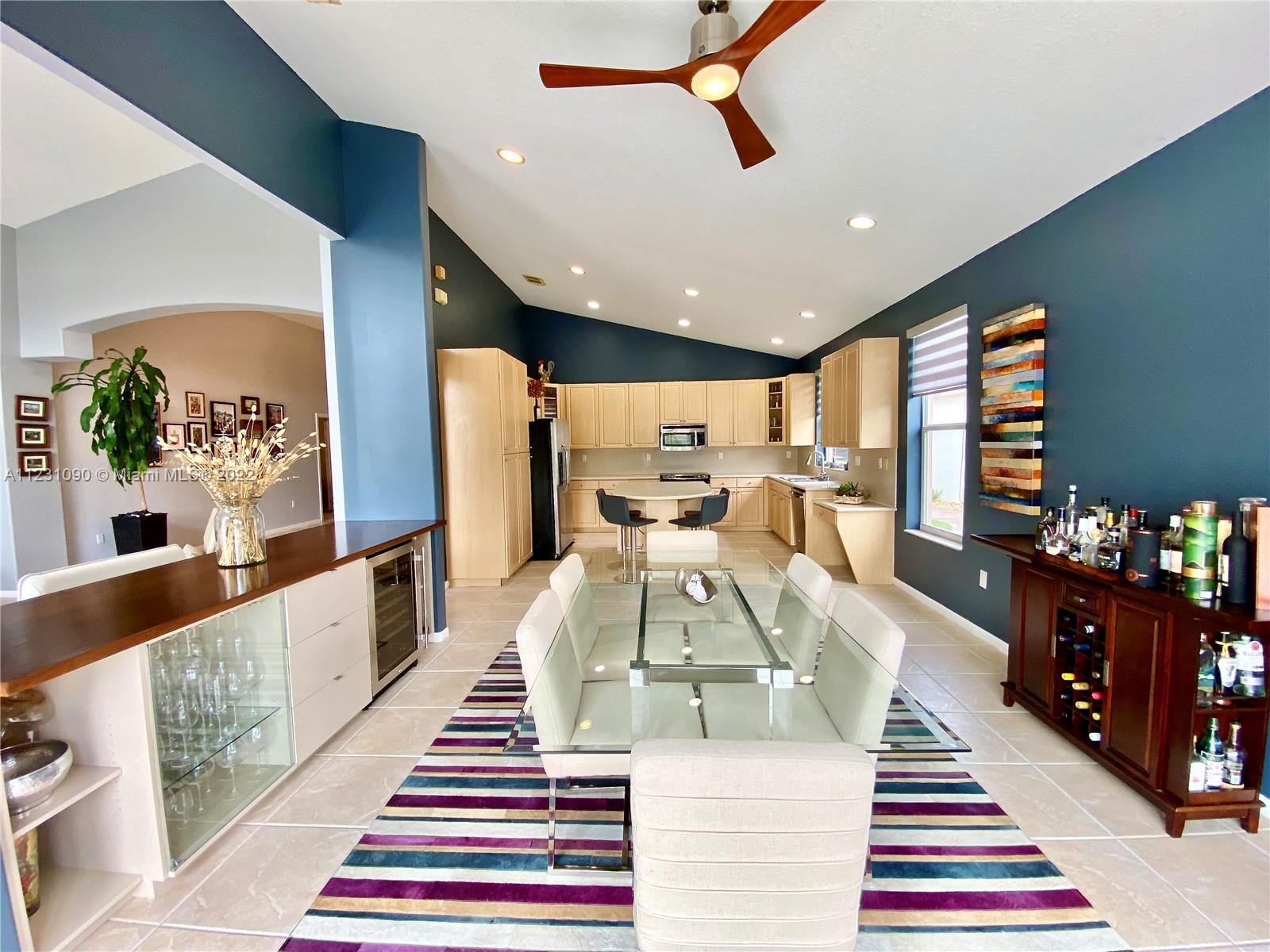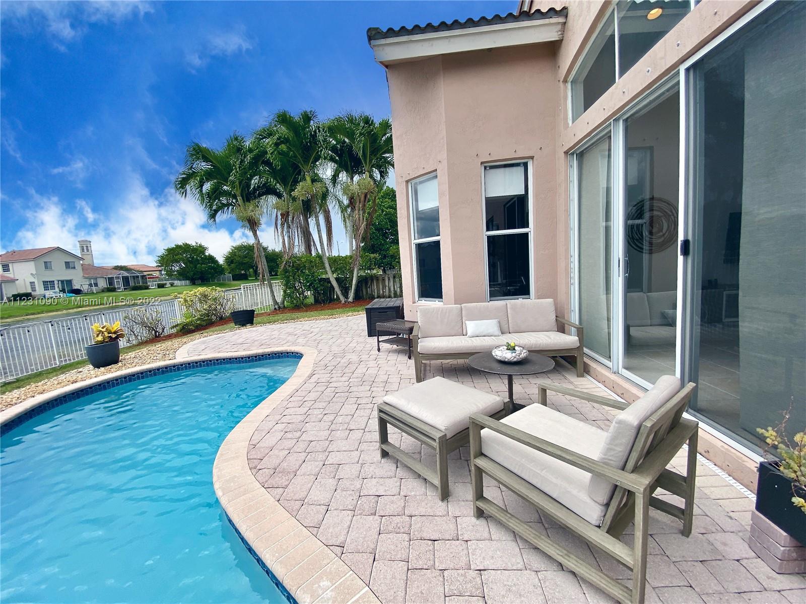 Fabulous ONE STORY 4-Bedroom 3-Bathroom LAKEFRONT home. Peaceful lakeview to enjoy and relax in a recently renovated pool. Plenty of natural light throughout the home, located in the resort style and prestige gated community of Sunset Lakes. Stunning Clubhouse with recently renovated and expanded gym and plenty of amenities. Close to great schools. Tile flooring, cathedral ceiling, spacious master bedroom. Open concept eat-in kitchen with island, lots of space, and great for entertaining. Built-in wine cooler and cabinet area in dining room that opens to living room for modern looking OPEN FLOOR PLAN. Energy efficient central air system replaced in the last 5 years. Some furniture available for sale. Call listing agent for appointment!