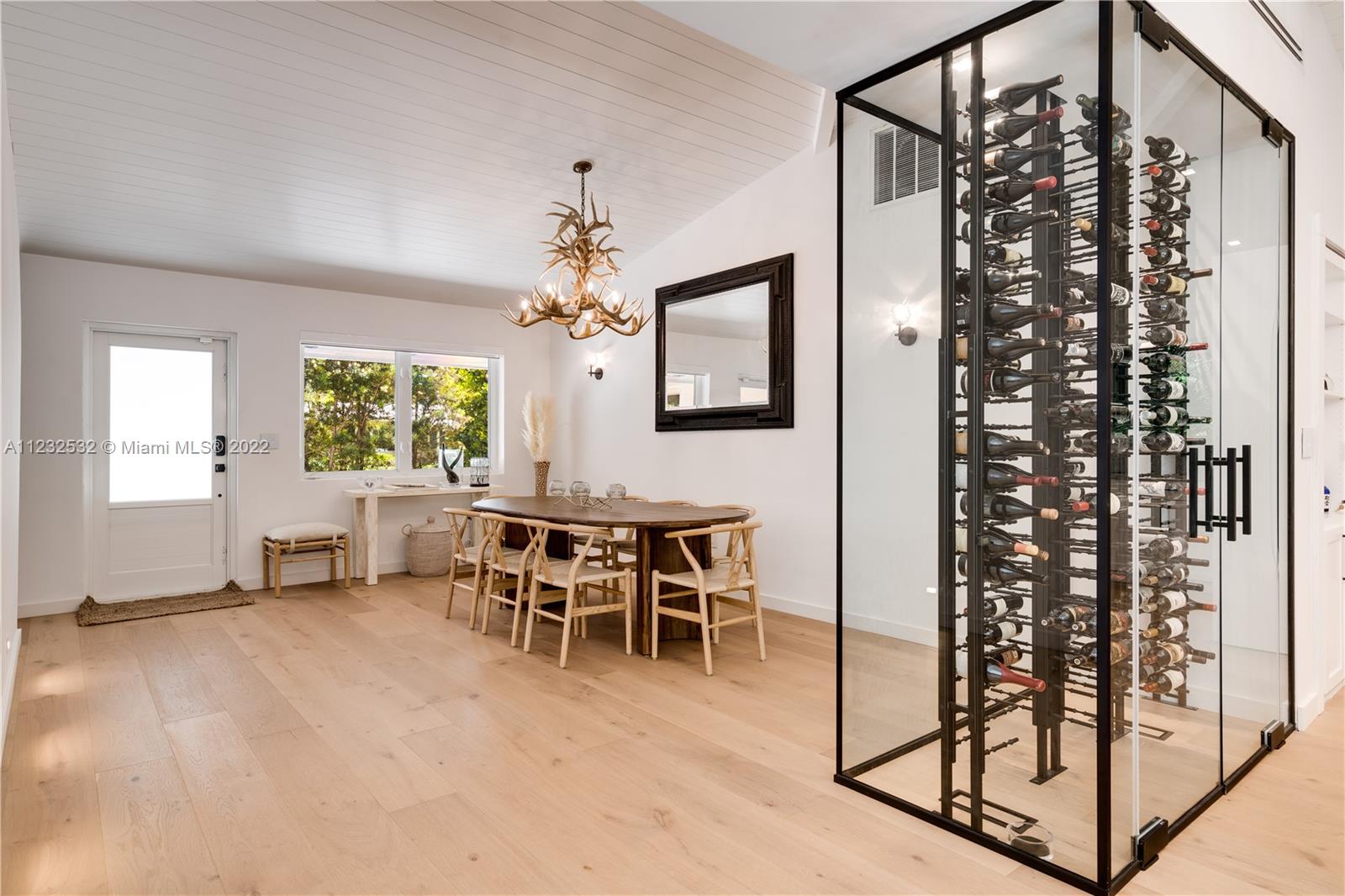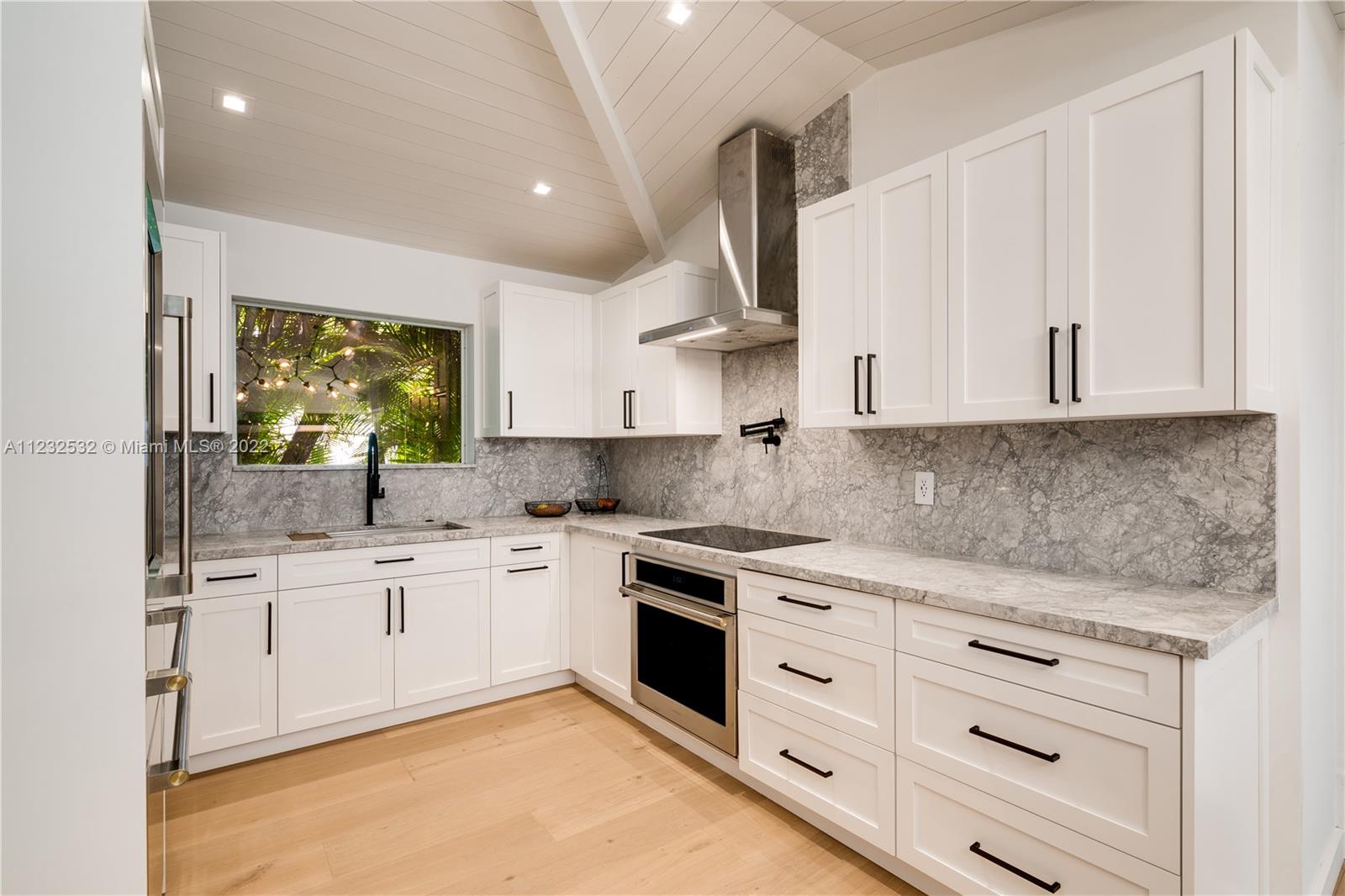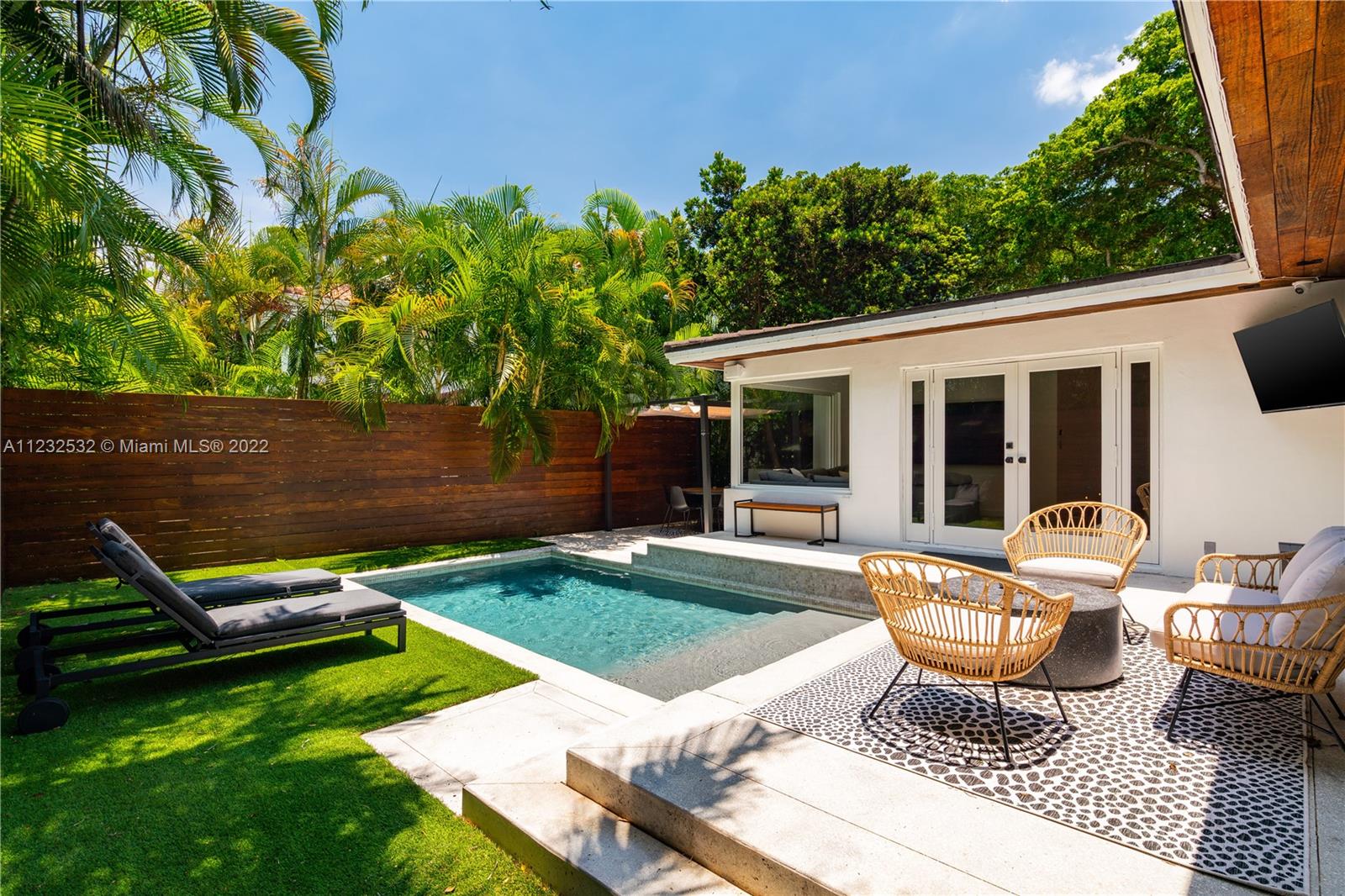 Hidden Treasure in Coral Gables! Completely renovated in 2021, this 3 bedroom, 2 bathroom home rests on quiet Michelangelo Street. Welcomed by lush landscaping, and brick driveway leading into 1-car garage. Spacious formal dining area, eat-in kitchen with custom quartzite countertops, and glass-enclosed wine bottle storage highlights the main living areas. Vaulted tongue and groove ceilings, hardwood flooring throughout the bedrooms, and sleek-modern designed master bath with dual sinks. Cumaru hardwood fence encompasses the backyard with outdoor shower, pool, polished concrete deck and artificial turf.