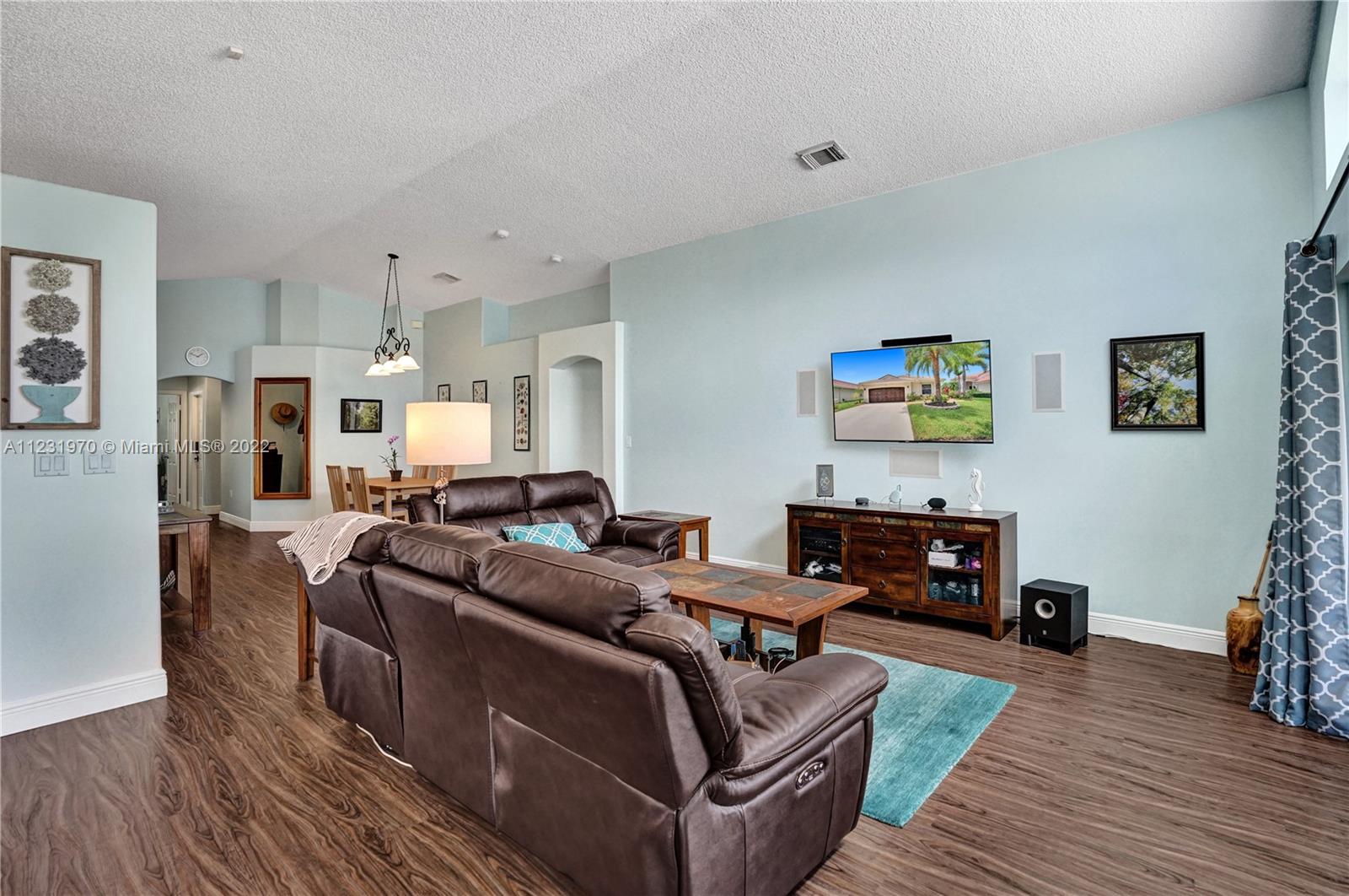 Enjoy outdoor living & beautiful water views - your own private oasis! This gorgeous 3 bed, 2 bath, 2 car garage gated community home showcases impressive wide water views from all main living areas! A double set of impact glass doors lead out to an extended screened patio perfect for BBQ & a paddleboat ready for a cruise around the lake! Inside enjoy an open concept layout w/laminate flooring throughout spacious living areas, surround sound speakers, tastefully remodeled baths, fresh paint inside & out and high vaulted ceilings for a light & bright feel! Kitchen features include stainless steel appliances, pendant lighting & induction range. Impact Windows & Doors for convenience. Great location in the sought after gated community of Keystone Lake! Cable & internet provided through HOA!