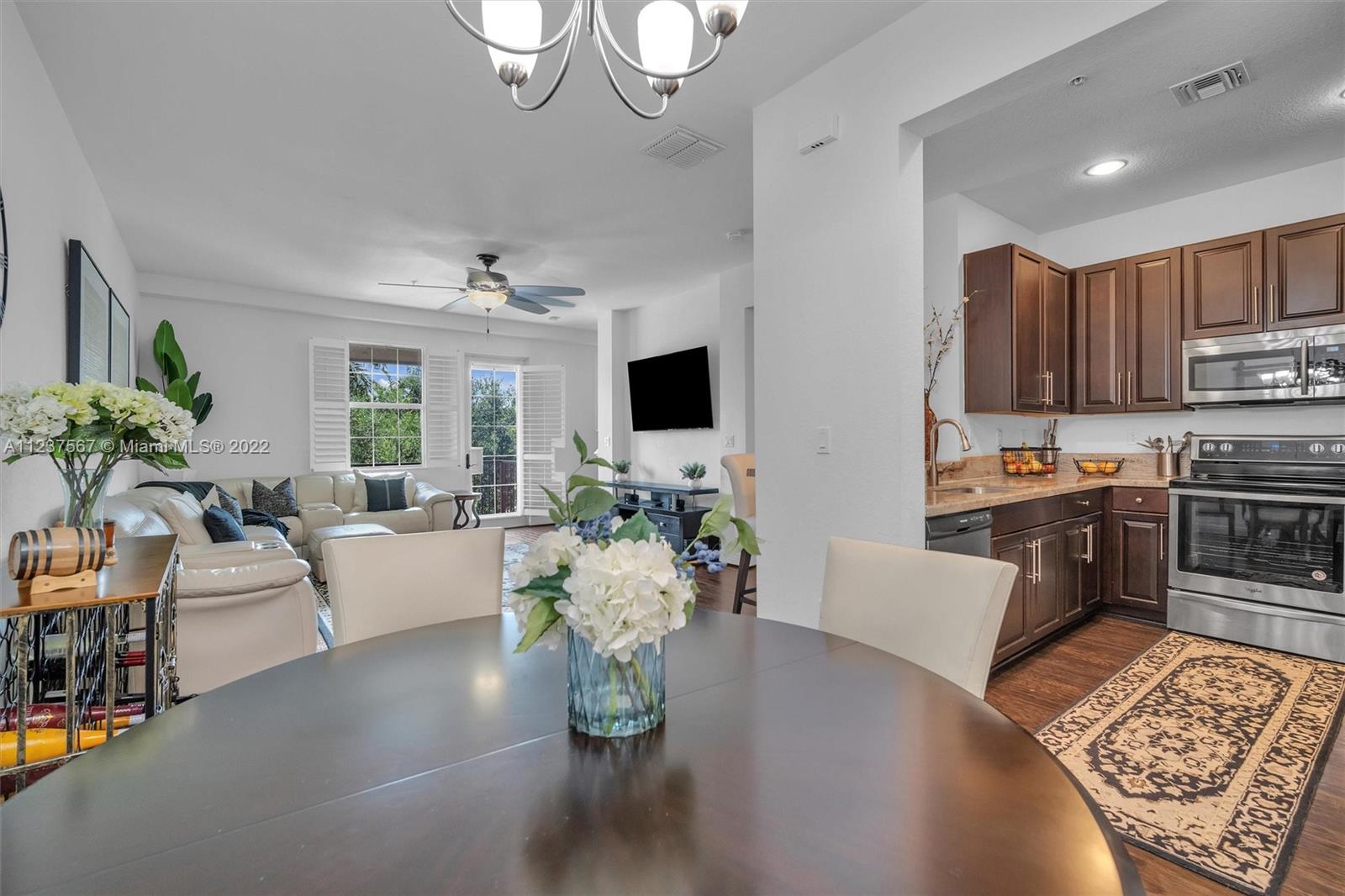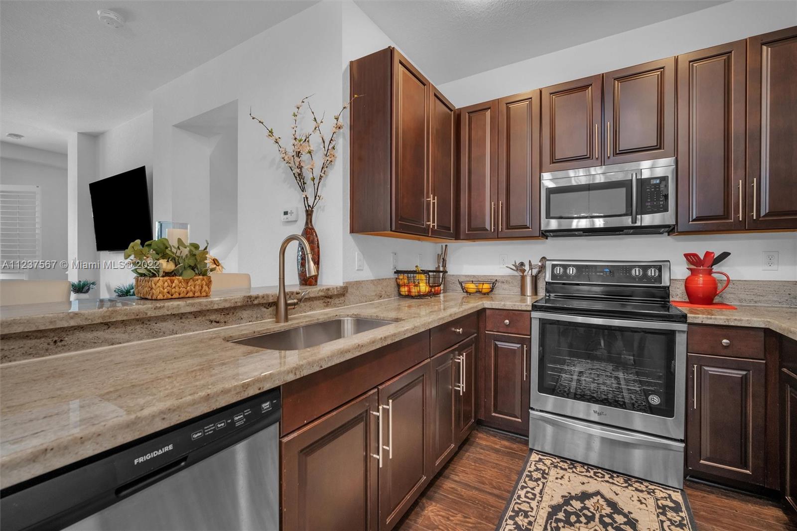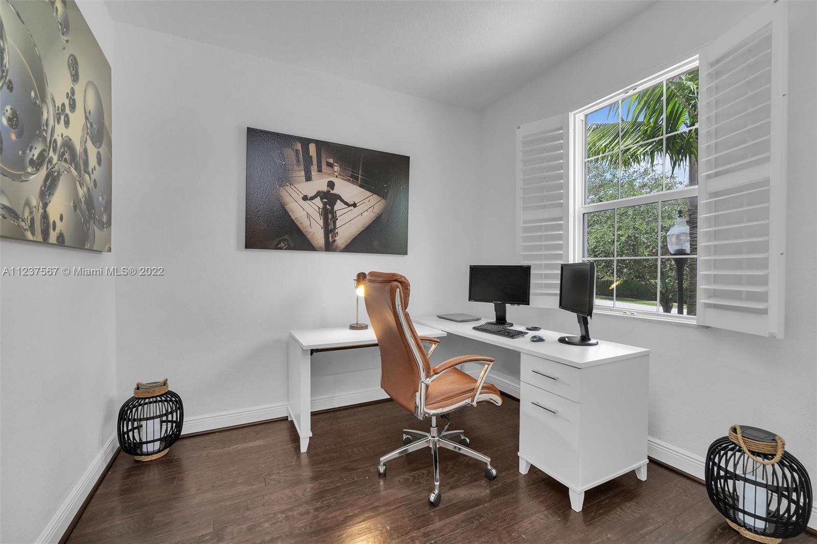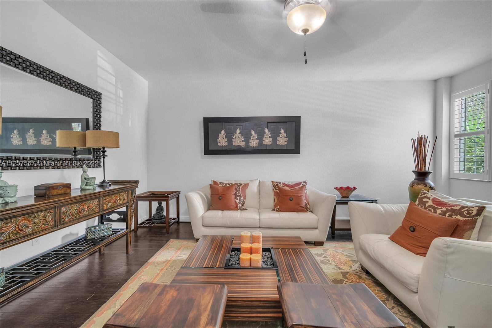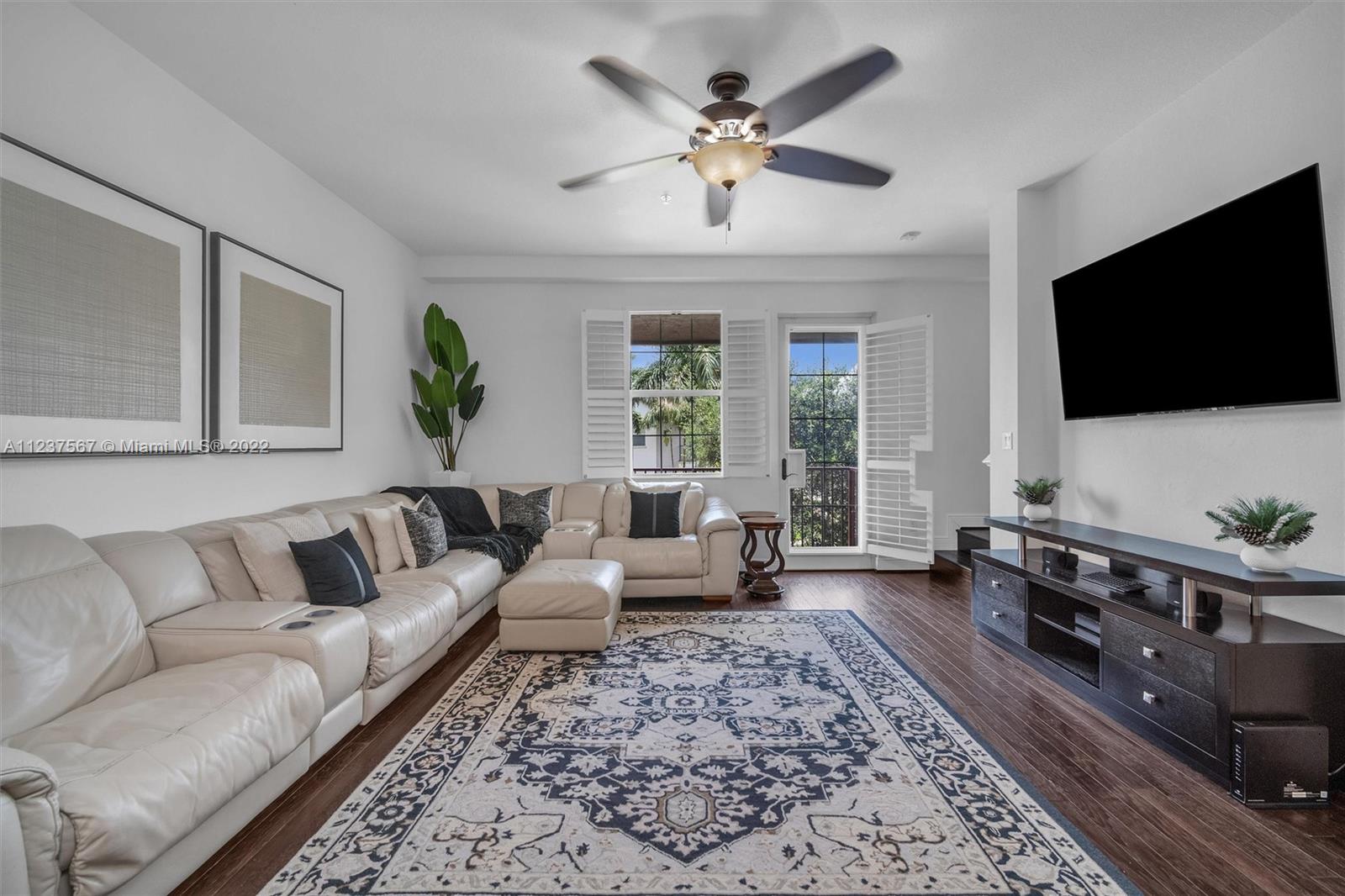 Extremely clean and luxurious Mediterranean tri-level townhouse with a full 3 beds / 3.5 baths / 2-car garage. Upgraded kitchen with granite counter tops, dark wood cabinets + stainless steel appliances. Spacious primary suite on 3rd floor has dual closets and a primary bath with dual sinks, along with a separate tub and shower. Gorgeous white plantation shutters + REAL wood floors throughout the home. HURRICANE IMPACT WINDOWS with FULL SIZE WASHER AND DRYER. Playground in courtyard steps away- visible from multiple windows and patio. Community boasts a gated entrance, clubhouse with full kitchen, pool, gym, and over 1 mile of scenic paths that wraps around the lake. Montclair is conveniently located near Turnpike, I-75, restaurants and shopping.