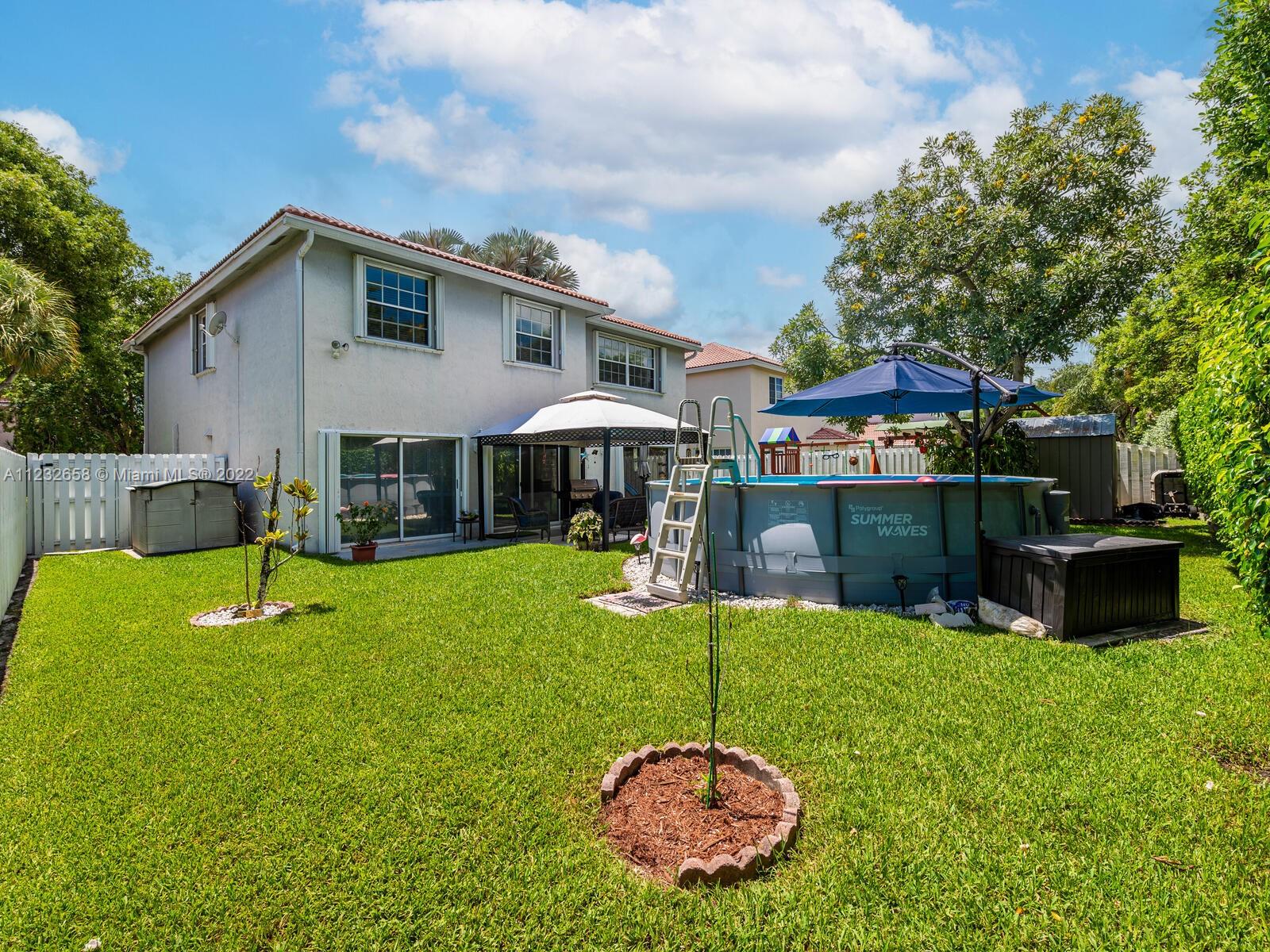 Beautiful well kept home featuring 4 bedrooms w/ 2.5 baths & 2 car garage. High end engineered wood flooring. Kitchen overlooks the family room. Newer S/S appliances. Gas water heater (2019) and dryer. all bedrooms on 2nd level featuring an oversized master suite with a double door entry & 2 walk in closets. Loft area on 2nd floor Attic flooring for extra storage. Master bathroom has separate shower plus a roman tub & double sinks. Alarm system with 2 motion detectors. The exterior has an above ground pool and the yard is totally fenced. Accordion shutters, tinted windows. Sprinkler system w/ separate water meter. 2 sheds. This home is walking distance to A+ schools plus a wonderful park with a splash pad! 5 minutes to Sawgrass Mills Mall. Centrally located for easy access to tri-county