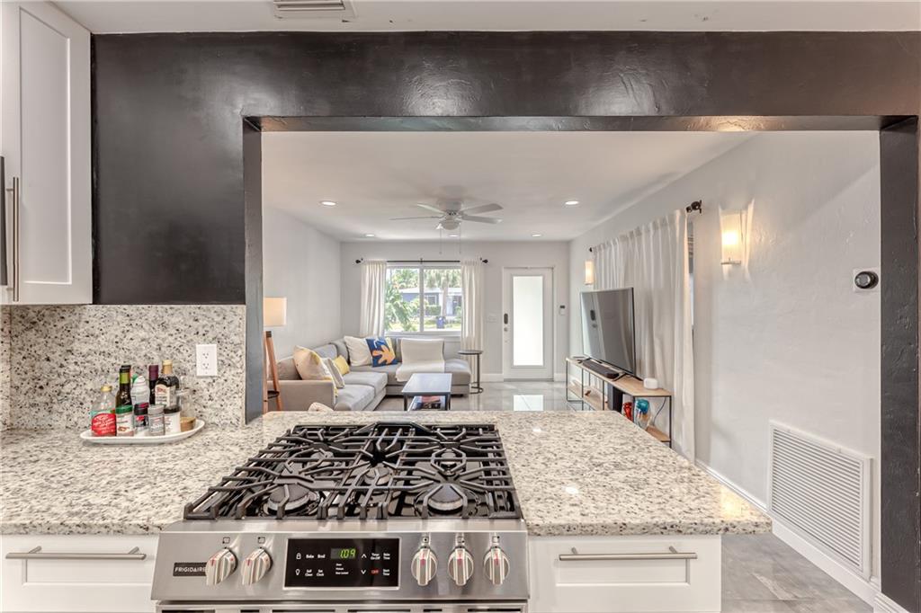 Bright and modern 3 bed, 2 bath home with plenty of room for a pool. Open Kitchen with dining area and indoor laundry room. Primary /Owner's suite on the back of the house, with separate entry door. Renovations done in 2017: porcelain flooring throughout, all impact windows and doors, new roof in 2015, plumbing line trenched and replaced in 2021. A/C new in 2013. Natural gas line from the street runs the stove / oven, dryer, tankless hot water heater, and the A/C heater. Nice paver patio in the large back yard for lovely outdoor dining experiences. One car carport with large storage closet. Very pleasant home ready for you!