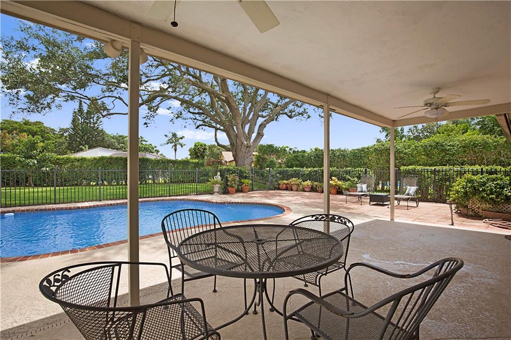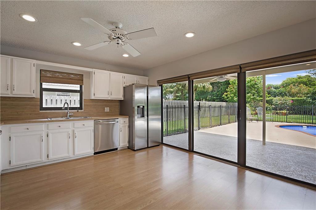 Spacious double door Foyer Entry bring you into the expansive Great Room anchored with a dual sided, white brick Hearth & Wood Burning Fireplace. Storm Safe with Impact Windows & portable generator. Spacious Kitchen boasts new ’20 SS Appliances, White Wood Cabinets & Butcher Block Counters. New Electric Panels, LED Hi-Hat lights, Updated Cabana Bath: new Lights, Sink, Toilet, Bath Fitter Tub & Paint, New Toilet Primary Bath, recently Painted, Laminate Flooring, HWT ‘17. Huge, covered Patio overlooks fenced in Pool, & shaded, tropical oasis of a back yard: Dragon Fruit & Avocadoes will be ripe soon! Oversized 2 Car Garage newly painted, Storage Shelves, Cabinets & Refrigerator plus Air-Conditioned Storage Room/Office space in Garage. As-Is. No HOA! Great for Investors: may rent immediately!