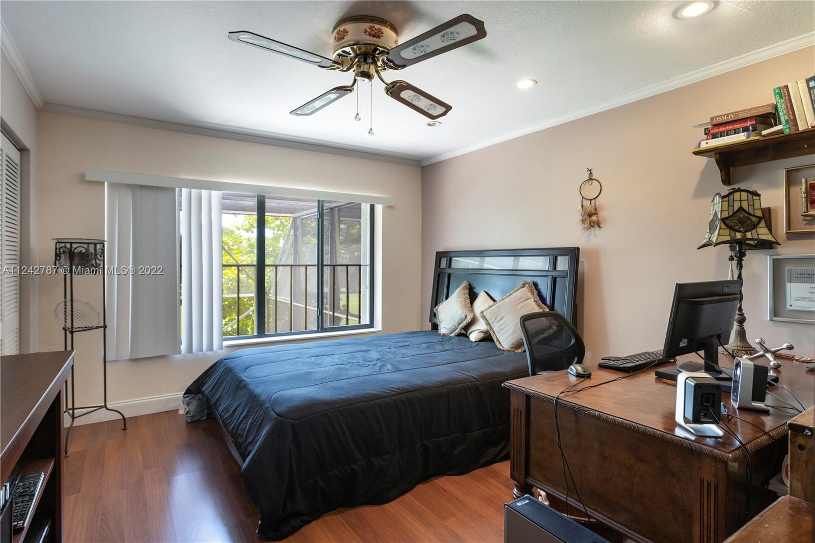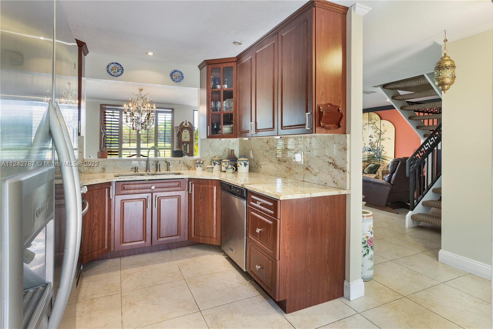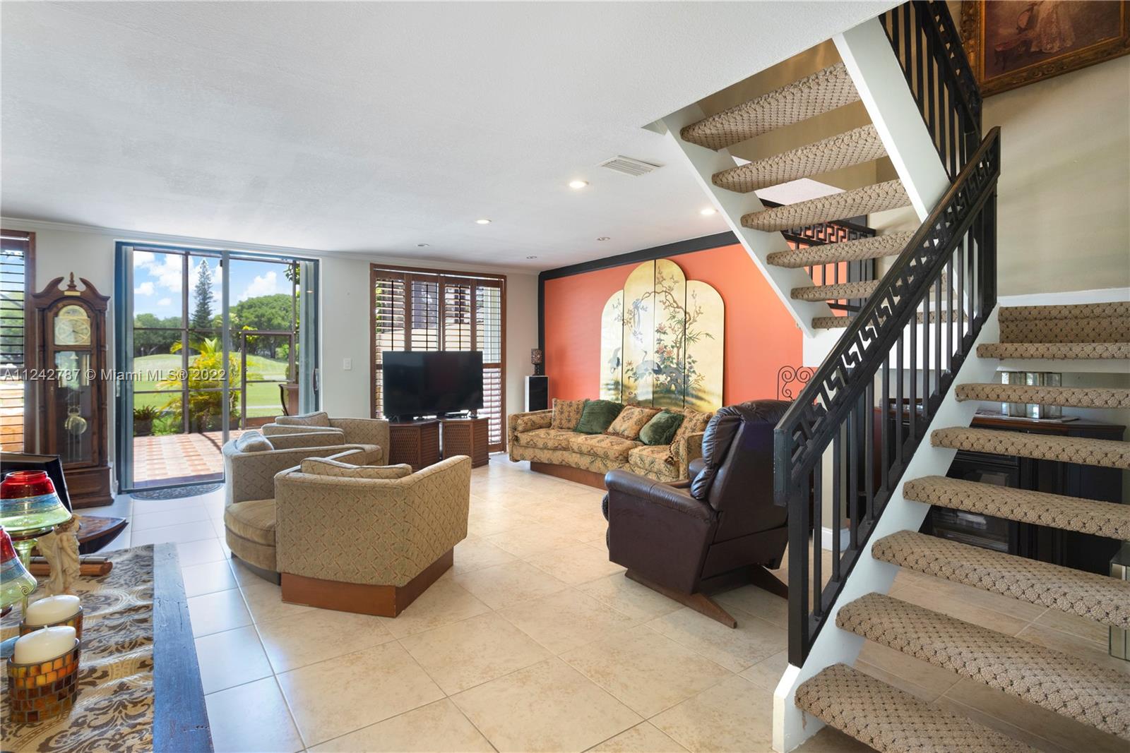 Beautiful two story Spanish style townhouse with golf and lake view. Excellent location, minutes from MIA, restaurants, shopping, entertainment, schools, and the new Jackson Hospital. Easy access to Palmetto Expressway and the Turnpike. Wood laminate flooring on the second floor and tile in main floor. Kitchen has stainless steel appliances. Gated community offers tennis, basketball, pool, clubhouse, golf, and gym. All bedrooms are located upstairs. Security on the property 24/7. First floor half bath converted to full. Garage can be converted to a 4th room and is fully tiled. Washer and dryer included.