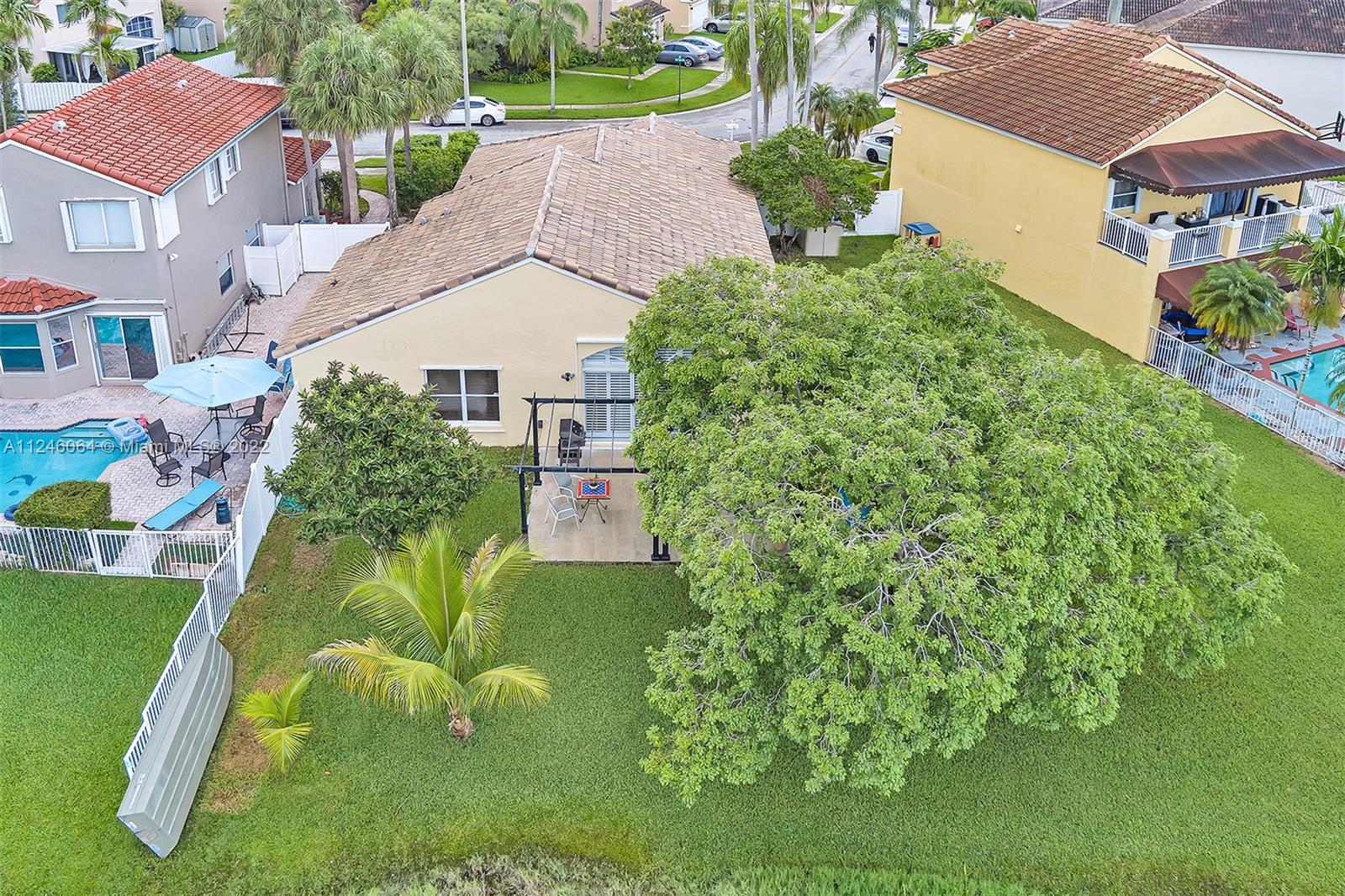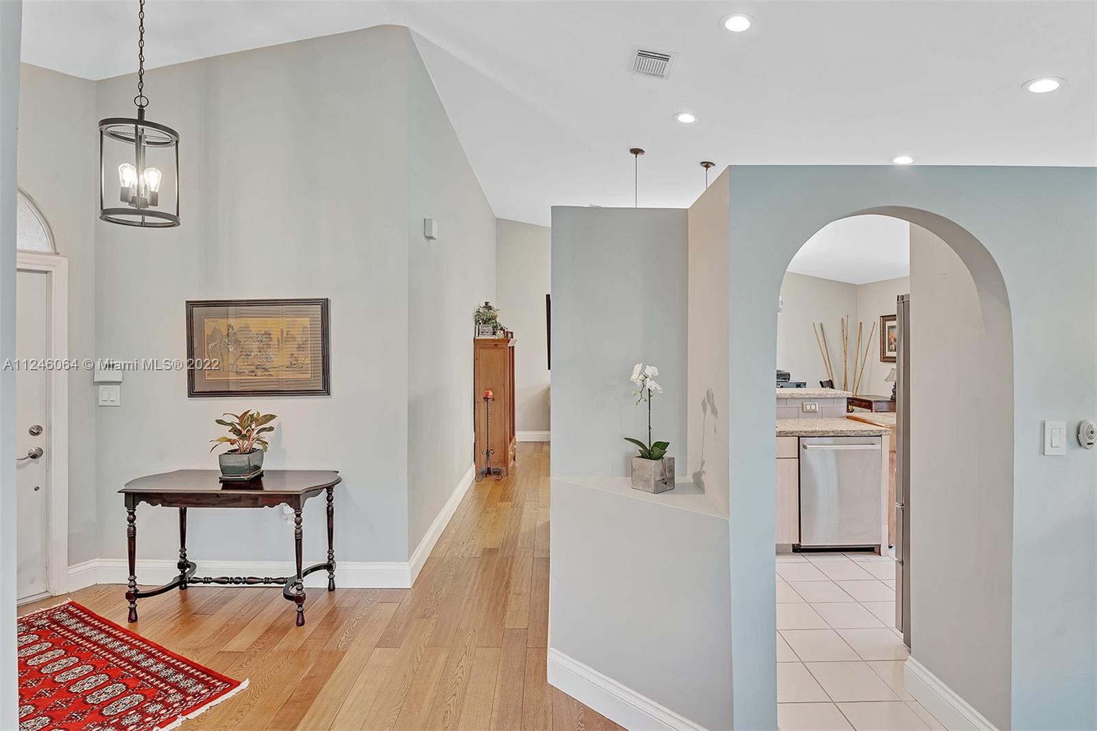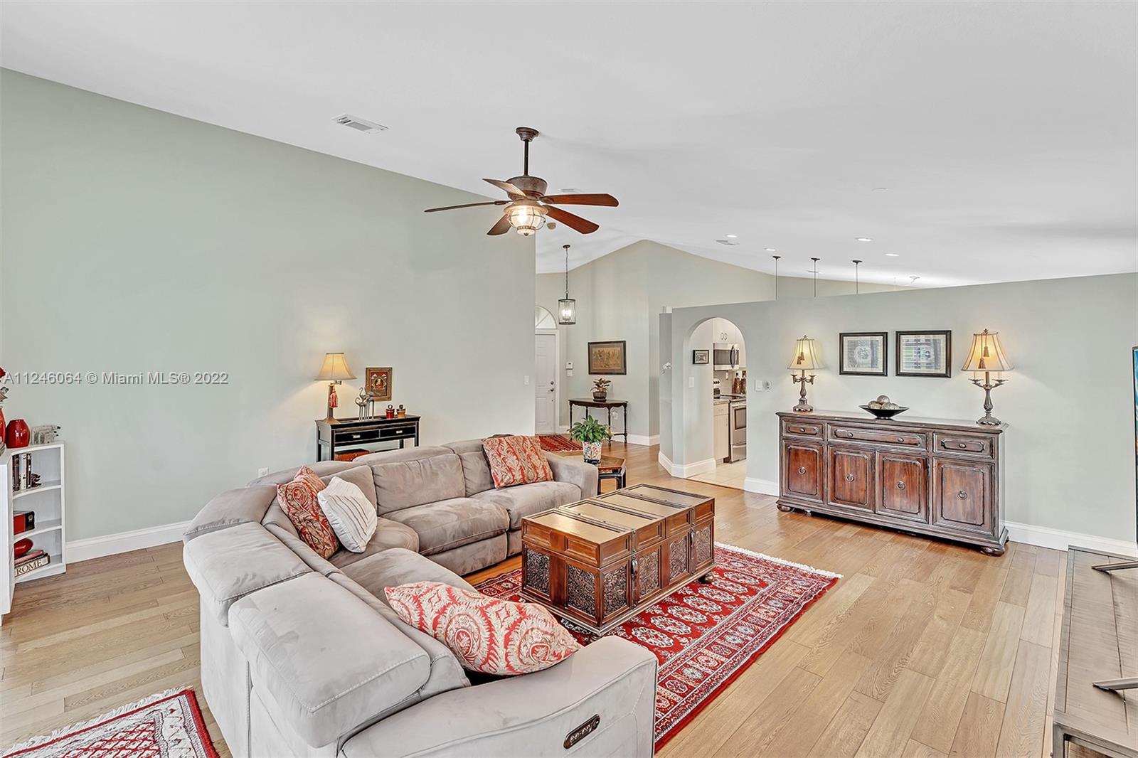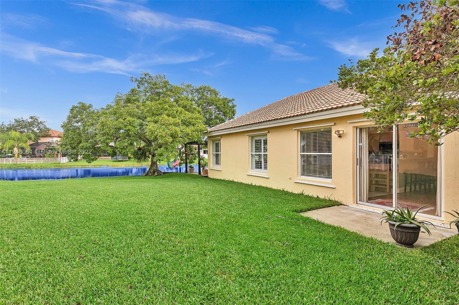 Enjoy tranquil long lake views and relax underneath your pergola while taking in the breathtaking sunsets from this charming 3 bed/2 bath home set on the private oversized 9535 sq ft lot. Enter through the foyer into the spacious main living area which overlooks the generous yard and water vistas. This room is perfect for family gatherings and features vaulted ceilings, Plantation shutters and wood flooring. The kitchen boasts granite counter tops, glass subway tile backsplash, pendant lighting, snack bar and large pantry. This opens to the more intimate family area. Split bedroom floor plan with the master bedroom taking advantage of the beautiful views. ROOF 2019. Hurricane shutters. Maintenance includes basic Comcast cable w/HBO and internet. Must see to appreciate!