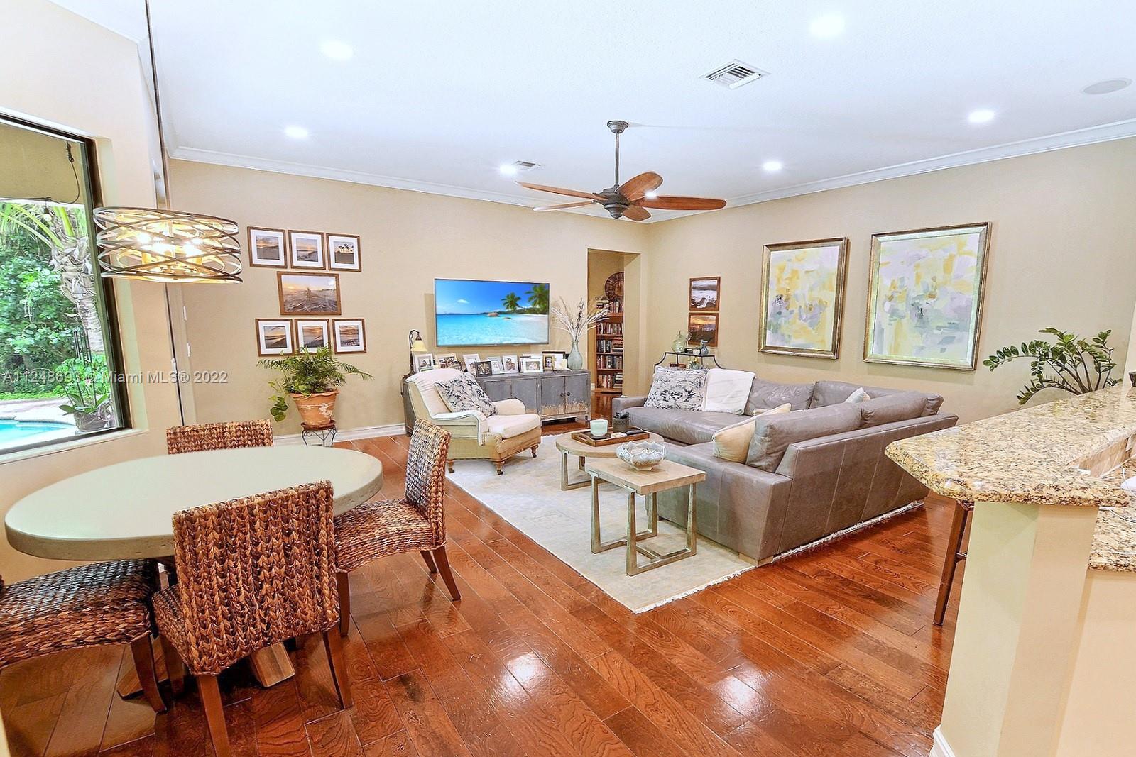 NESTLED IN THE BOUTIQUE GATED COMMUNITY OF THE RANCHES IN SOUGHT AFTER COOPER CITY, THIS MAGNIFICENT 5 BEDS + OFFICE, 3.5 BATHS POOL HOME IS SET ON 17,598 SQ FT PREMIUM LOT FEATURING 3,146 SQ FT OF LUXURY LIVING. STUNNING ANTIQUE WHITE KITCHEN FEATURES GORGEOUS GRANITE COUNTERS, ISLAND W PREP SINK & WINE FRIDGE. DESIRABLE TRIPLE SPLIT FLOOR PLAN. ELEGANT PRIMARY SUITE OFFERS TRAY CEILINGS & DIRECT ACCESS TO LANAI/POOL. SPA LIKE ENSUITE BATH HAS 2 VANITIES, GARDEN TUB & SEPARATE SHOWER. CHIC DECOR, WOOD FLOORS, IMPACT WINDOWS, JACK & JILL BATH & LAUNDRY ROOM W SINK. BACKYARD PARADISE FEATURES A LANAI PERFECT FOR OUTDOOR DINING POOLSIDE. ALL FLAWLESSLY SECLUDED BY LUSH TROPICAL FOLIAGE FOR PRIVACY. 3 CAR GARAGE W ELECTRIC CAR CHARGER. HOA COVERS LAWN CARE. ZONED FOR COOPER CITY SCHOOLS.