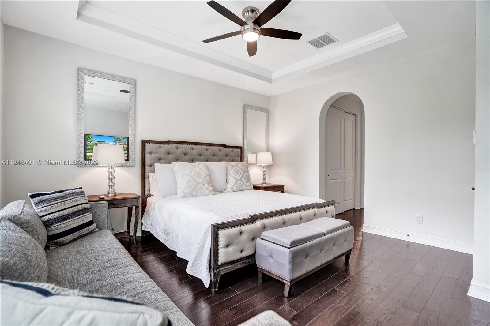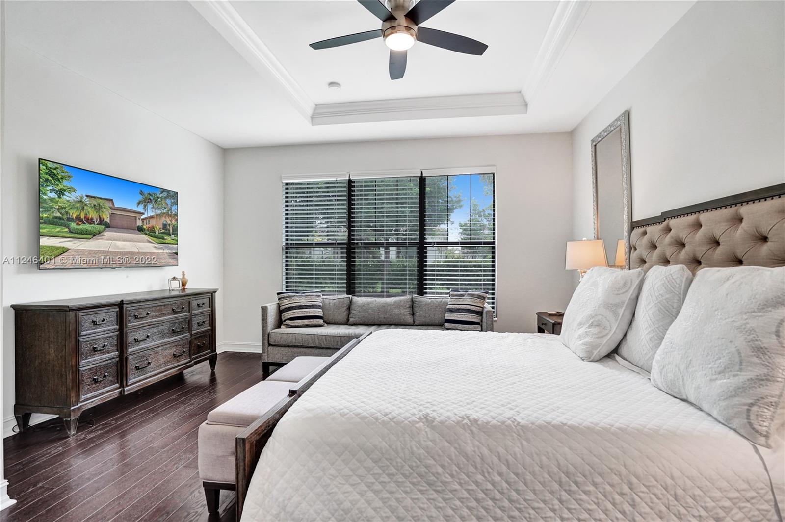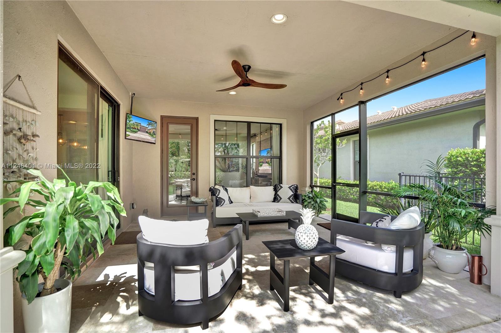 This upgraded Kensington Model offers a triple-split floor plan and features stunning wood floors and coffered ceilings. The chef’s kitchen boasts custom cabinetry, quality appliances including double ovens and gas cooktop, and a breakfast bar with ample seating. The light-filled living room and separate formal dining room are surrounded by a wall of windows and doors and seamlessly connect to the screened Lanai with retractable enclosure. The large, private backyard offers great space to add a pool. The interior offers four elegant and generously-sized bedrooms and three stylish bathrooms. Watercrest is a resort-style gated community with a host of amenities including a clubhouse, pool, fitness center, tennis, dog park and more. Parkland is known for A-rated schools and amenities.