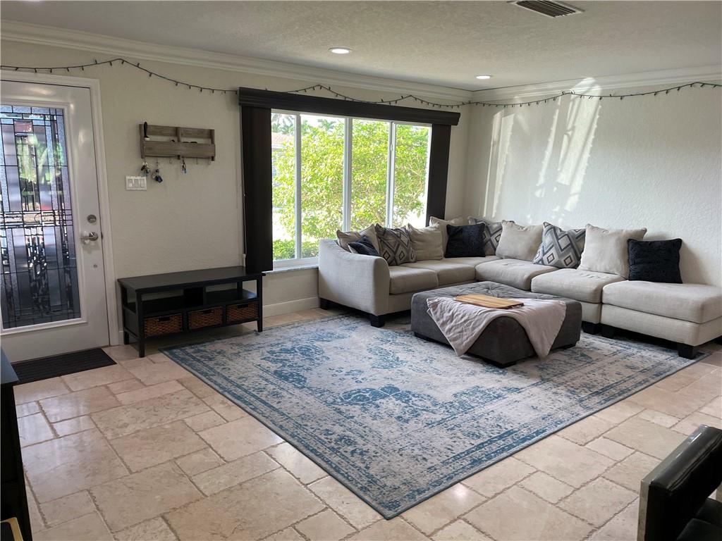 Luxury details in custom designed open concept kitchen boasting an abundance of storage. Large granite top island with additional storage. Travertine flooring throughout main living areas and laminate flooring in bedrooms. Large jet tub in guest bathroom. Double sink and linen closet in master bathroom. Renovated his and her closets in master and guest bedroom. Sliding glass doors in both bedrooms opening up to expanded Florida room with elevated ceilings, projector screen and fireplace. Private view out of large sliding glass hurricane impact doors. Hurricane impact windows throughout home. New roof in 2018. New air conditioning unit in 2016, remains under parts warranty until 2026. Centrally located near I95, the Florida Turnpike and the Pompano Beach train station.