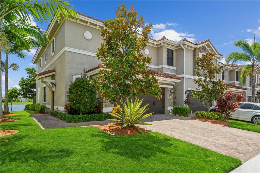 Enjoy the beautiful lake view from this end-unit, 3-bedroom, 2-1/2 bath townhouse in Town Parc at Mira Lago. You can use all the amenities of Mira Lago and Cascata!. This property features a spacious, open, and flexible floor plan downstairs with tile floors. The kitchen has wood cabinets, granite counters, and stainless-steel appliances. Upstairs features 3 large bedrooms with carpeted floors, 2 full bathrooms, and a laundry room. The master ensuite has tray ceilings, a huge walk-in closet, double sinks, and a separate roman tub and shower. Impact glass windows and doors and hurricane-rated garage door provide safety. Enjoy the large community pool and adjacent child play area plus all the amenities of Mira Lago and Cascata—swimming pools, basketball and tennis courts, gyms.