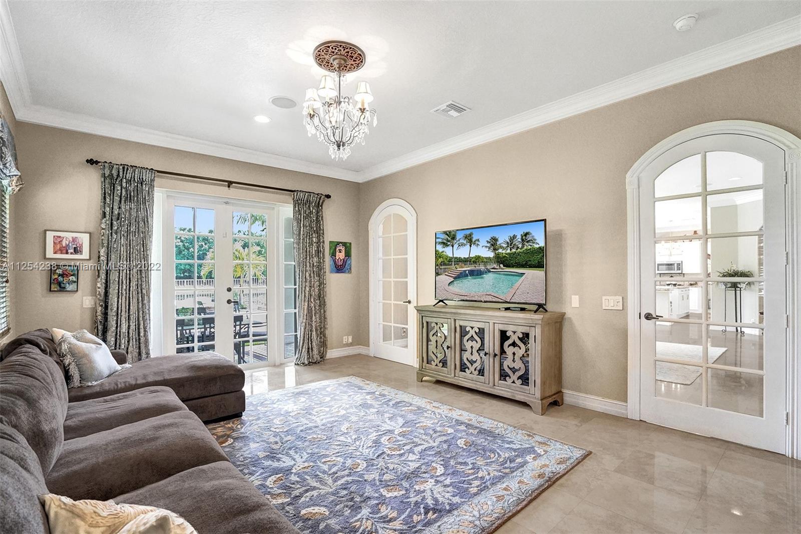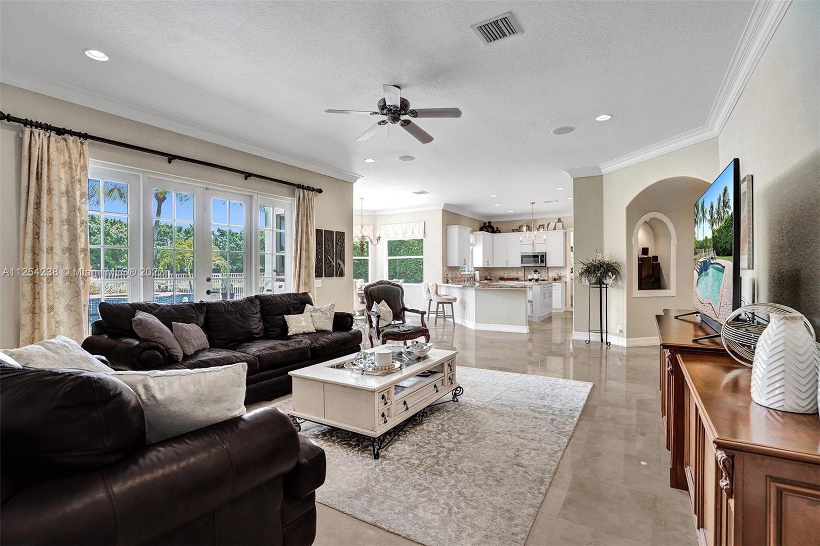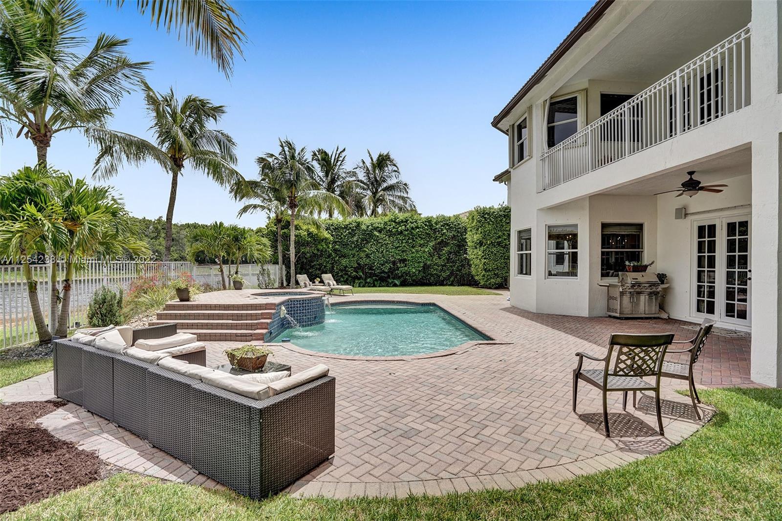Magnificent estate residence in Victoria Isle at Weston Hills CC. 6 bedrooms plus office, 4.5 bathrooms, and sitting room in owner suite w/ private balcony and 3 car garage. Plenty of room for large-scale entertaining w/ spacious yard, ficus hedged landscaping w/ endless lake views and custom pool w/ spa that back into the berm for ensured privacy. There is marble flooring on the first floor and hardwood on the second floor. Gorgeous custom kitchen w/ elegant granite countertops and island, SS Kitchen Aid refrigerator, WiFi enabled double ovens, and wine fridge. Enjoy 2 individual staircases, family room, recreation room, french doors, cabana bath, private 1st-floor den, and accordion shutters. New paint, New $7,000 A/C, light fixtures, extensive crown moldings, custom millwork.