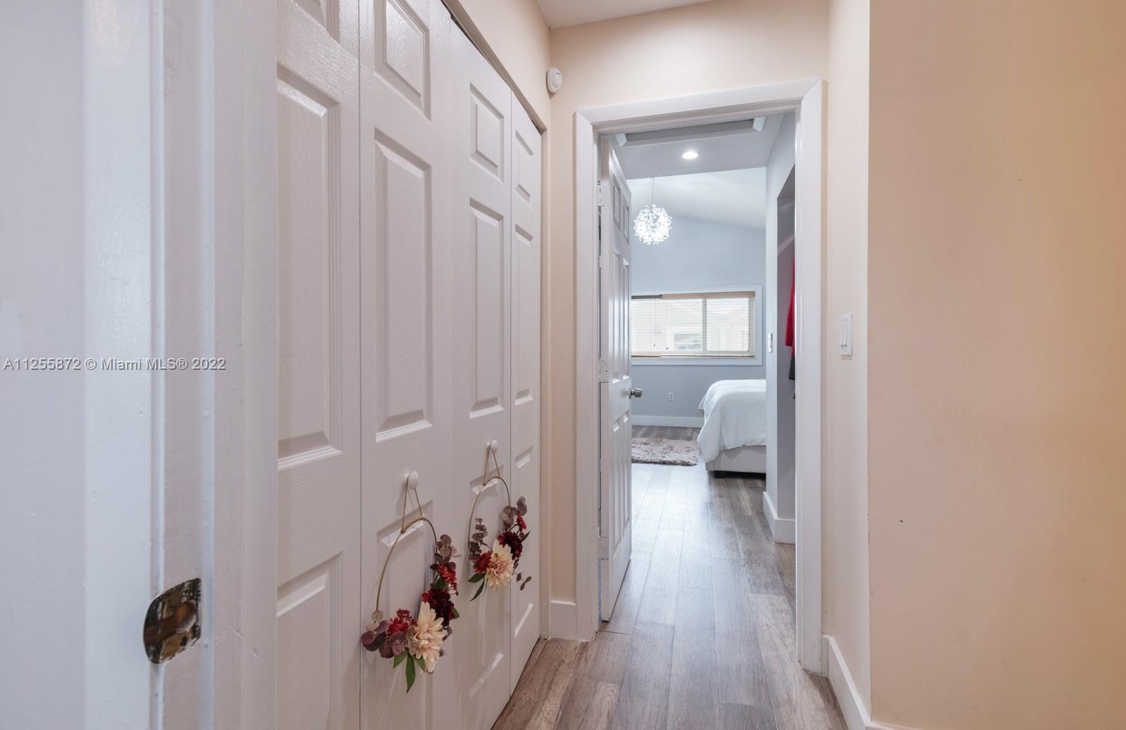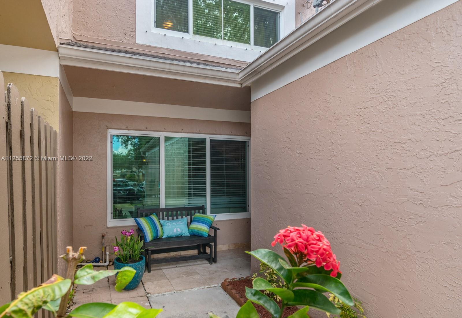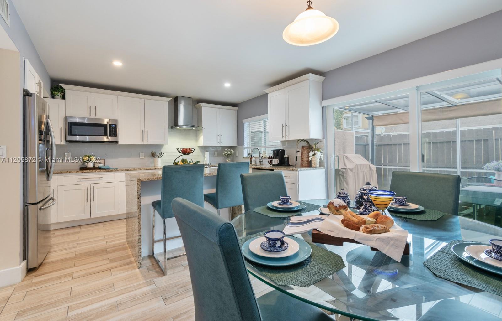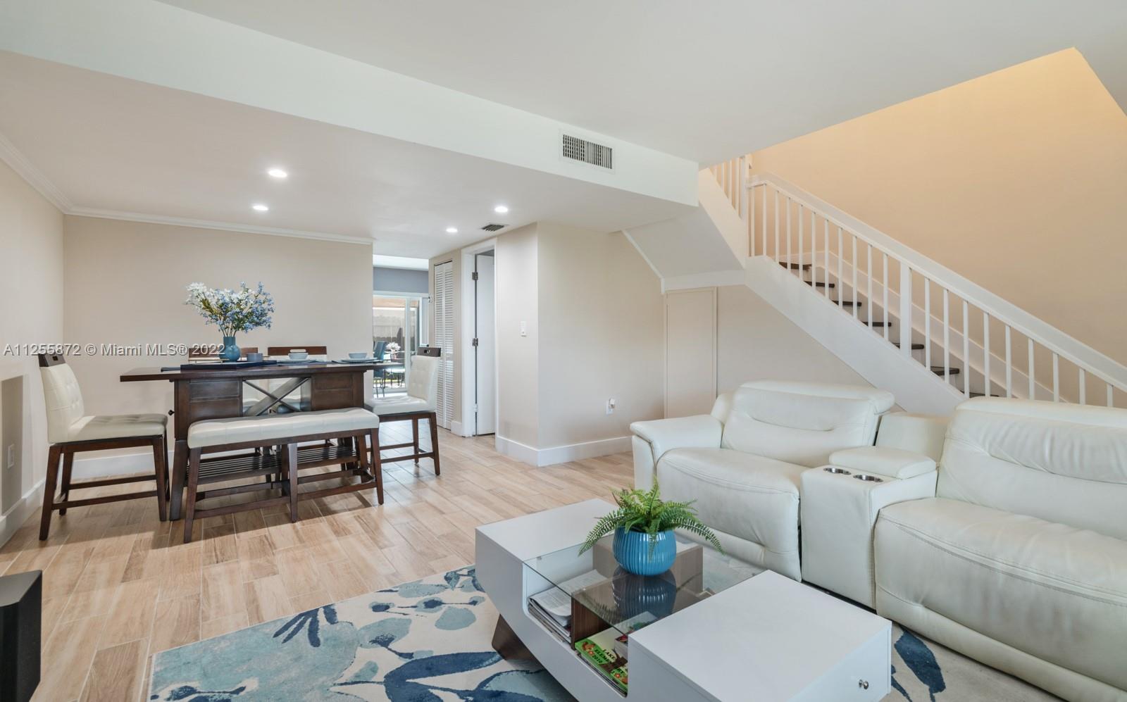 Your future home awaits! Rarely available 3/3 townhome in gated Flamingo Villas. Renovated with NEW modern kitchen, stainless steel, granite counters, 42” cabinets, waterfall island, backsplash, oversized sink. Downstairs features spacious living room, dining area, full bedroom + bath, renovated laundry with new cabinets, ample storage & quartz counters. Closet addition beneath staircase. Upstairs features 2 bedrooms including primary with vaulted ceiling & custom built-in entertainment unit. Popcorn removed + recessed lighting throughout. Custom built-ins in all closets. Back patio upgraded with tile, gazebo & storage. NEW roof, NEW impact windows and doors, NEW screens, NEW flooring, NEW chandeliers, NEW A/C, NEW tankless water heater! Smart home features keyless door & Nest. LOW HOA!