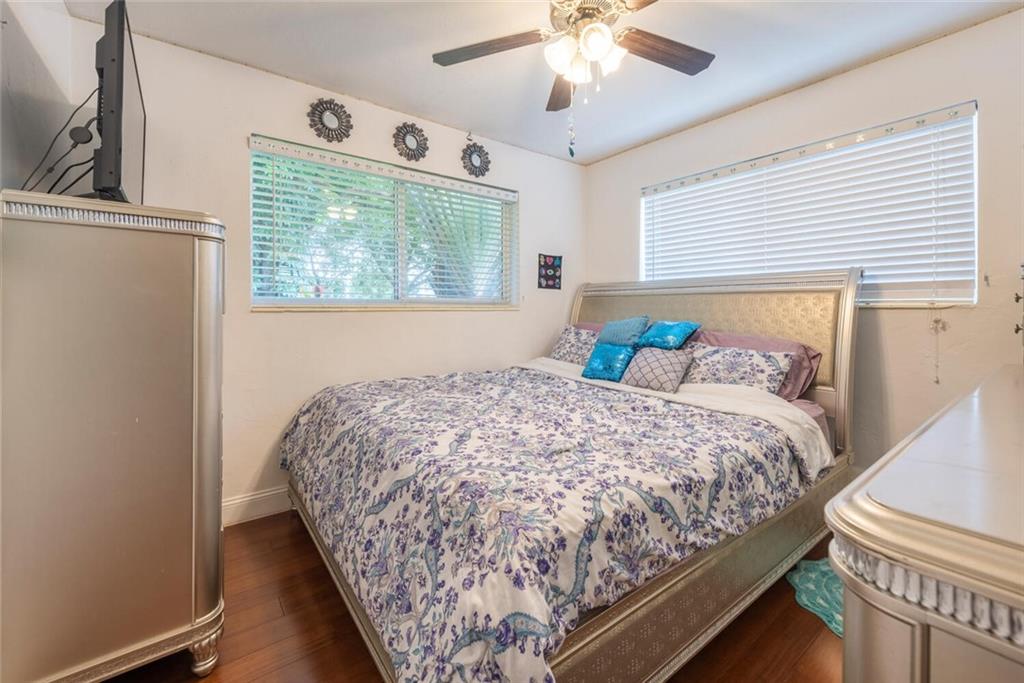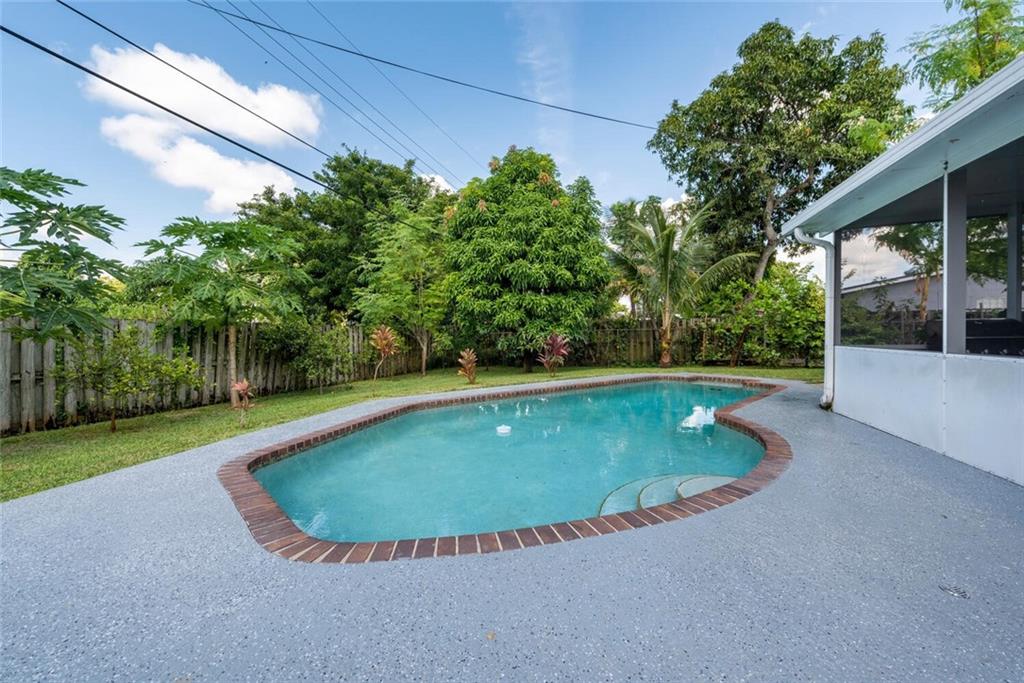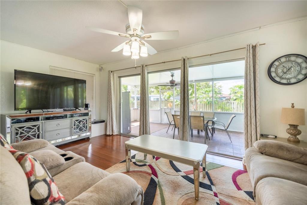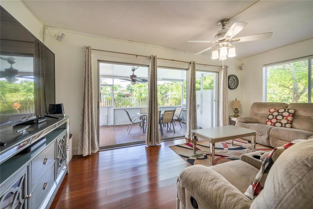 Brand new roof 2022! This beautiful 3 bedroom, 2 bathroom home is move in ready! Features include beautiful wood flooring, White kitchen, Tile backsplash, Granite counters and Stainless Steel appliances, screened in porch, swimming pool and large yard with a tropical fruit garden of Mango, papaya, avocado and jack fruit trees plus lemon and orange bushes! Great space for outdoor entertaining! NO HOA! Beautiful Golf course view from your relaxing front porch. Side yard features slab for special storage. Great neighborhood schools! Don't miss this one! Walk in and fall in love!