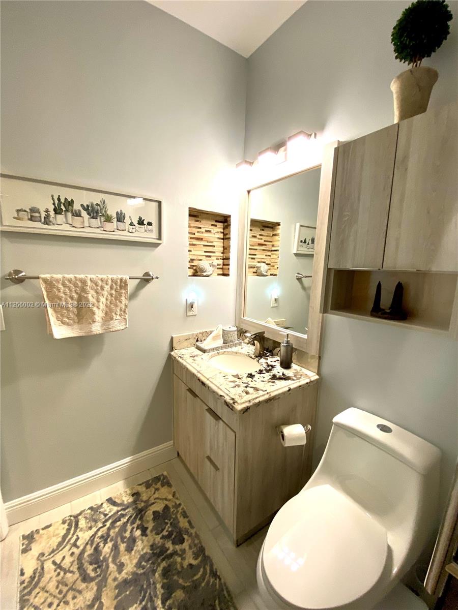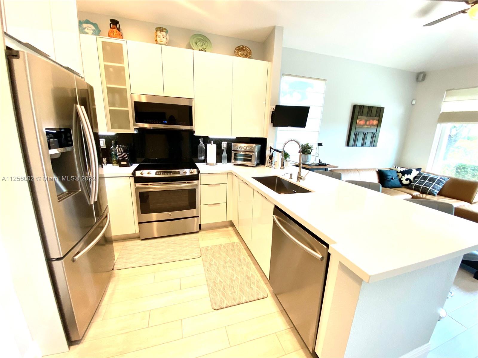 Completely updated - one story townhome. 3 Beds/2Baths+Family room+1 car garage, open kitchen, new stainless steel appliances, quartz counter tops, Italian white cabinets, recessed lighting, pantry. New tile floors in living/dining room. Master bath fully updated, dual sinks, granite counters, glass shower sliding doors. Built-in office space, laminate floors in bedrooms & walk-in closet. Custom made doors in laundry+ guest bath. Natural light flows through the windows in this unit; high impact windows & hurricane shutters. Built-in awning in the patio. Extra-sized premium lot. Walnut Creek, a resort style comm. offers a bike/jog path, business center, clubhouse, gym, pool, tennis courts, spa, gated, 24hr. security! HOA includes Premium TV cable/Internet. No HOA approval required.