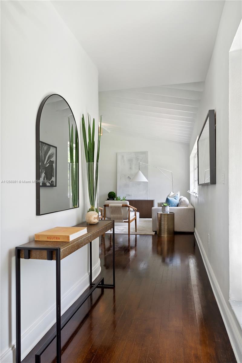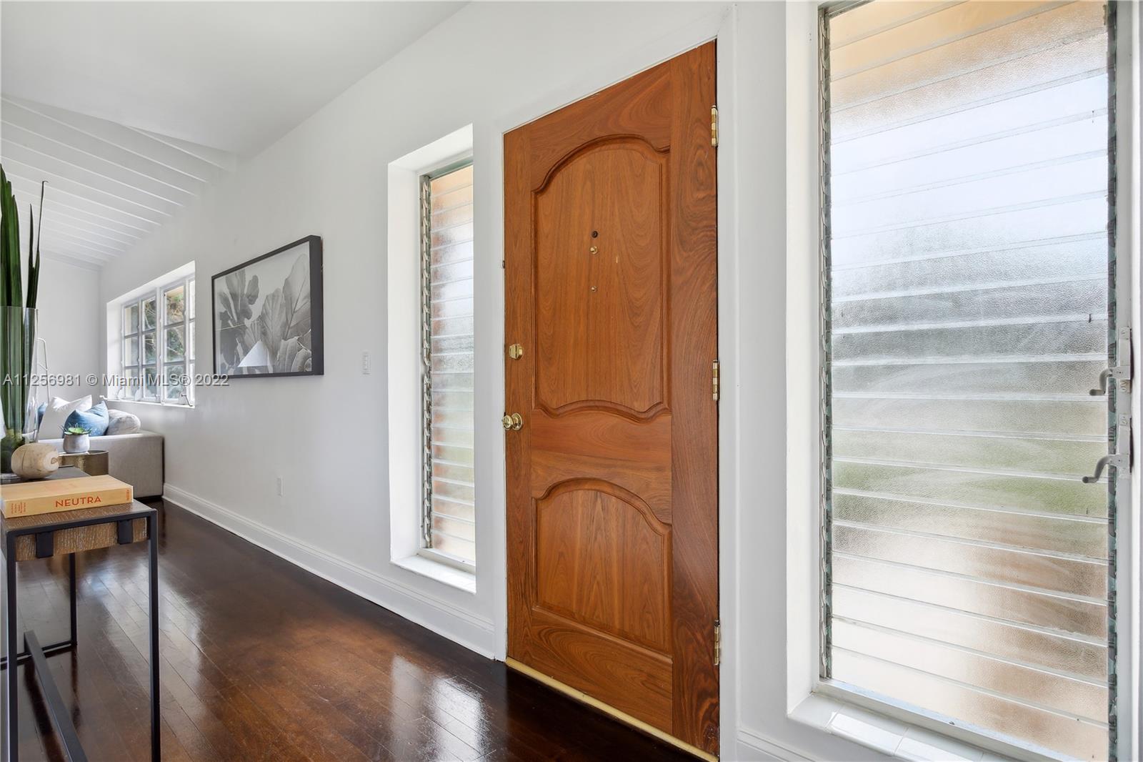 Charming mid Century Florida style home. Situated in the sought after French Village area this corner bright residence with gleaming wood floors, exposed white beamed ceilings in the grand room and surrounded by nature offers a romance between charm and functionability.