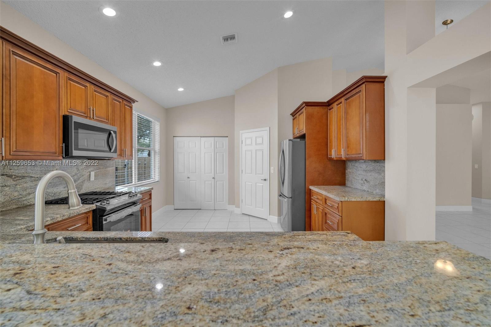 Superb updated 3 BR, 2 bath home with fenced yard in resort-like Pembroke Falls. Beautifully remodeled wood cabinetry, granite counters, stainless steel kitchen with brand new gas range. Vaulted ceilings, split BR floorplan, A/C new this month, new top line washer and dryer, newer gas water heater, grill hookup, laminate flooring. Glass doors, windows open to covered patio, spacious fenced yard with no neighbors behind. Community amenities include pools, clubhouse, tennis, four 24/7 manned gates. HOA fee includes high speed internet, cable and ADT home security. Great Pembroke Pines schools, close to parks, shopping, dining and I-75 for easy commutes in every direction.