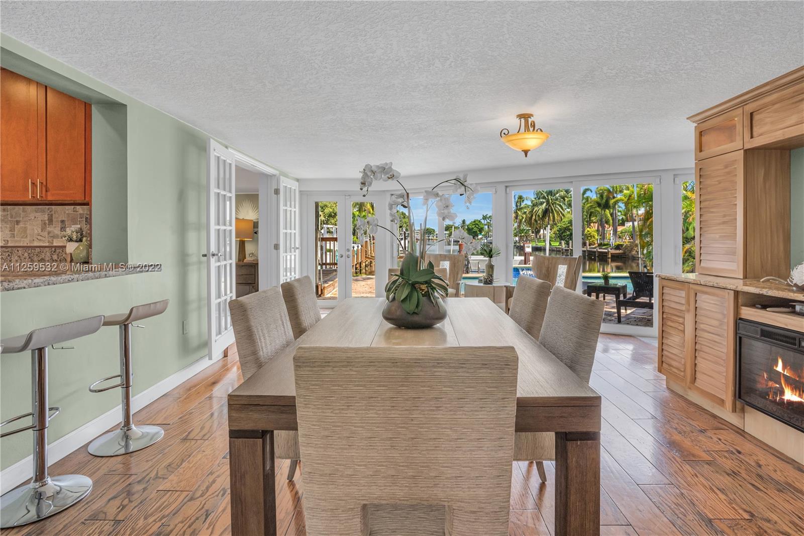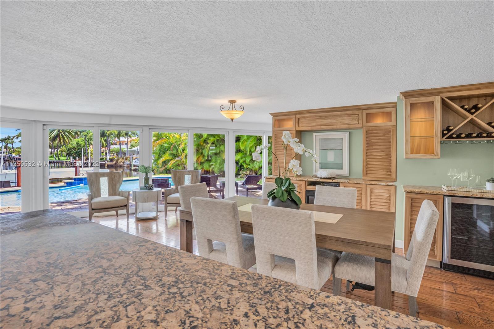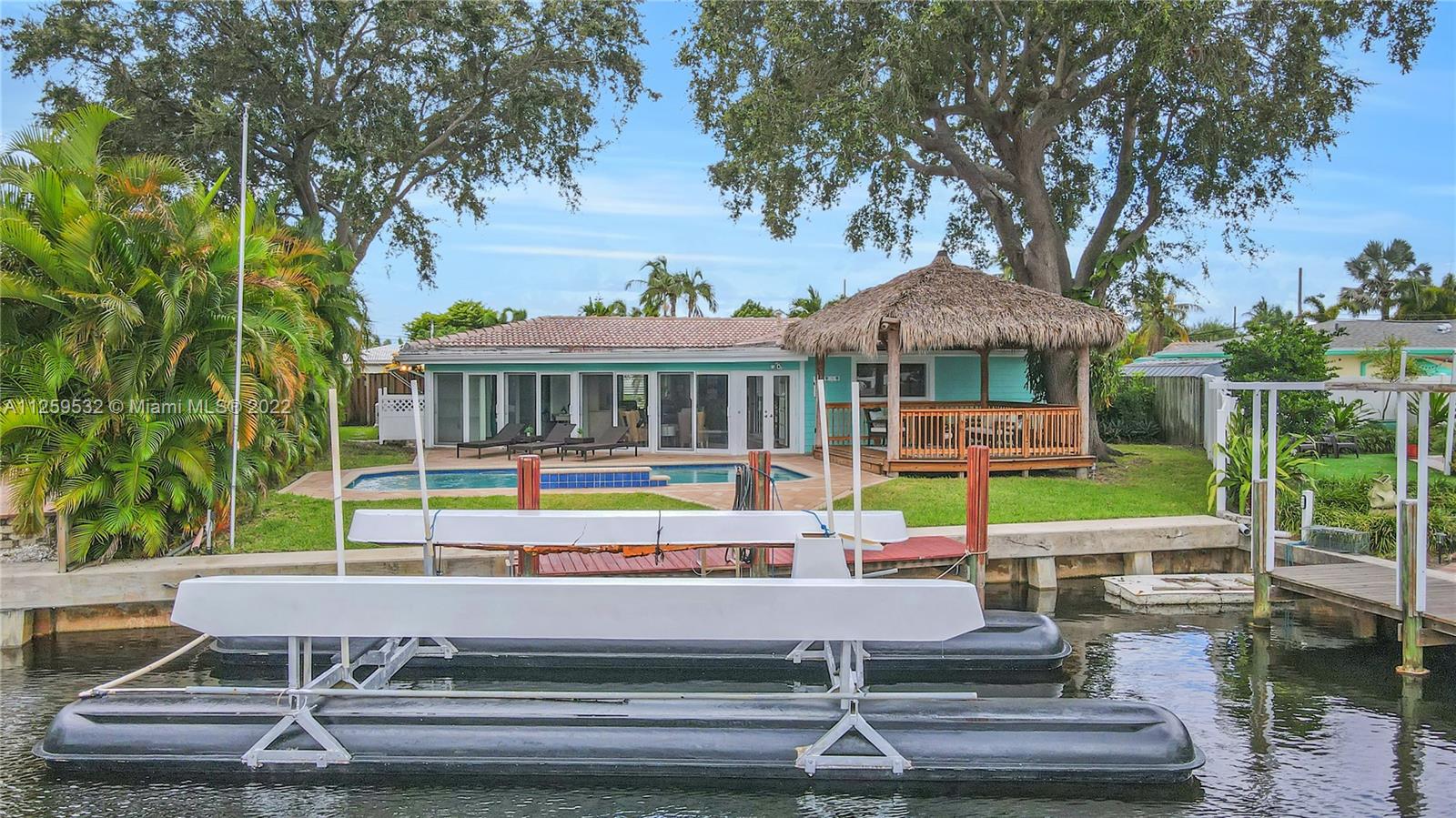 Charming updated waterfront pool home in Pompano Beach! Stunning water views from almost every room, wood & tile floors throughout the living areas w/ great natural light. Well-appointed kitchen w/ granite countertops, solid wood cabinetry, stainless steel appliances & open bar to the dining room. Double master suites, w/ large walk in closets & private bathrooms w/ the main featuring jacuzzi tub, extra large shower & double vanities. Indoor outdoor living under the waterfront seminole tiki hut, saltwater pool w/ waterfall & patio that opens from the wall of impact glass doors. 55' of waterfront, 2016 seawall, dock has 60amp hook up, quick ride to Hillsboro Inlet, closest fixed bridge being raised by +/-27". Full home generator included. Close to the beach, shopping, dining, and new pier