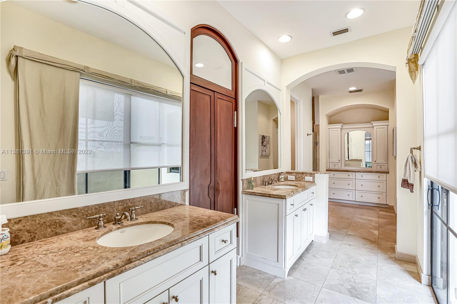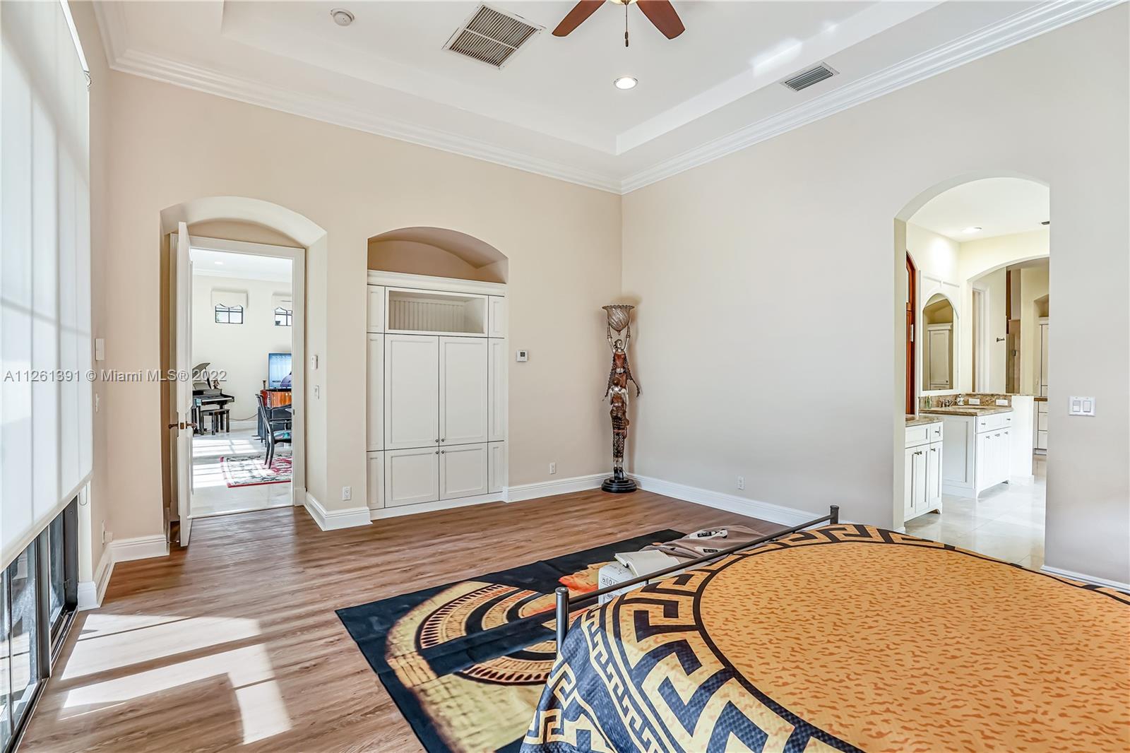 To be featured on HGTV House Hunters! Beautiful airy expanded one story ranch DeSoto model on oversized lakefront private lot with salt water pool, spa and travertine pavered fully fenced backyard and courtyard. Home has beautiful contrast gourmet kitchen w. Wolf appliances and SubZero cabinet-front refrigerator, office, formal dining room, oversized walk-in custom closets, all impact windows and doors, new composite wood floors, freshly painted and 2-zone central A/C system. Separate private guest house - 1 bed, full bath, kitchenette, balcony and separate central A/C. Pavered drive and 2 car garage - 1 garage for main house and 1 for guest house. All while enjoying magical life at gated Parkland Golf & Country Club - private golf course, restaurant, bar, gym, activities and more!