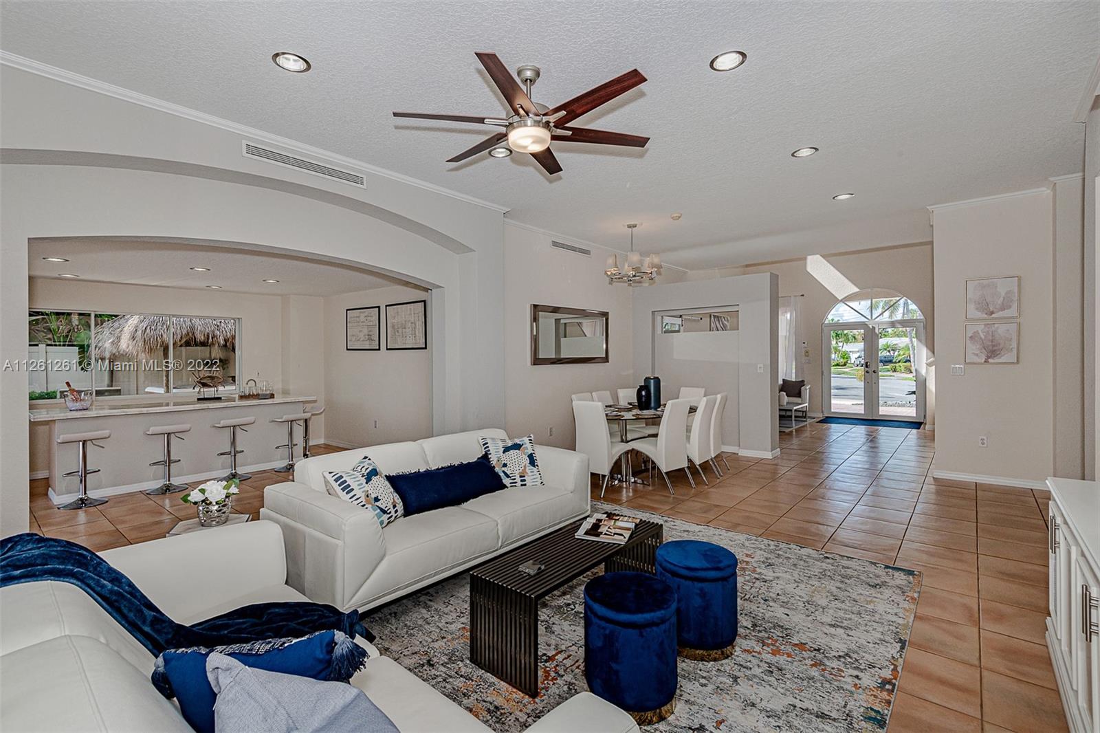 Live a LUXURIOUS LIFESTYLE in this modernized Estate located in Garden Isles! YES, YOU CAN HAVE IT ALL! COMPLETELY FURNISHED-110ft Deep-water cul-de-sac Pool home w/ a 100-foot dock-This Majestic Two-story, elegant estate welcomes you w/ a grand 20 Ft foyer- Inside: volume ceilings & gorgeous staircase all while offering an expansive floor plan featuring: a spectacular formal living, a formal dining leading to the gourmet kitchen, spacious family room w/custom wet-bar, private Master Suite on 2ND level & resort-style bath & Den. Downstairs: Another Master Bedroom w/Bath & 2 additional bedrooms & 1 1/2 Bath. Outdoors is an entertainer's dream w/a cascade pool, outdoor dining & Tikki Hut. Approx:7 min drive to Beach-10 mins on boat to Main Canal & 30 mins to open water-NO FLOOD INS REQUIRED!