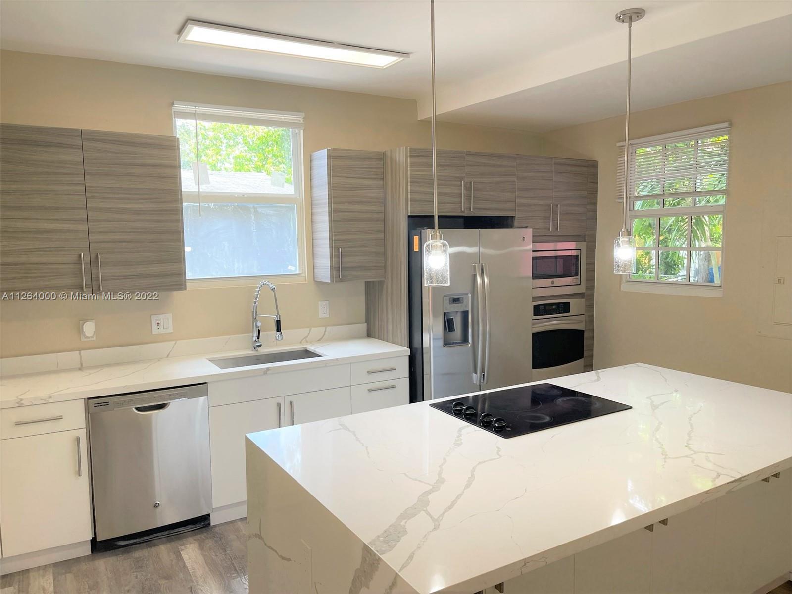 Wholly remodeled huge 4 bedrooms/2 1/2 bathrooms home in a corner double lot in Hollywood. Upgrades galore, Impact windows and doors offer tons of natural light, two-zone new A/Cs, a Beautiful open concept kitchen with Quartz countertops, custom-made cabinets, and S/S appliances. LED lights, freshly painted in and out, modern bathrooms, fireplace, waterproof vinyl floors; this unique modern classic house is a GEM, more than 2200 sq ft under A/C, with dining, living, family rooms, laundry, covered garage, social area with a pergola. Oversized lot with room for a pool, park more than ten vehicles. The buyer will not be disappointed; just bring Your Toothbrush. The primary bedroom and large bathroom are on the first floor
