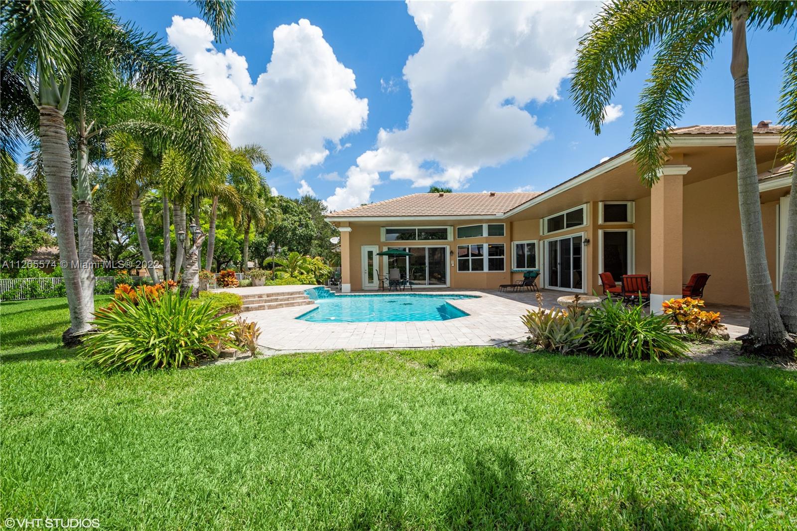 The dream location represents the epitome of opulent living. The estate sits on an oversized lot in a 24-hour man-gated community. The incredible floor plan of this home is open, functional and includes a master suite with a grand hallway, make-up area, and a regal closet; a children's and guests' wing with three spacious rooms, an office with a closet, chef’s kitchen with pantry, seated bar area, surround system, pool, full home generator with 1,000 - gallon gas tank, security cameras, impact windows - kitchen | dining area and accordion shutters. The enormous parking spaces, include a 3-car garage, two separate parking areas, a front porte-cochère, a circular driveway with a water feature and side entrance paved parking for the vehicle fanatics.