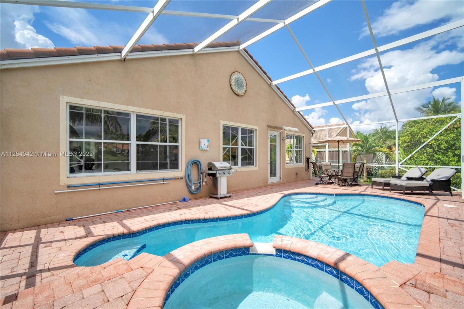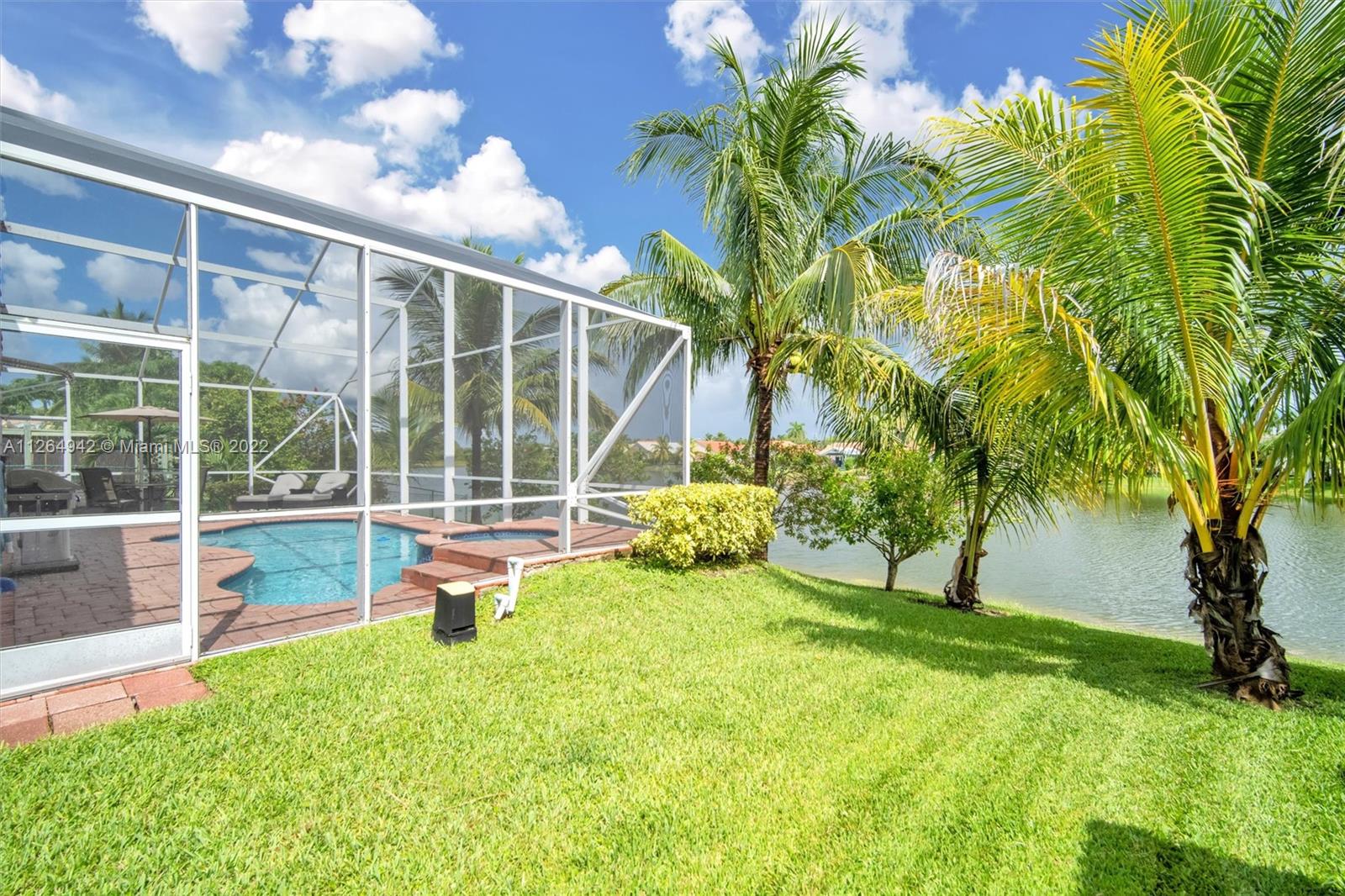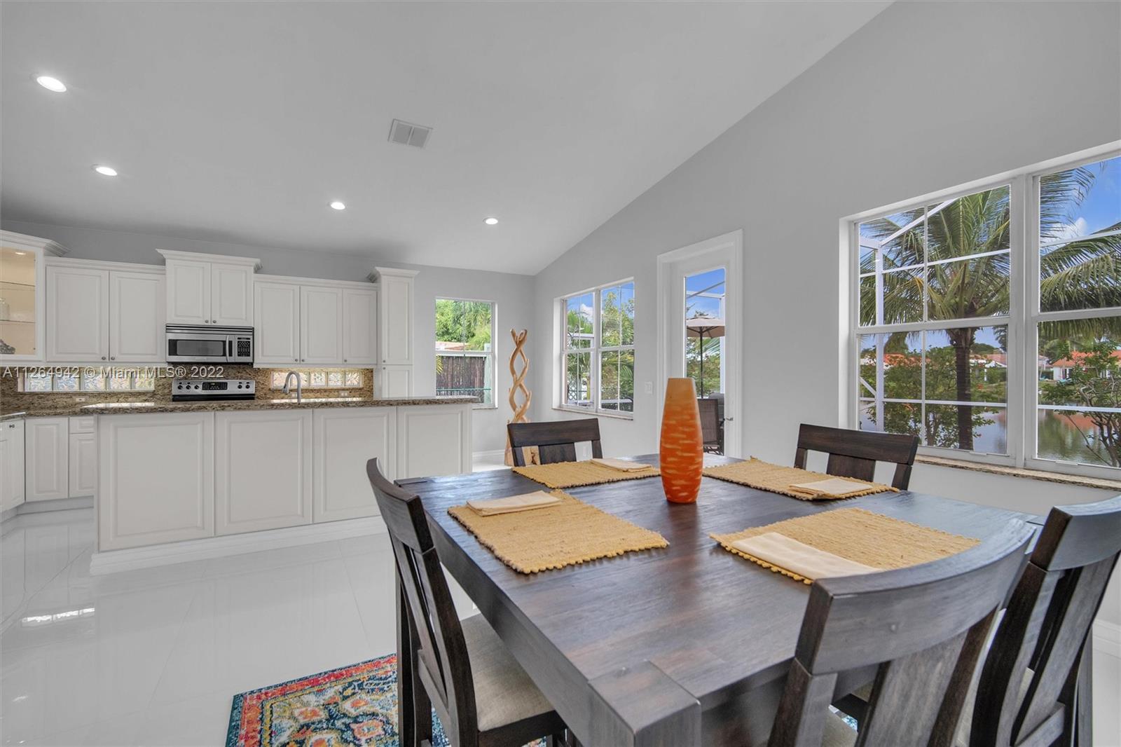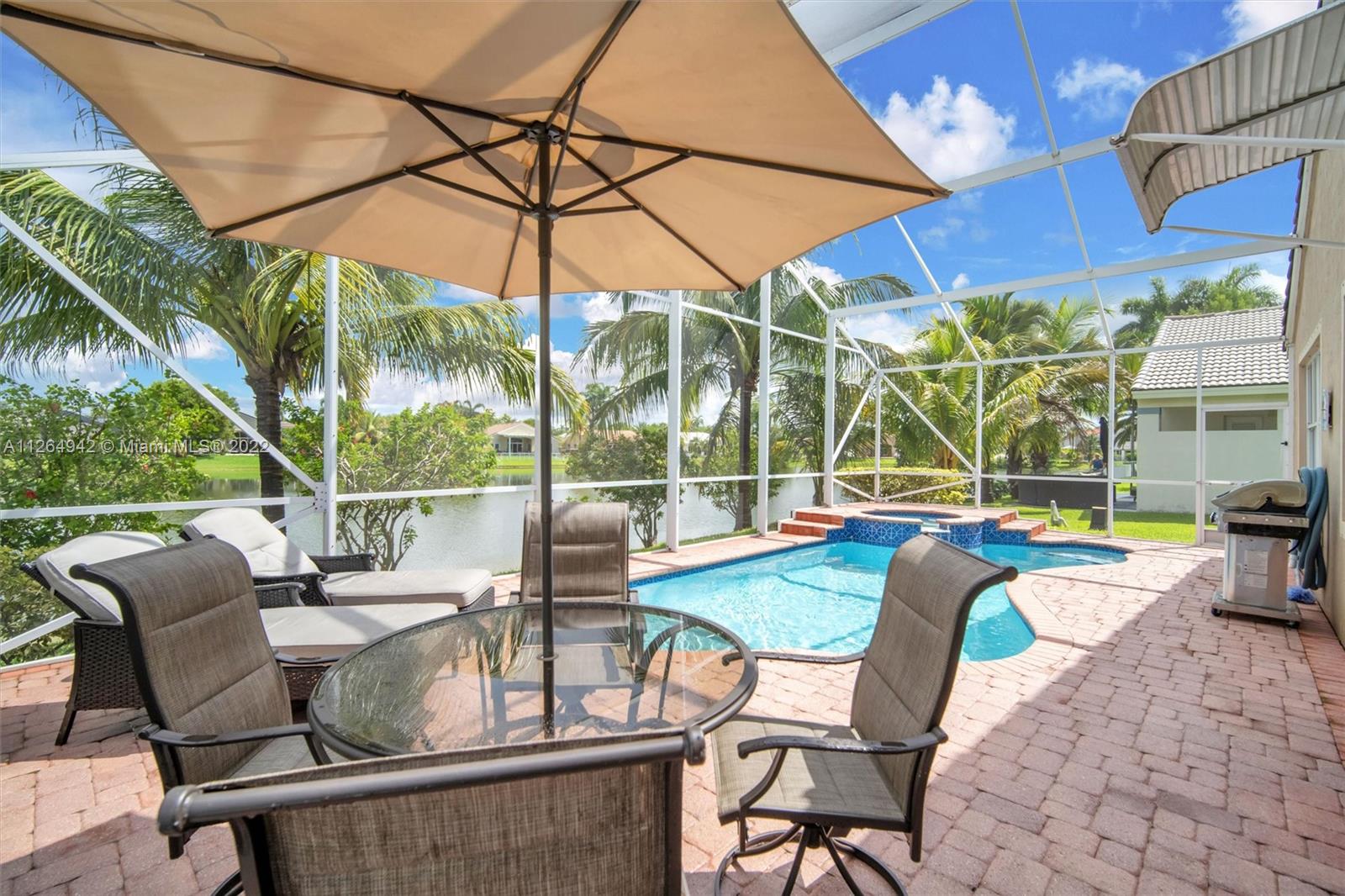 Extremely clean, POOL & LAKE home with an open eat-in kitchen complete w/ wood cabinets, granite countertops, & SS appliances. You’ll love entertaining your family & friends inside this bright & airy floor plan with its separate living, dining, and family room areas. Relax in your fully screened-in pool w/ spa that overlooks the peaceful lake. Interior features include 32x32 tile that adorns the living areas with wood flooring in all the bedrooms, a Primary suite that overlooks the pool & lake and an upgraded bath with separate vanities and its own Roman tub. Exterior features a covered foyer entry, pavered patio, and tasteful, mature landscaping that surrounds the home. Pembroke Shores is a guard gated community that is located near I-75, parks, golf, restaurants, shopping, and schools.