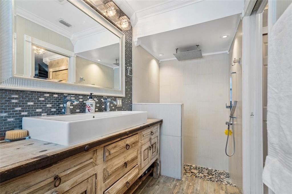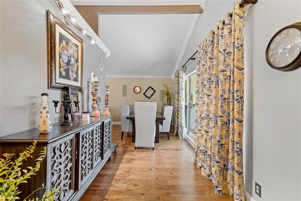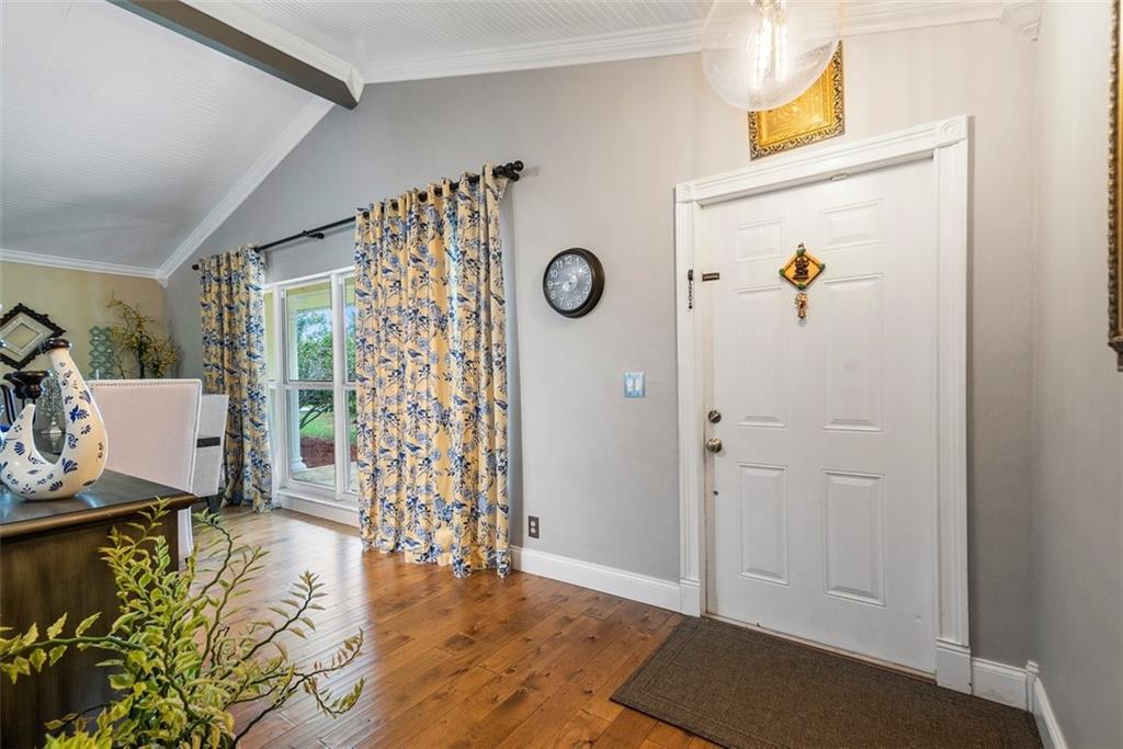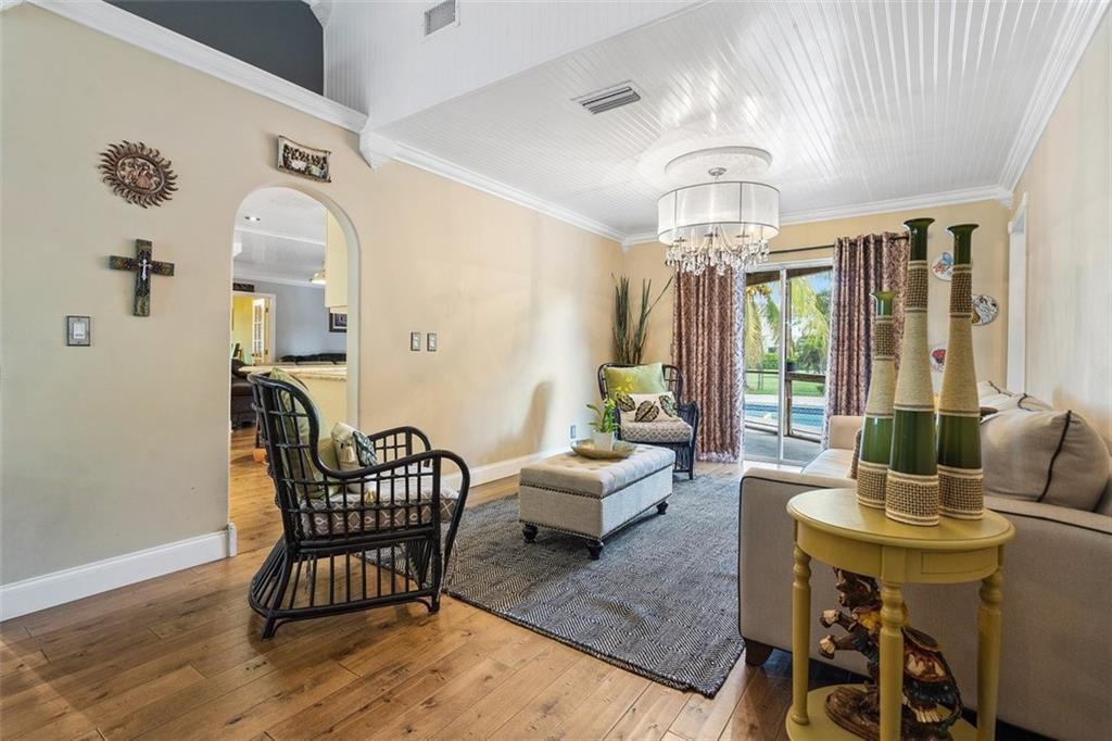 Beautifully updated home sited on an expansive waterfront lot offering privacy and plenty of room for outdoor enjoyment. A welcoming front porch and circular driveway & manicured landscape make for an idyllic curb appeal. The updated interior is light airy with high vaulted ceilings and oversized windows. Glorious wood floors throughout all living areas. Jaw-dropping crisp white kitchen with huge island, granite, and gas stove. The primary suite is spacious and has a gorgeous bath. Outside is a pool, a large screened porch, and serene water views. Flex room can be 5th bedroom, office or den. Some impact windows.