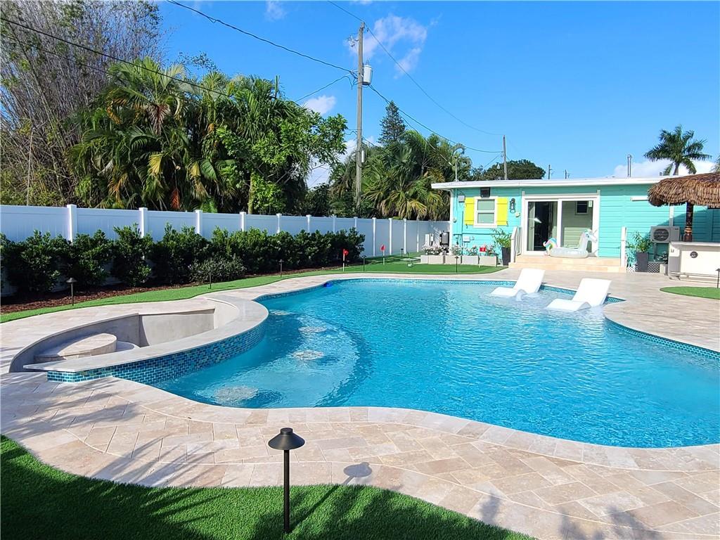 Beautiful, Bahamian-style house with a large, impressive back yard and tons of curb appeal. 3 beds/2 baths all on the same level. Recently renovated with state-of-the-art touches. New Kitchen with Quartz counters, new black stainless appliances and flooring. Gorgeous resort-style backyard with private putting green and a large, (20x35) free form heated salt pool with a sun shelf and swim up bar. Desirable and rare Miami-Dade pine flooring throughout. New roof in 2021. All impact-resistant windows and doors. Convenient mini split A/C systems (newer) for temperature control by zone. Make this your paradise homestead OR continue running this successful vacation rental property, all furnishing will convey with the sale.