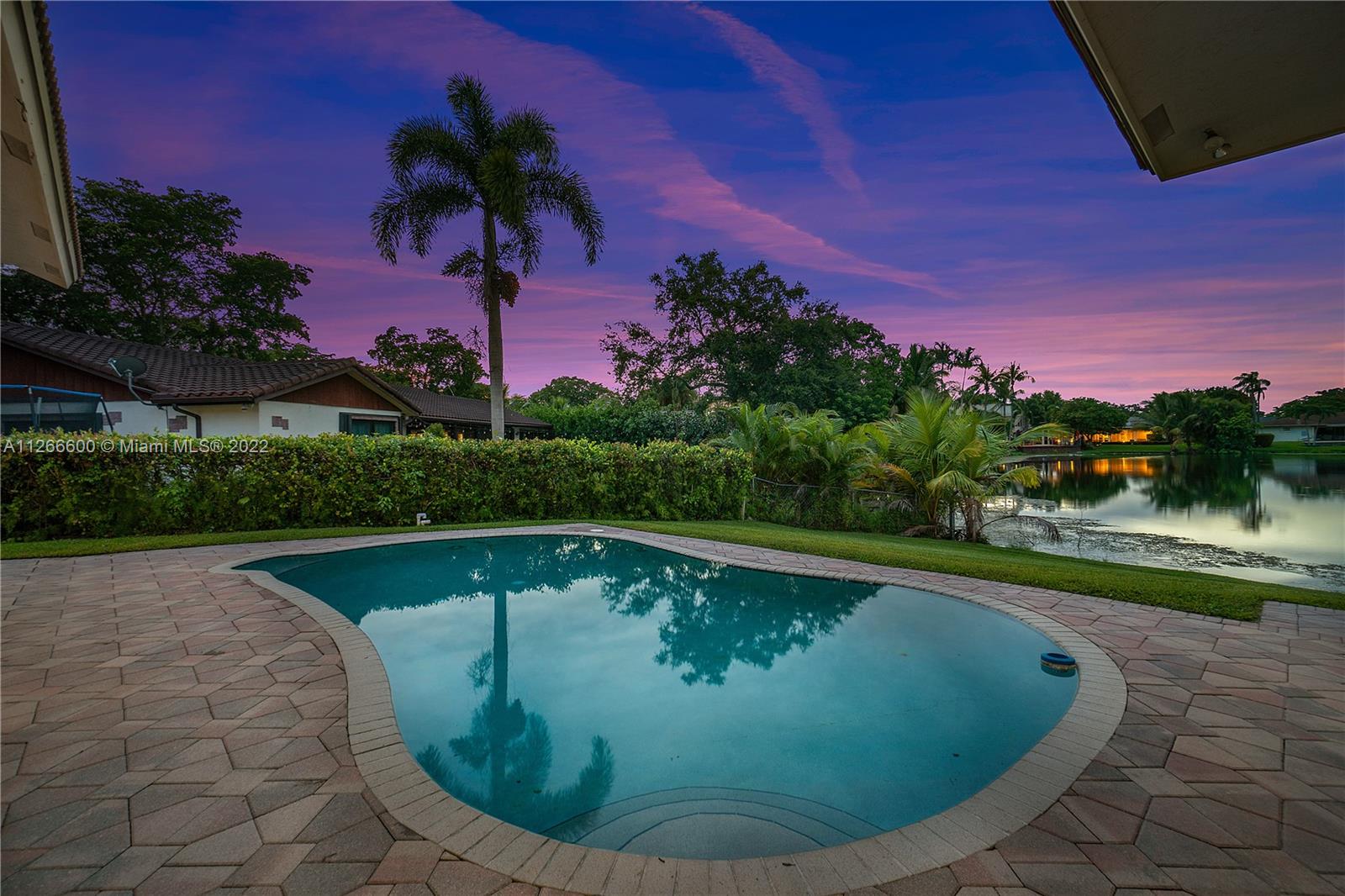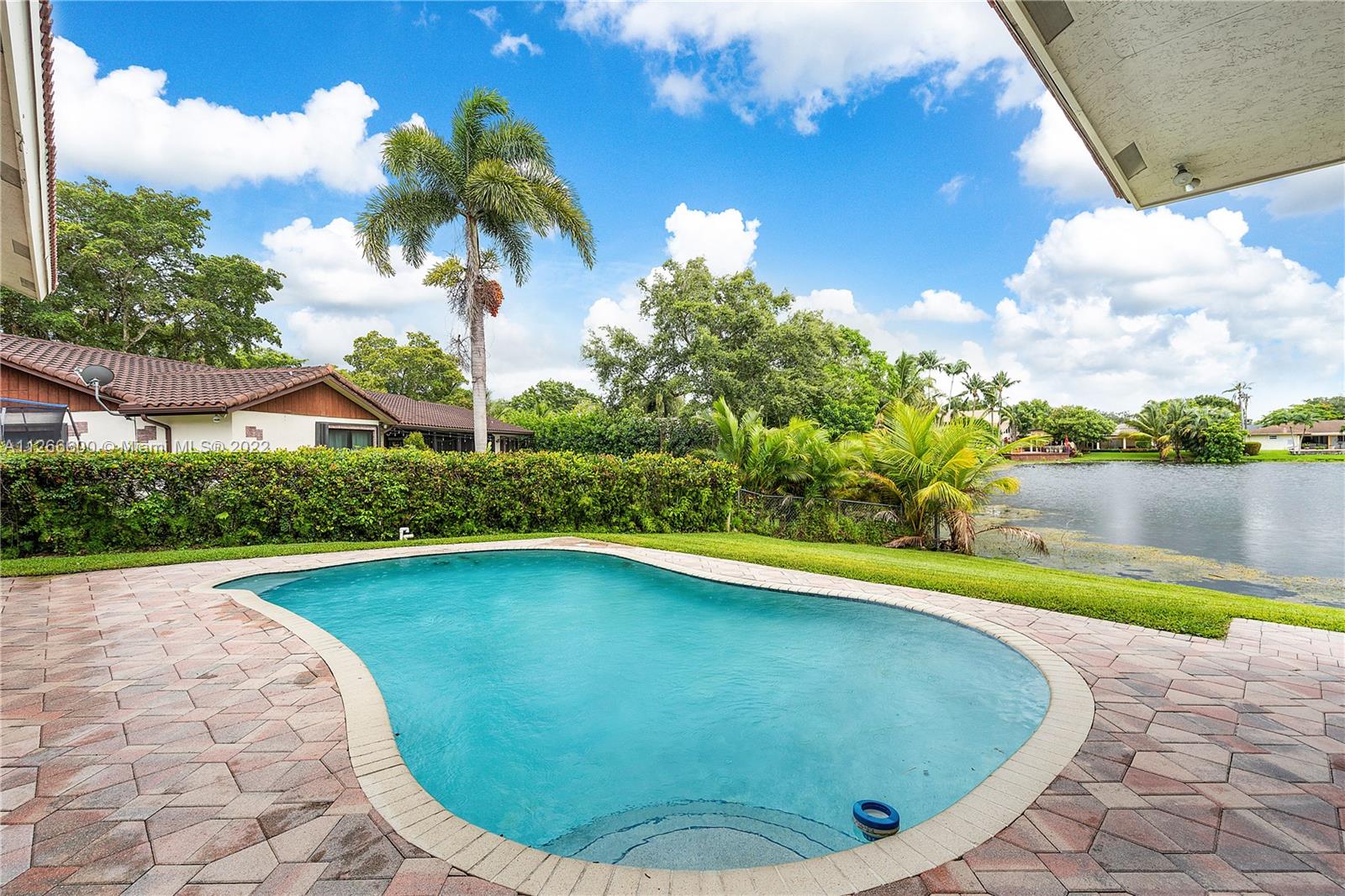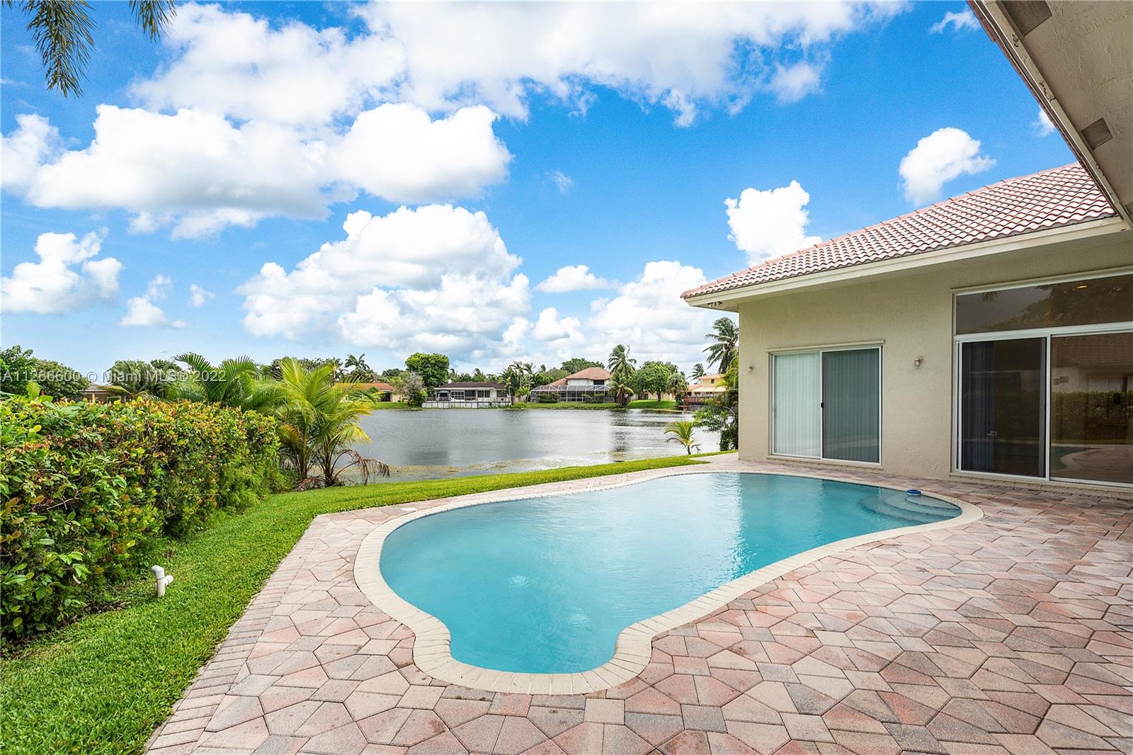 This elegant lakefront home in Jacaranda Country Club is only a 5-minute walk to the golf course, clubhouse, and restaurant. With large windows, crown molding, and high ceilings, it is light and airy throughout. The spacious living area has beautiful views of the lake, backyard, and pool. An entertainer's kitchen includes double ovens and plenty of counter space. The master suite has a spacious Jacuzzi tub, large shower, and walk in closets with built- in cabinetry. The house also includes an exercise room, office, and a security system with cameras and a safe in the closet. This home provides a calming oasis that still maintains contact with the city only a short drive away. New carpeting to be installed 9/2. Homeowner warranty on all appliances and pool pump for buyer.