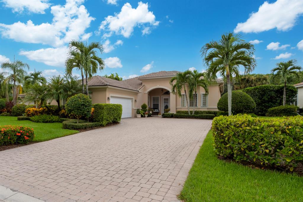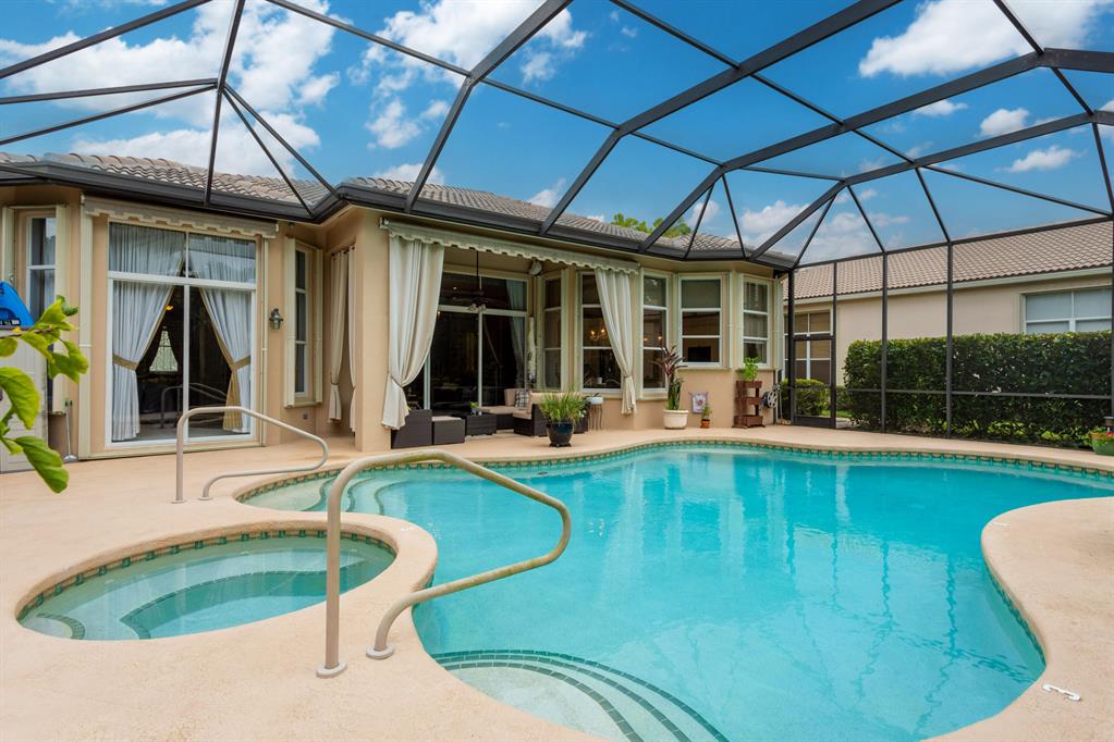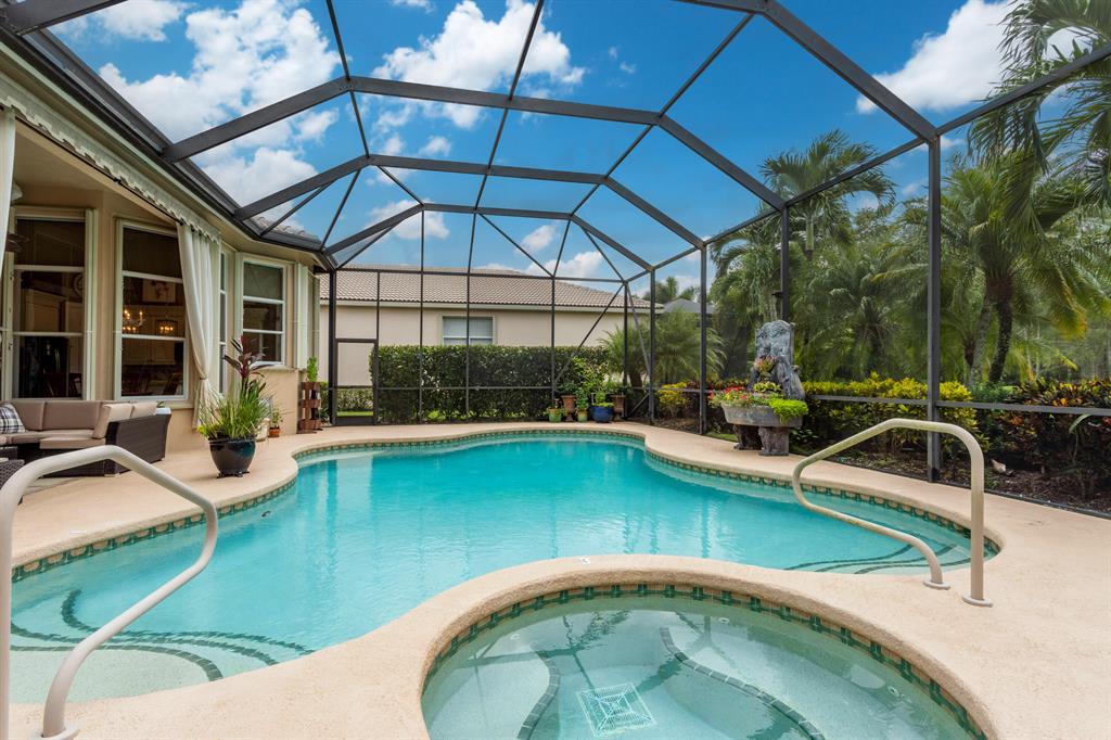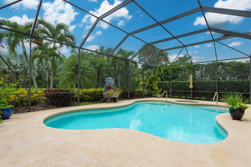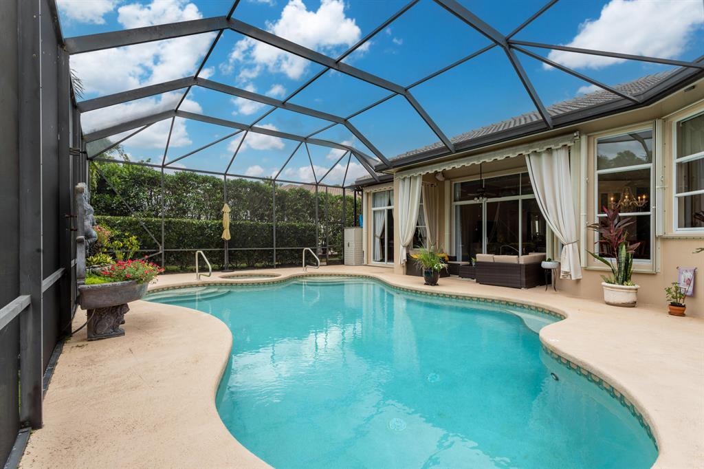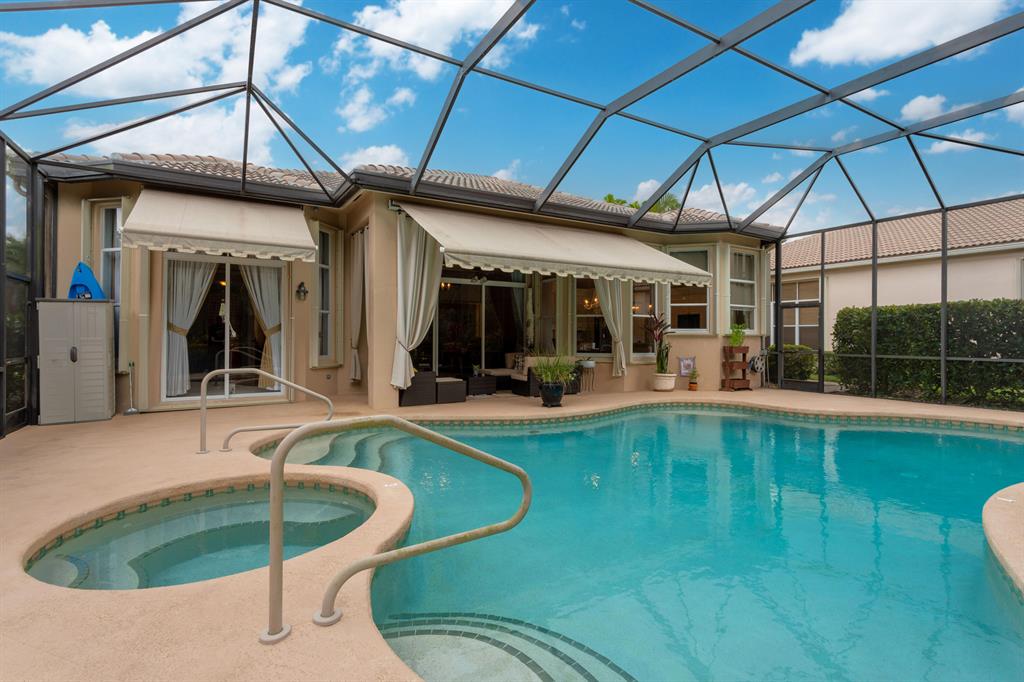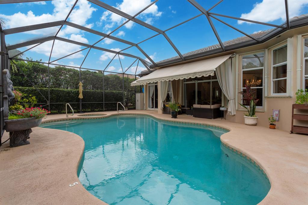 Country Club living , WITHOUT the mandatory membership fees. Meticulously maintained 2,215 SF 3 bedroom 2.5 bath home with 2.5 car garage . Room for 2 cars plus a golf cart! Many upgrades in this Pool home located on a 16,117 sf lot with amazing custom lit landscaping, Salt system pool is phone app enabled. Enjoy the shade from 2 powered retractable awnings as you sit by the pool and hot tub. Interior features many upgrades. Master suite plus a 2nd suite! Granite counter tops and Island, custom cabinets. Crown molding in all living & bedrooms, upgraded flooring, powered window blinds in kitchen area. Upgraded lighting, master bath and more. NO pet restrictions, NO approval process. Yes , all drapes stay! Lawn and landscape trimming covered by HOA. Complete accordion hurricane protection.