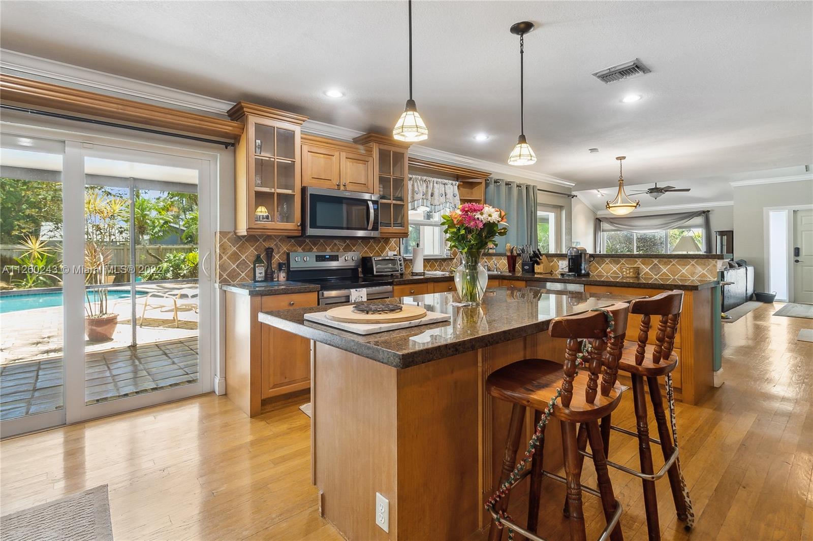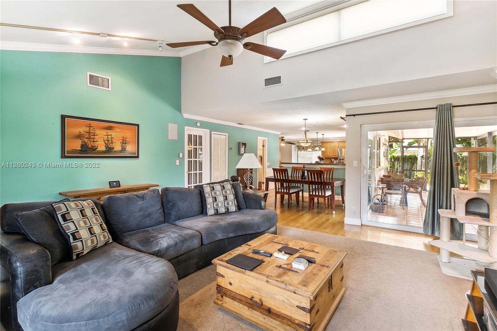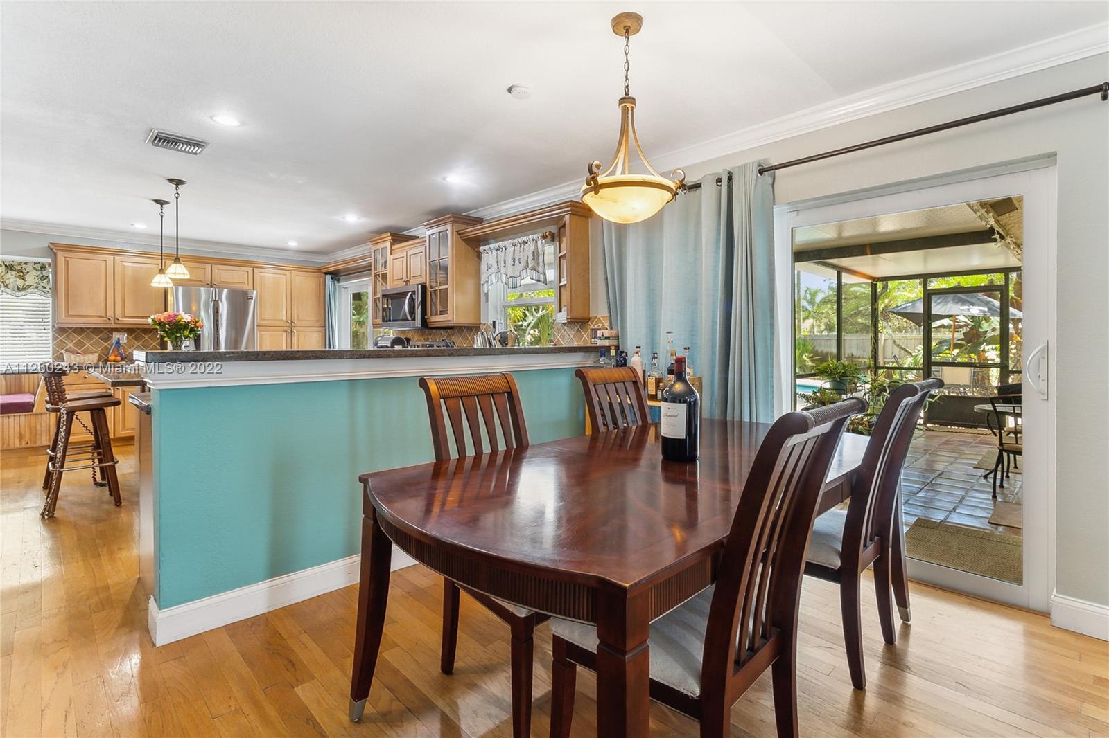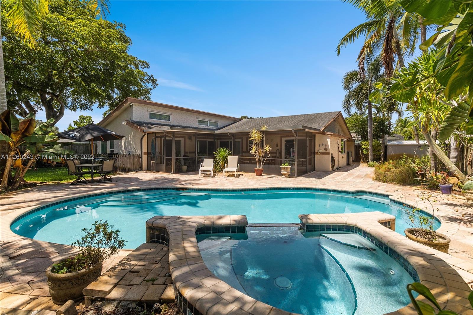 Move-in Ready Bright & Spacious corner lot pool home with impact windows and Vaulted Ceilings, Split bedroom plan. Wood Cabinets, Granite Counters, Stainless Appliances. Built in breakfast nook compliment's the kitchen. Wood Floors in Living Areas, 5" Baseboards and crown molding. Screened-In Patio, Salt System pool W/Hot Tub. Ample Storage Built-In's! Updated Master Bath:Custom Cabinets, Double Sink, Double Shower. Movie Room/2-Car Garage w/AC. Private Fenced yard and ample space. Storage Shed.