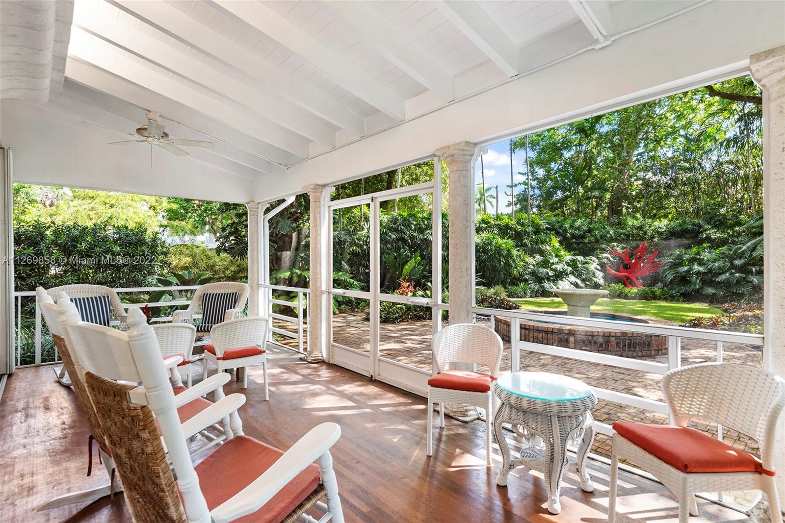Live the Grove lifestyle w/the luxury of Gables services in this lovely, extensively remodeled/enlarged family home. Sitting atop a limestone ridge 21' above sea level, its Caribbean-Colonial style exudes charm & easy living w vast, wrap-around covered porches perfect for coffee or cocktails. Designed by an owner/architect, updates include impact windows/doors & full house generator. Interior features include 3 en suite bdrms (primary boasts His&Hers baths & closets), formal living & dining rms, eat-in kitchen, 2 family rms, lge library/office & wood-burning fireplace. Classic breezeway connects to a 2.5 car-garage designed for an easy conversion to guest quarters, artist’s studio or gym. A lush Raymond Jungles landscape/hardscape distinguishes this gracious residence. Welcome home!