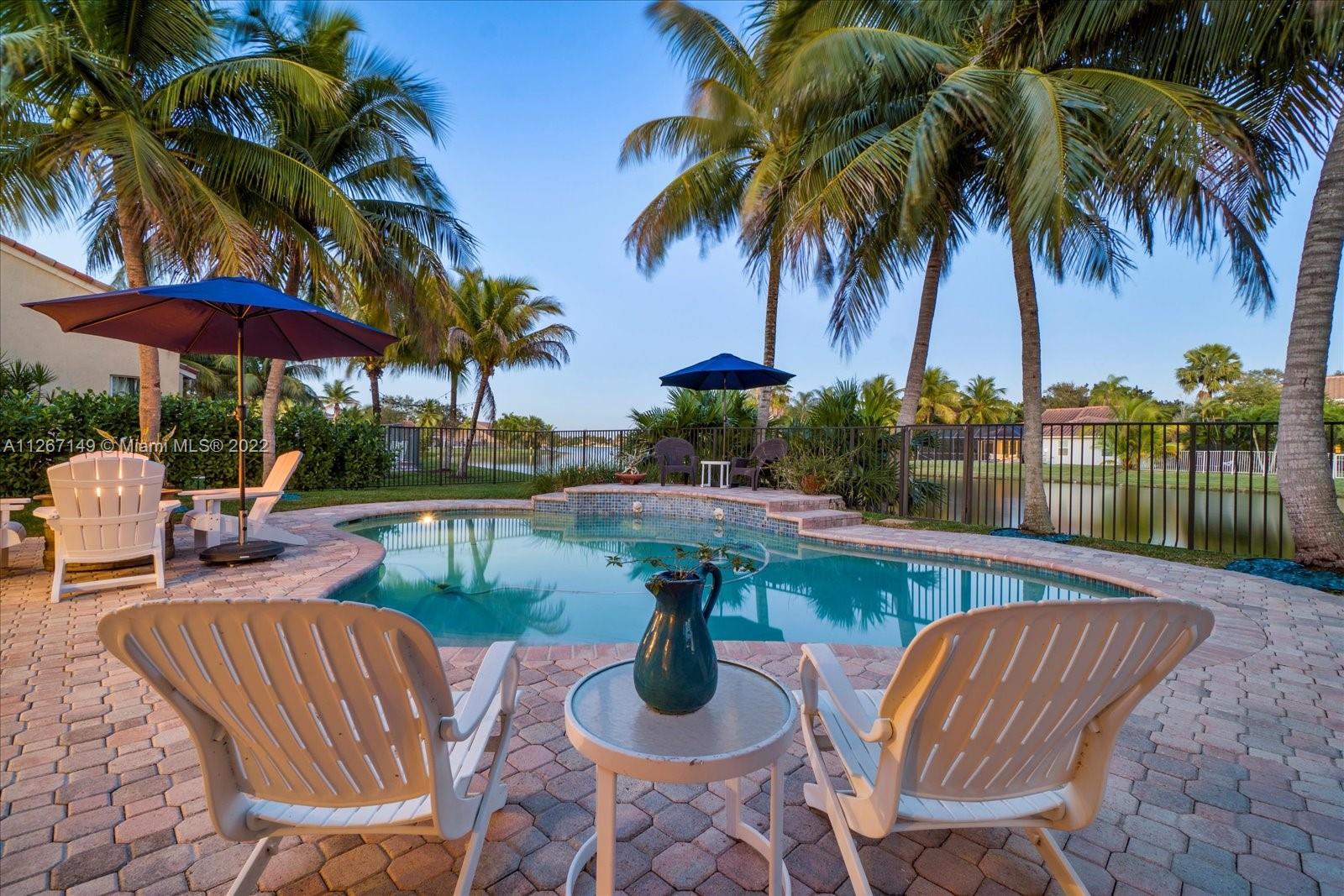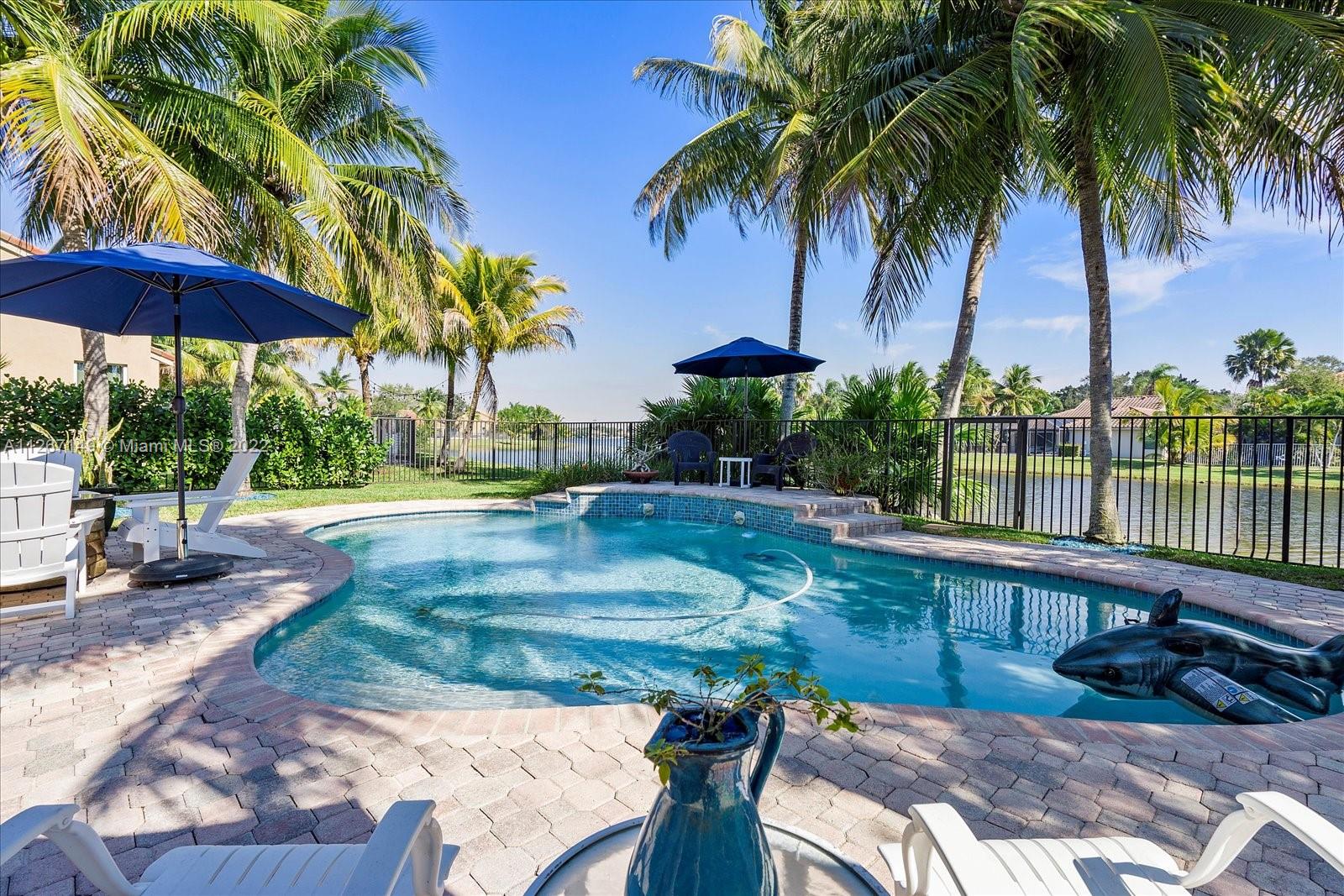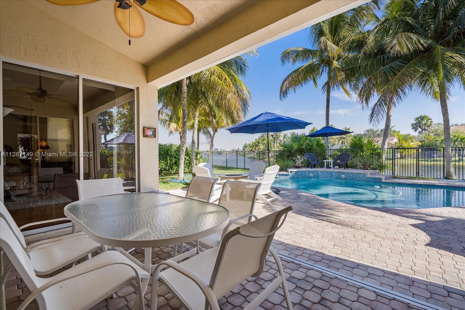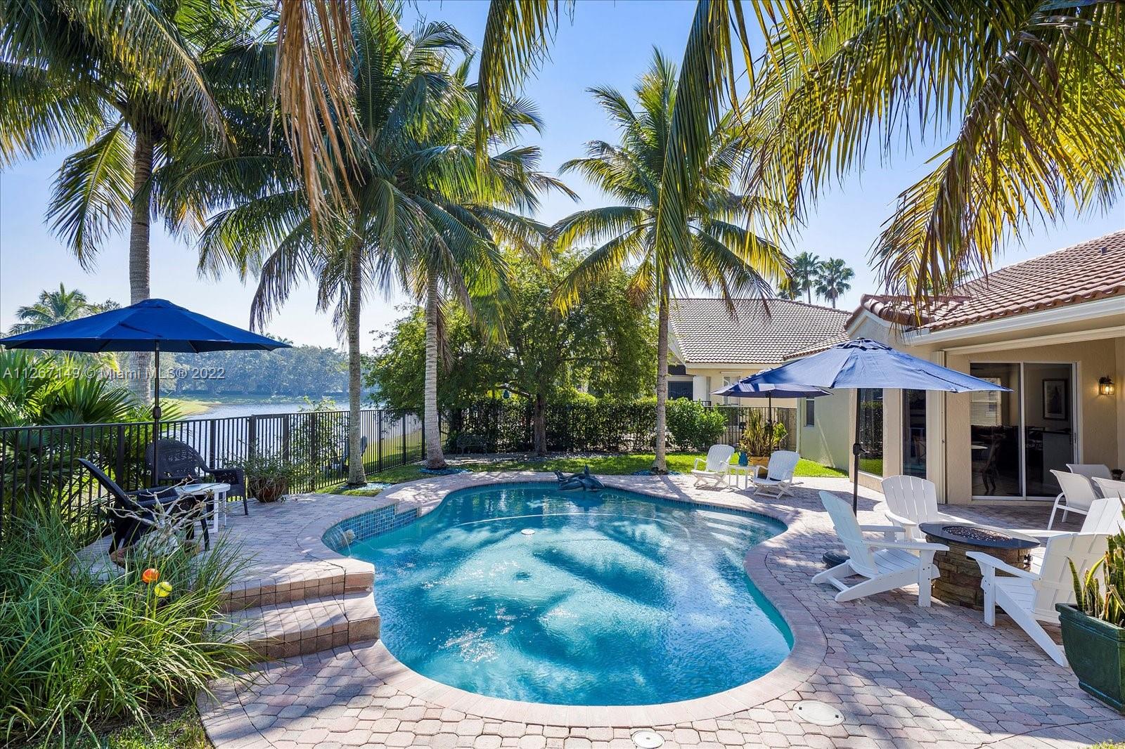 Enjoy the stunning view from this 4 bedroom 2.5 bath home in The Lakes! This home features a split floor plan with a HUGE primary bedroom and tons of closet space. Sliders from the bedroom showcase the newer diamond brite pool with waterfall and the shaded park-like sitting area. There is an open kitchen/family room with formal living and dining rooms. The roof is less than a year old and so is the new AC. Bamboo flooring is only 3 years old!
