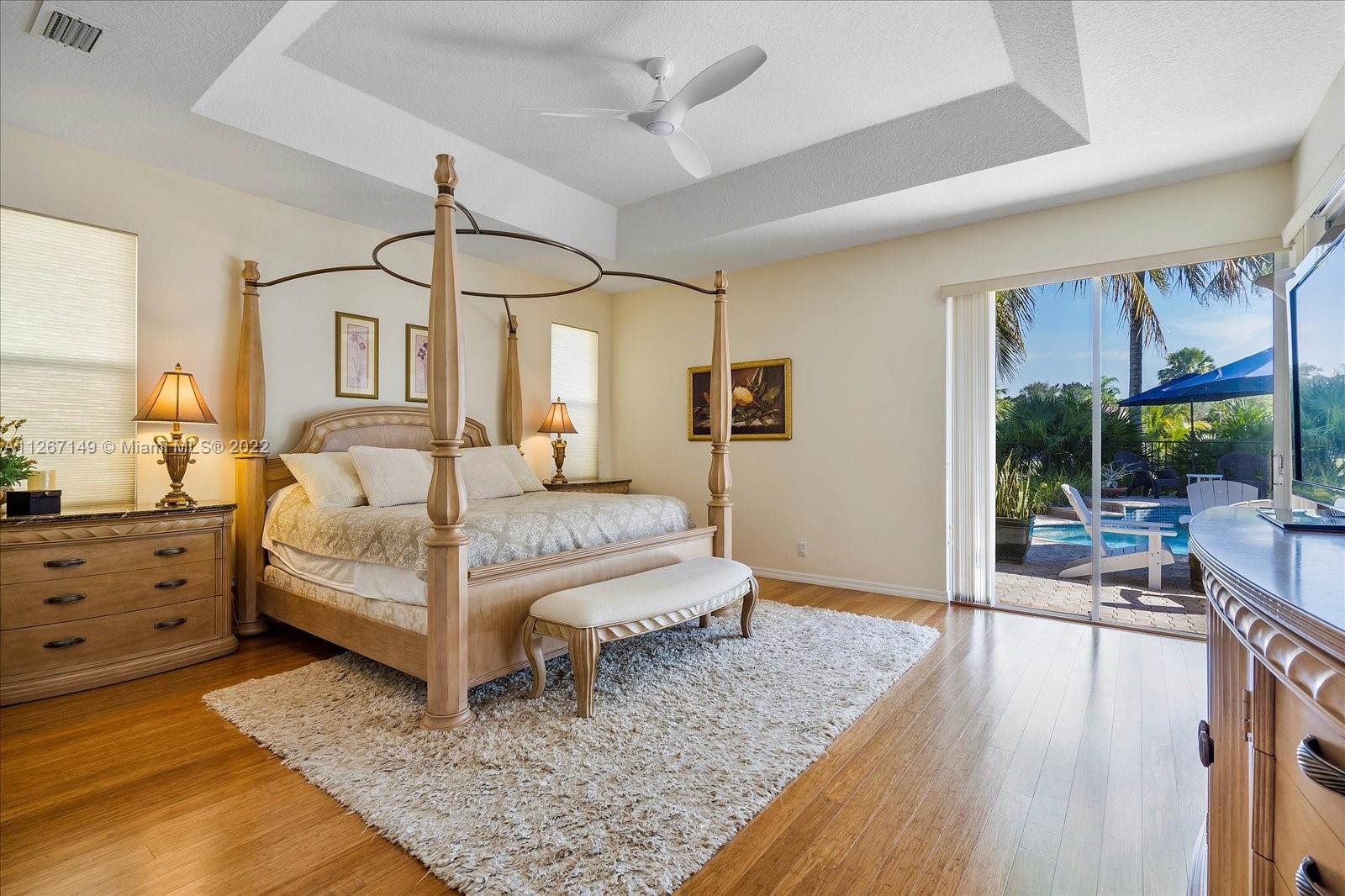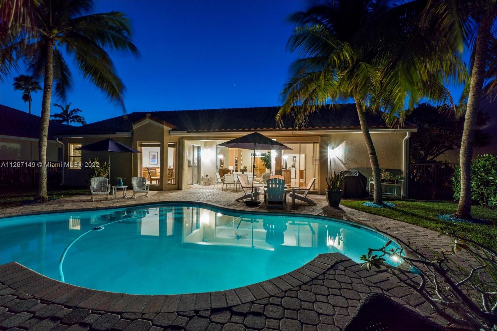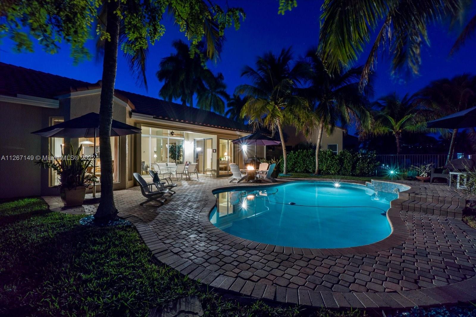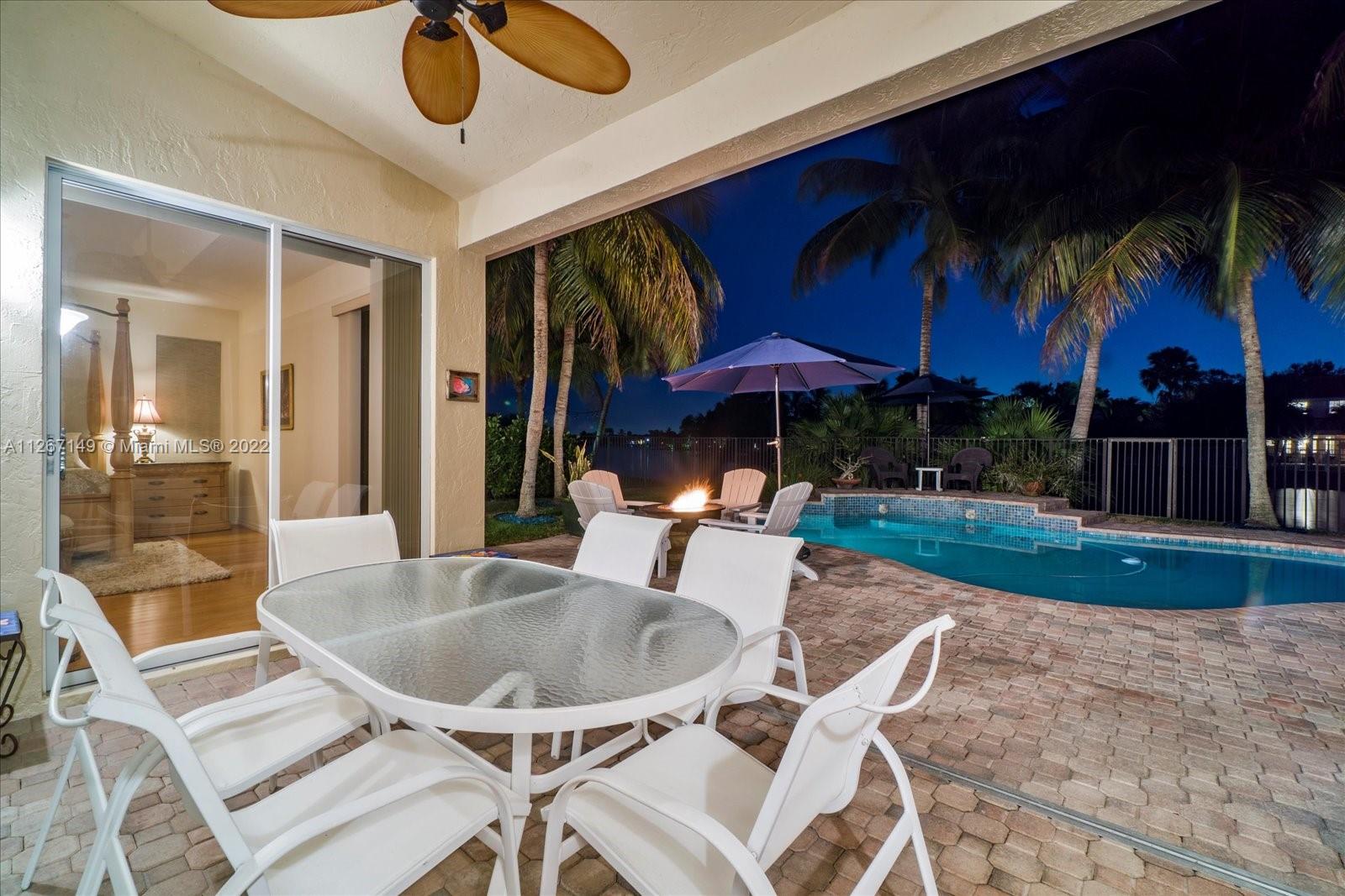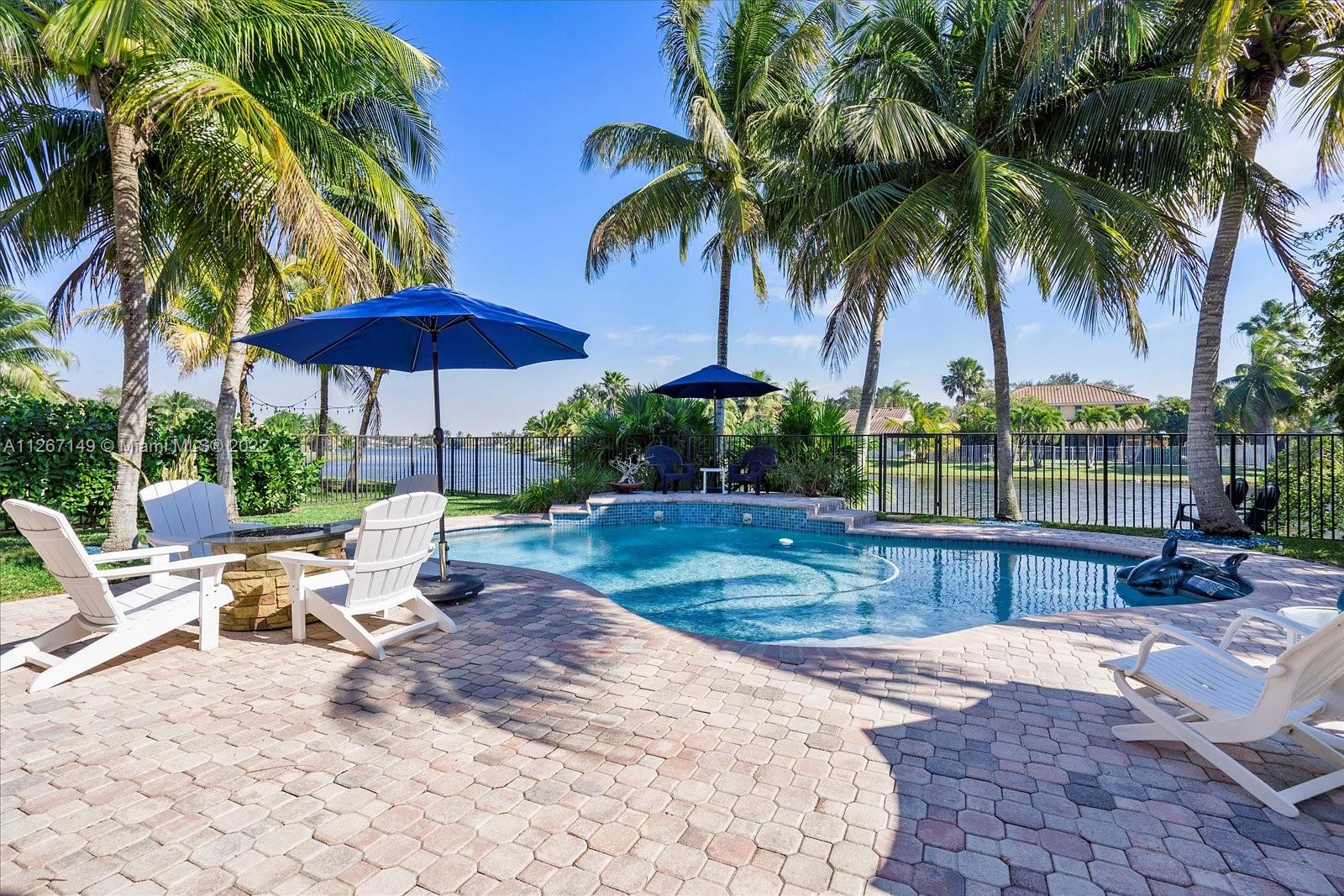 Enjoy the stunning view from this 4 bedroom 2.5 bath home in The Lakes! This home features a split floor plan with a HUGE primary bedroom and tons of closet space. Sliders from the bedroom showcase the newer diamond brite pool with waterfall and the shaded park-like sitting area. There is an open kitchen/family room with formal living and dining rooms. The roof is less than a year old and so is the new AC. Bamboo flooring is only 3 years old!