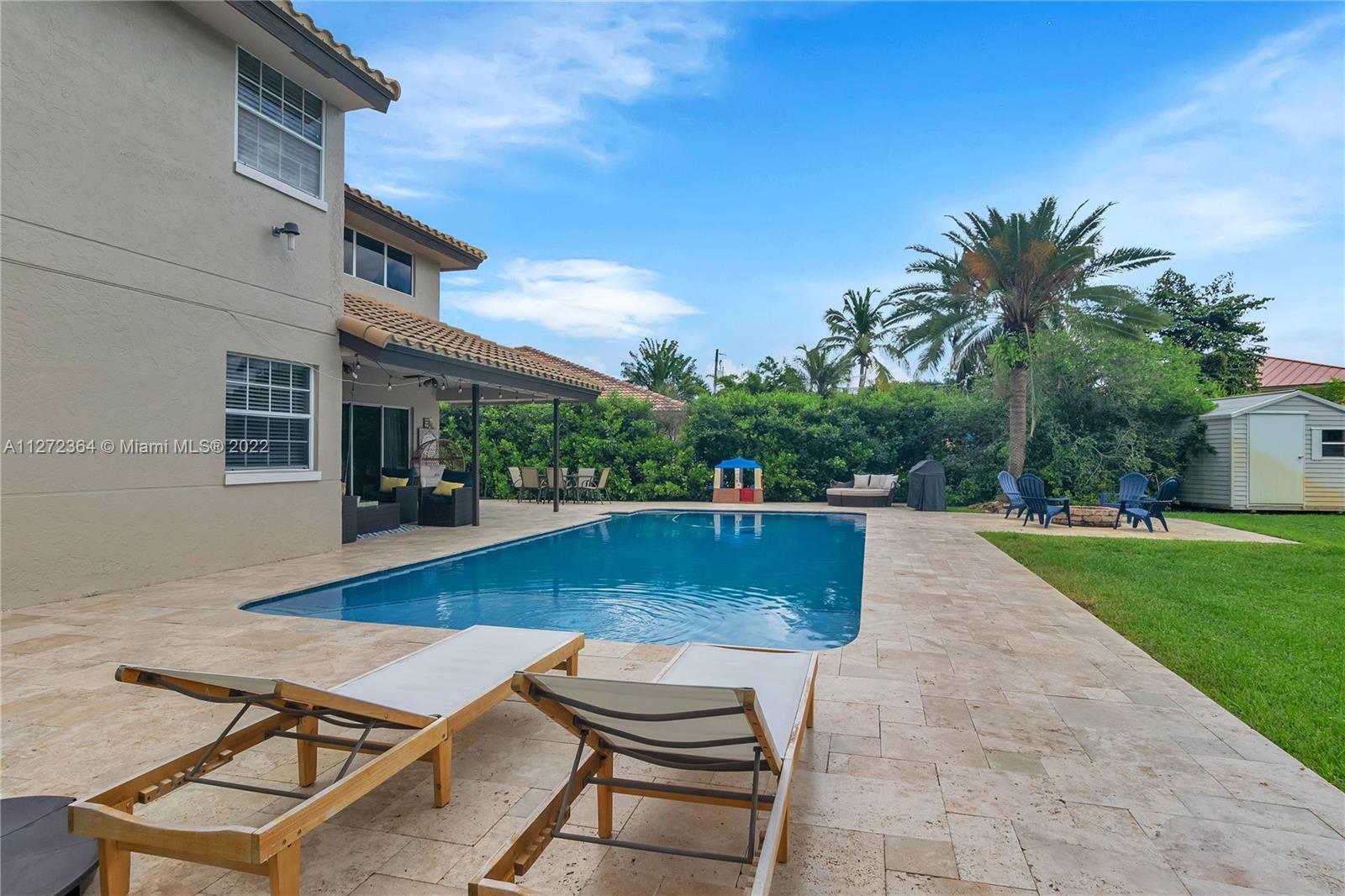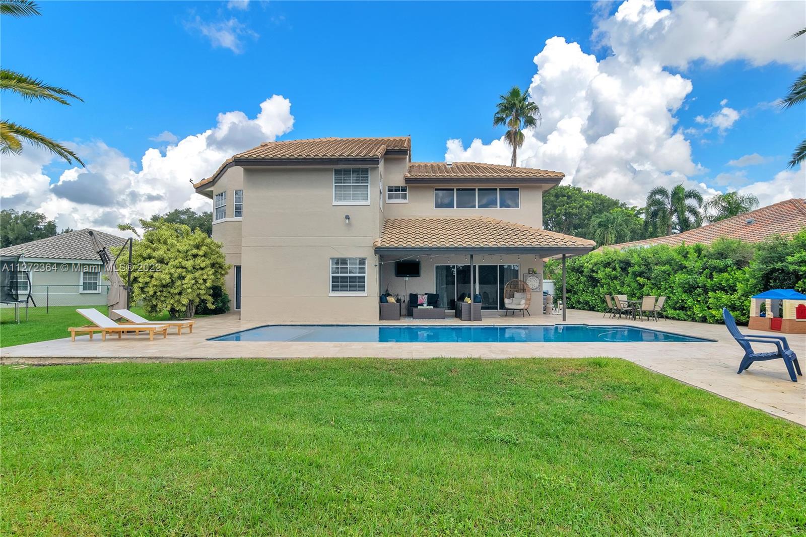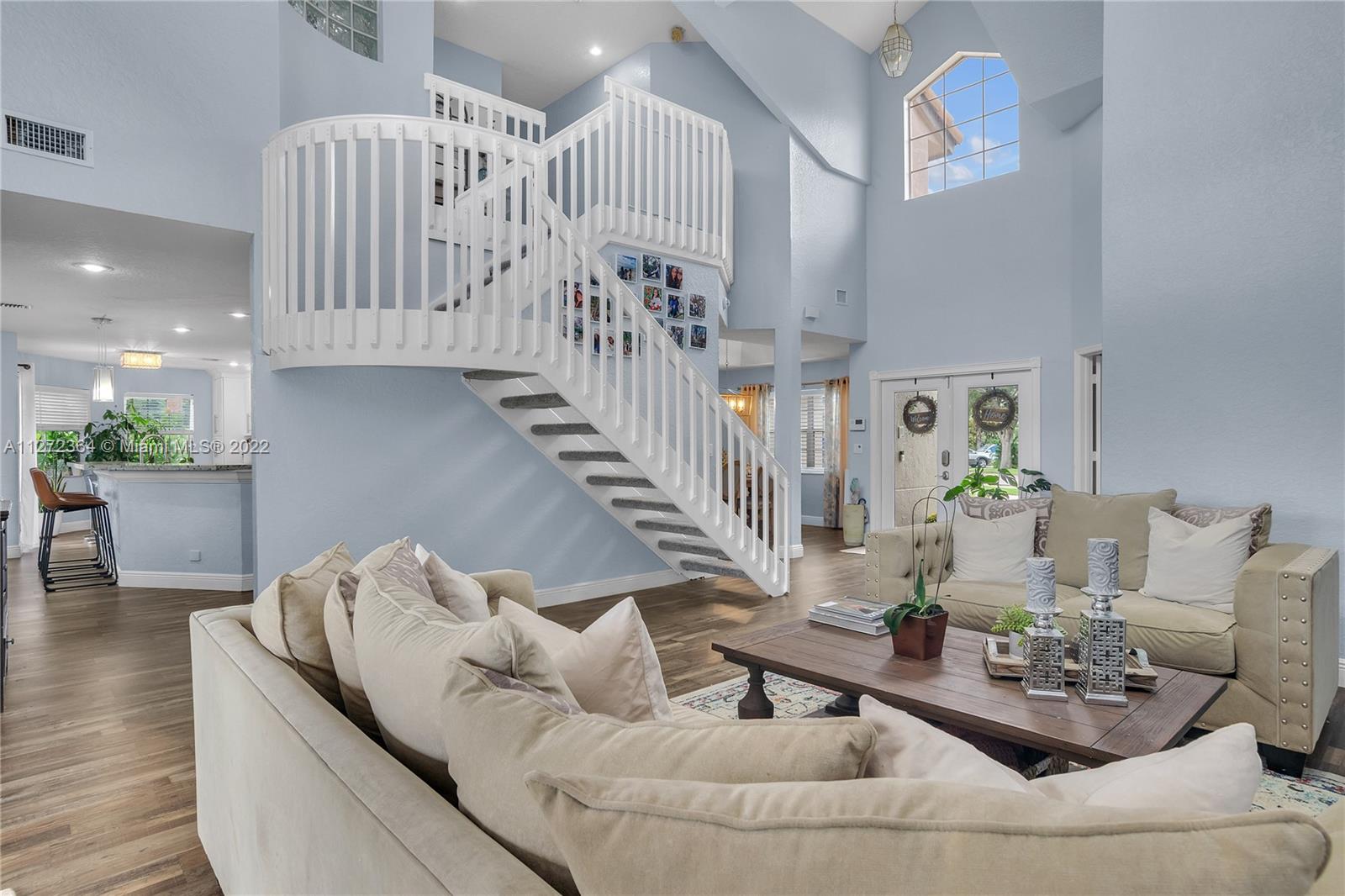 This gorgeous 2 story home in the hidden community of Stirling Village, offers all the modern design elements expected in a completely remodeled home. With dramatic vaulted ceilings, plenty of natural light, a grand staircase & engineered vinyl plank floors throughout. The spacious kitchen, remodeled in 2018 along with the 3 bathrooms, was designed for entertaining with an abundance of storage. 1 bedroom & bath downstairs; upstairs find the master suite, remodeled in 2021 featuring separate vanities and a glamorous freestanding tub. All bedrooms offer closet organization systems. The expansive corner lot boasts a sparkling salt water pool, resurfaced in 2019 with travertine pavers & a double wide gate perfect for boat access. The heart of Cooper City, surrounded by A rated schools. NO HOA!