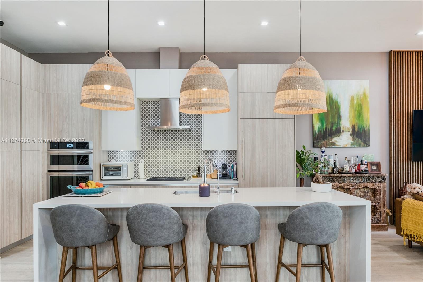 One of a kind single home upgraded with exquisite taste in Downtown Doral. This immaculate home features 3 bed + den 3.5 bath with upgrades such as waterproof wood looking laminate flooring throughout, LED recessed lighting, custom stairs. Kitchen has gas cooktop, Italian tall cabinets, upgraded backsplash, waterfall island, and top of the line Jennair appliances. Custom wood panels in living and Master Bedroom, Italian bathroom cabinets, Californian walking closets in all bedrooms and designer wall papers in main areas and mural in Master as well floor to ceiling linen curtains. Built in library in den area. Impact windows. New garage storage design with high graded epoxy floors. Association approved artificial turf in wrap around terrace with separate dinning, seating and play area